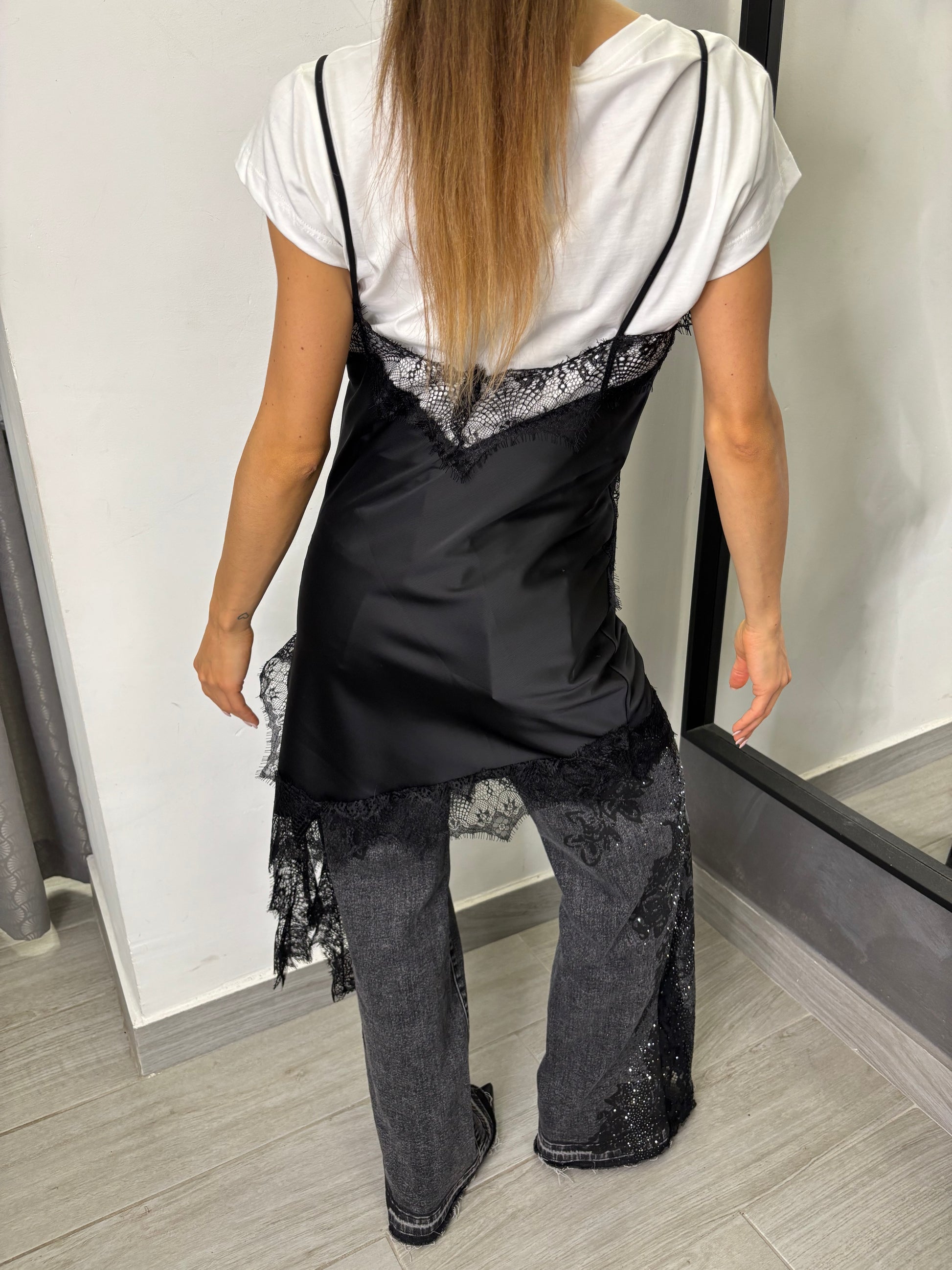 Abito in tessuto simil saten con inserti in pizzo. Taglia unica veste fino ad una 44. Composizione 100% poliestere