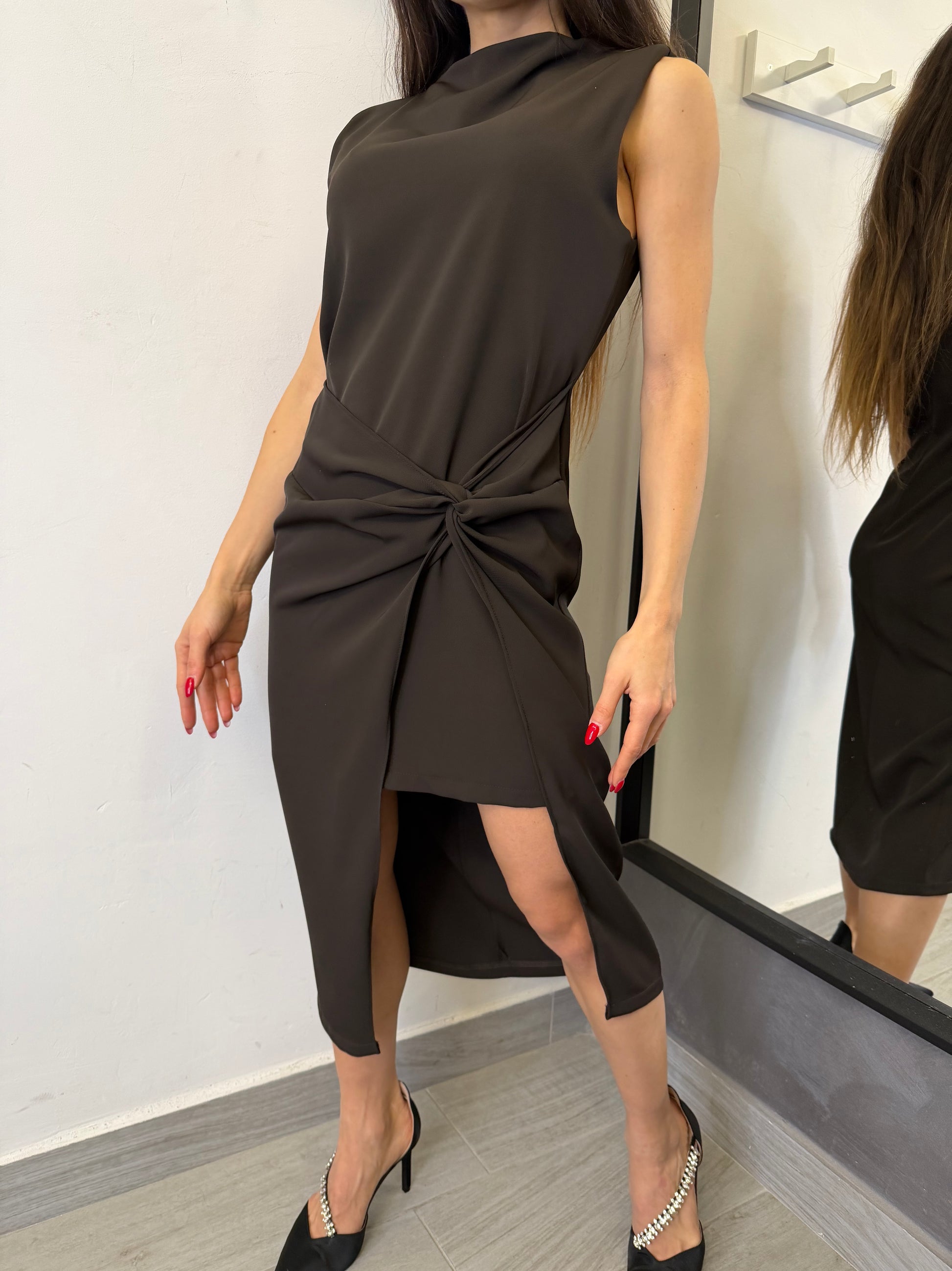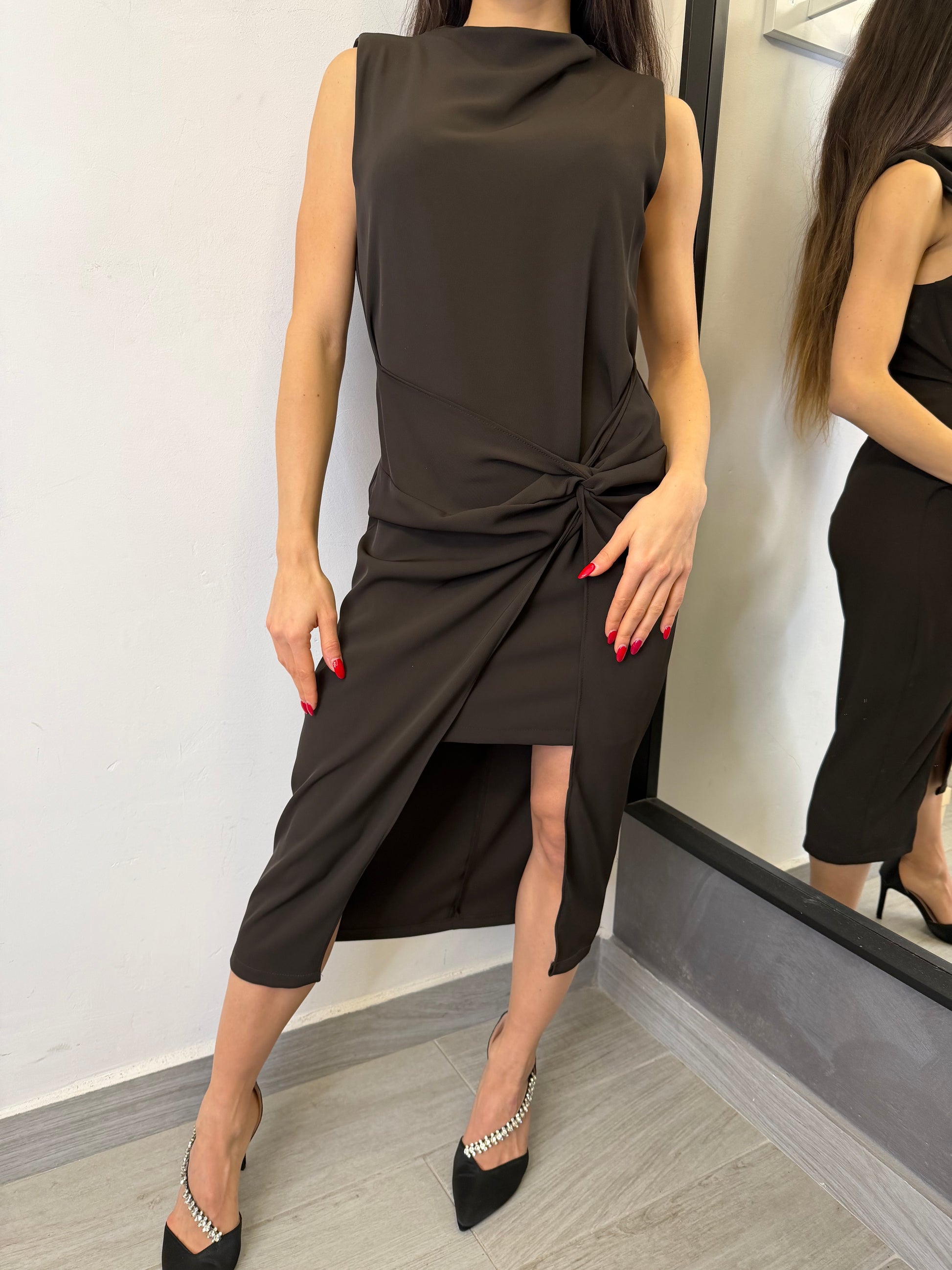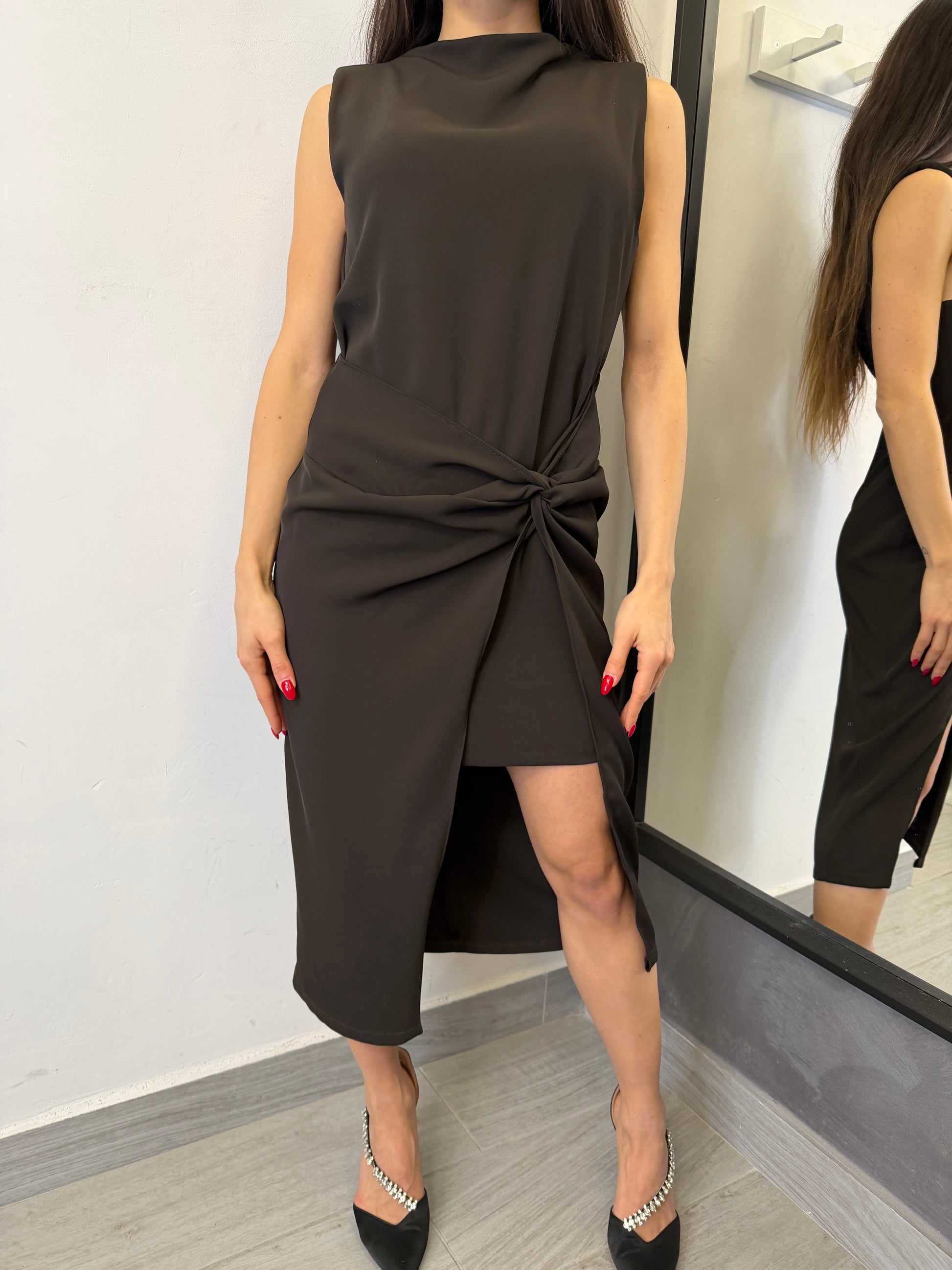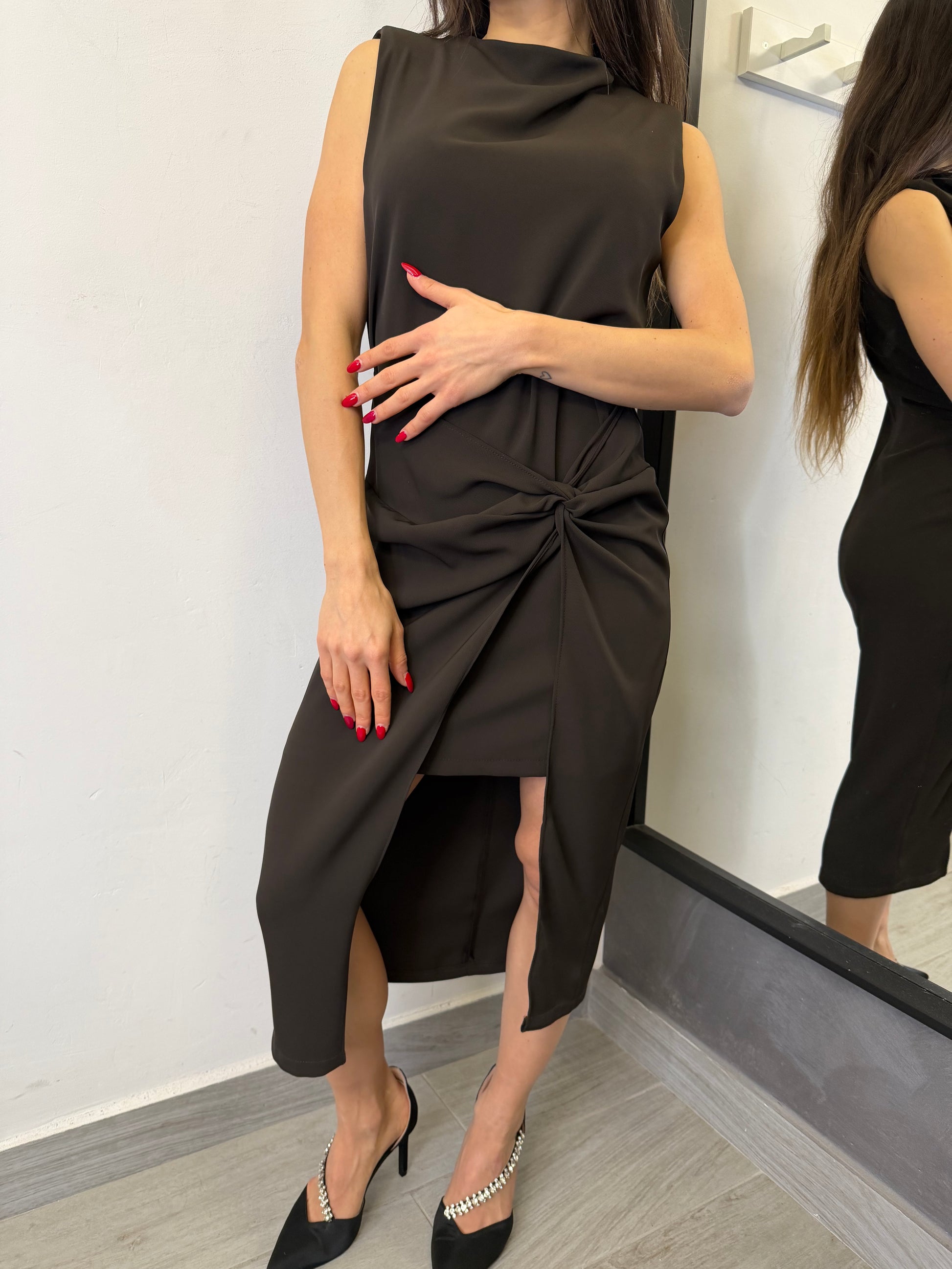 Abito lungo con gonna corta sotto, spalle imbottite e cerniera di chiusura sulla schiena ,giro manica e giro collo dettaglio nodo sulla parte sinistra . Composizione 97% poliestere 3% elastan