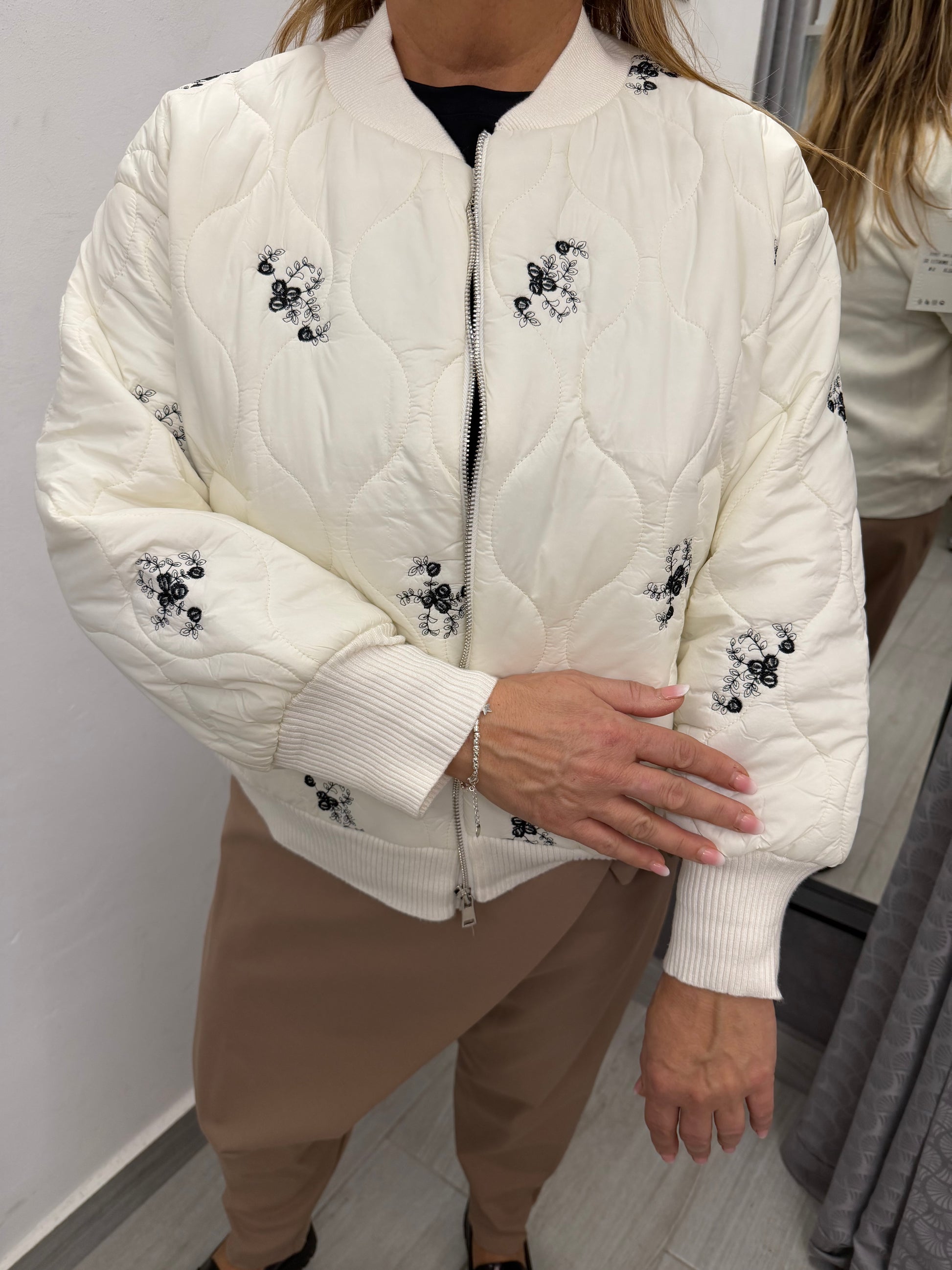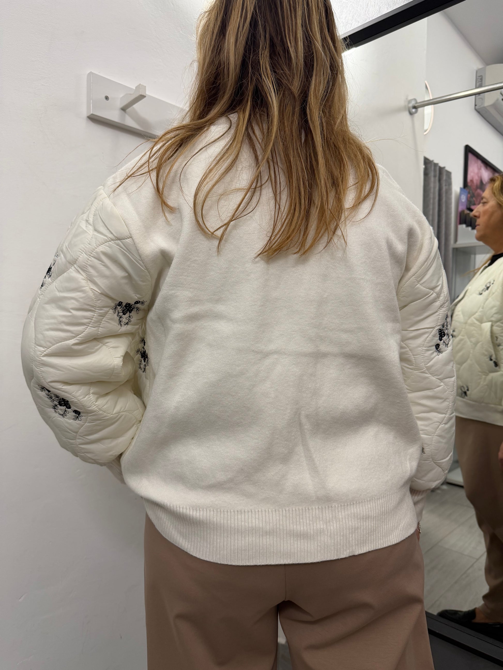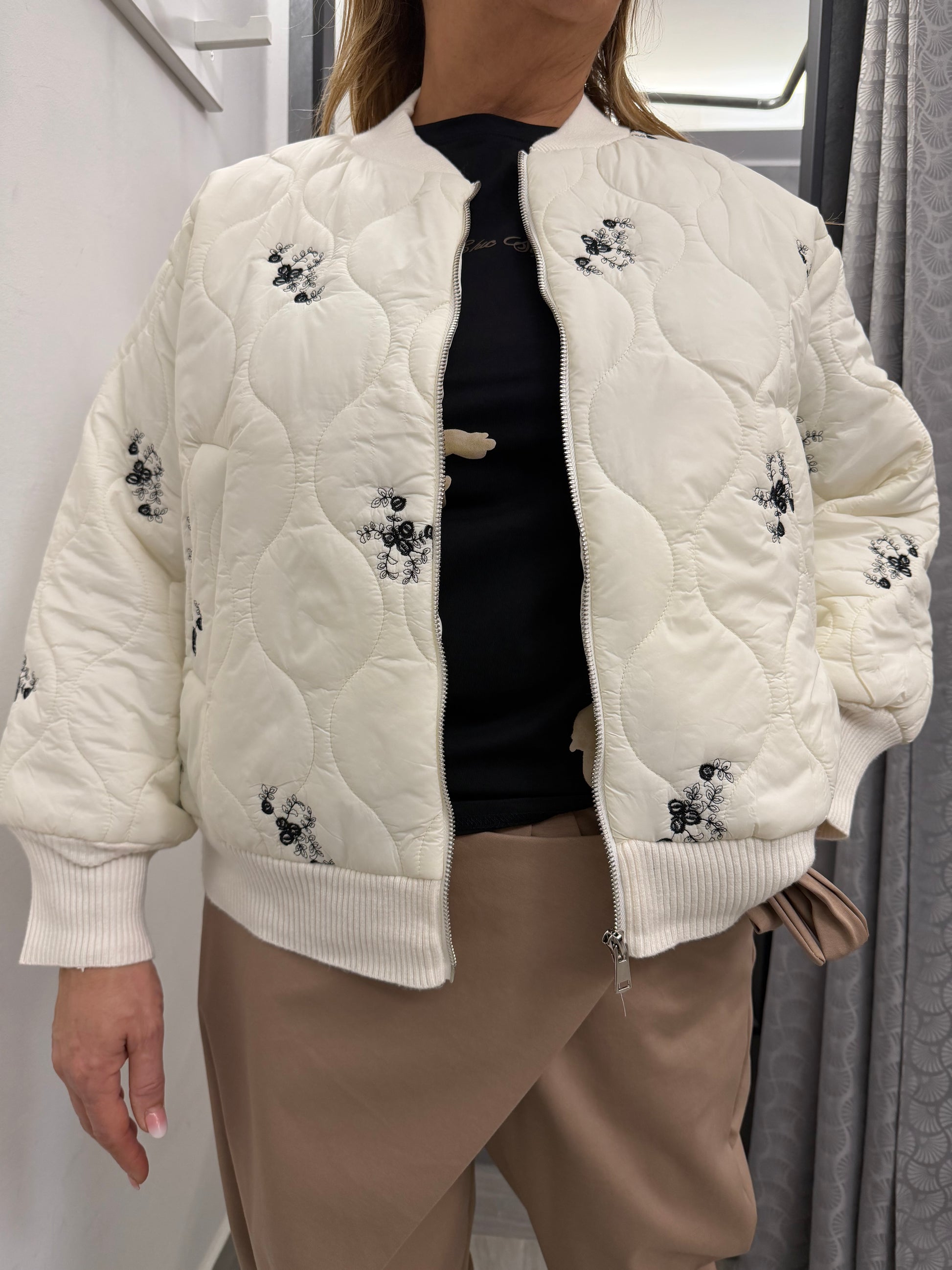 Giubbino modello bomber trapuntato sul davanti e in tessuto di maglia dietro. Abbottonatura con cerniera, tasche laterali e polsino e collo in maglia. Composizione 51% viscosa 39% poliammide 10% elastan.
