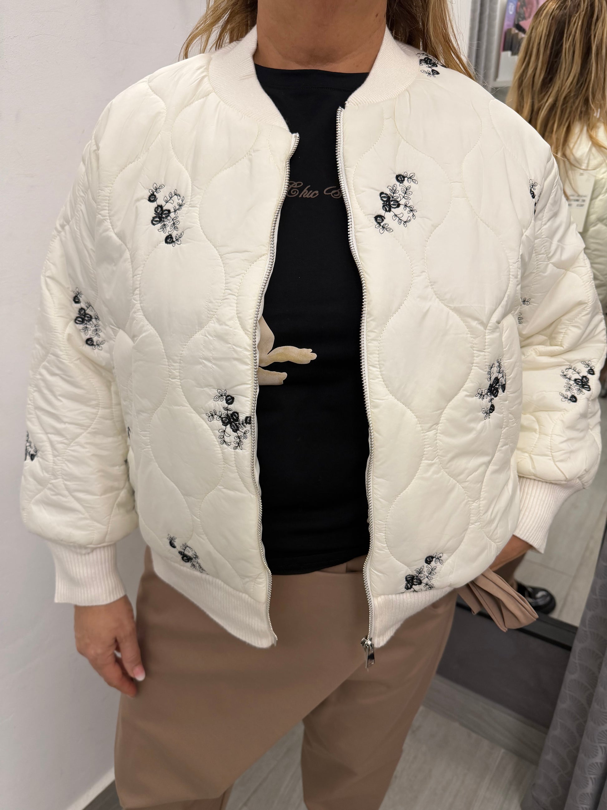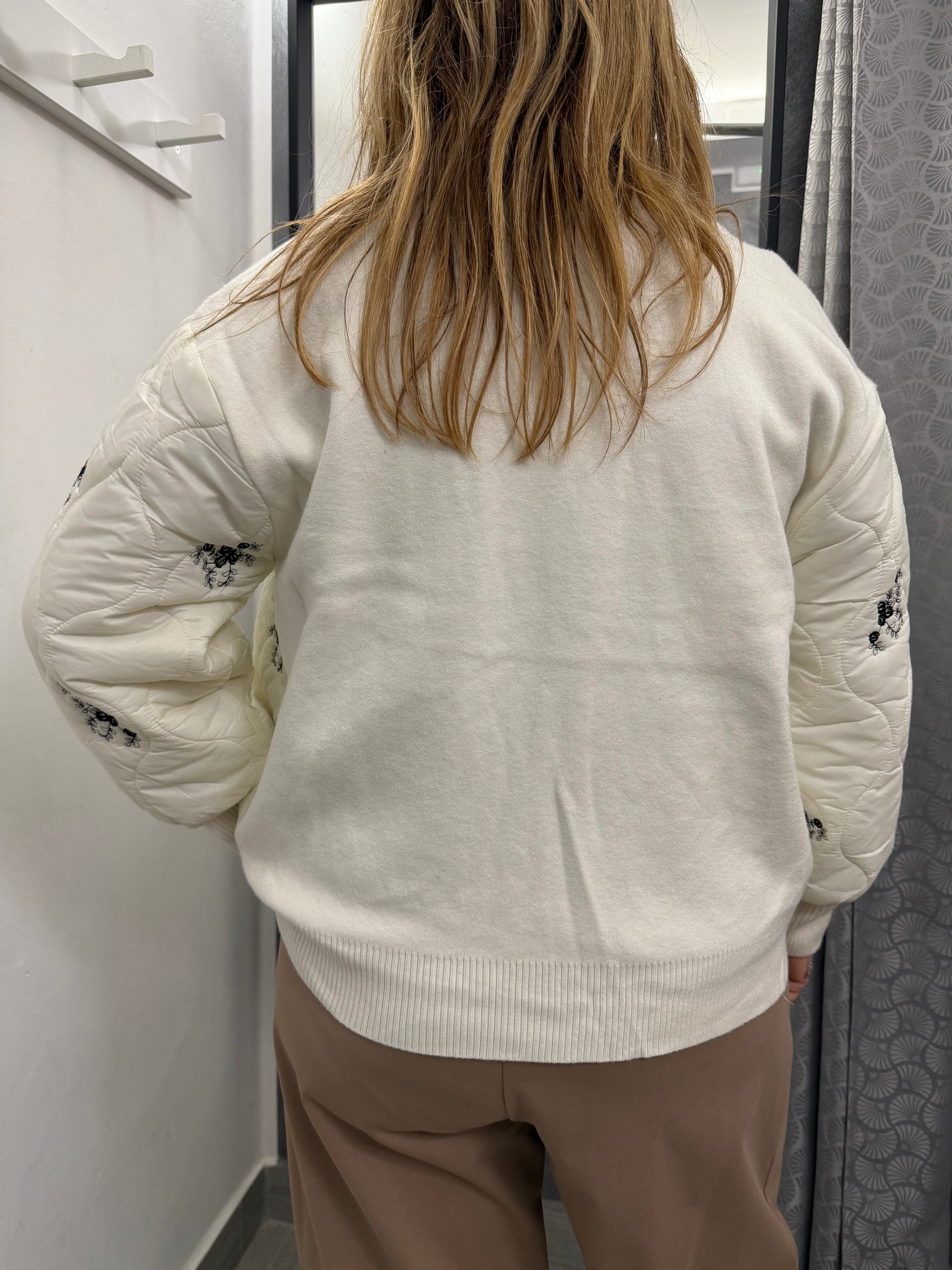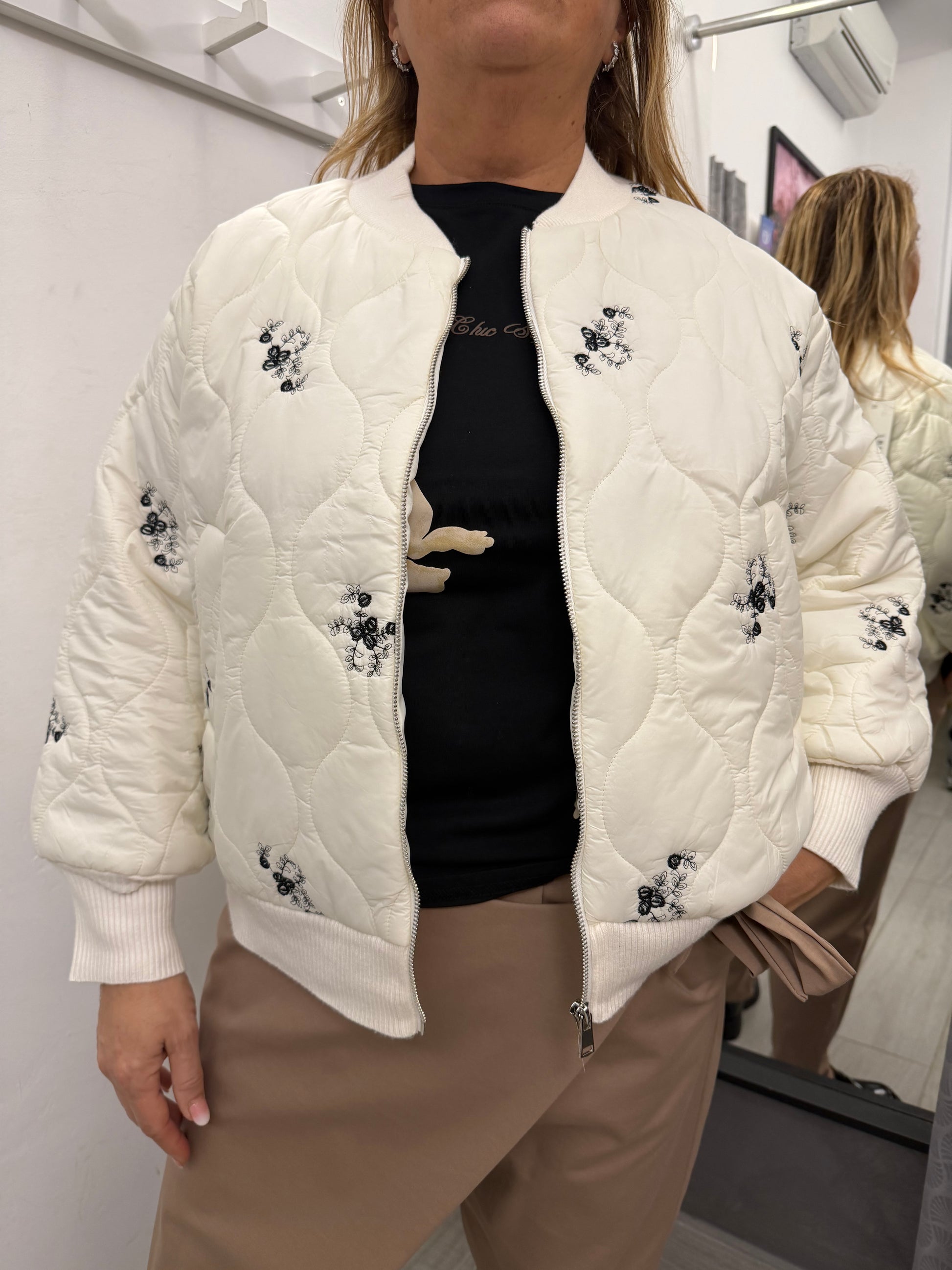 Giubbino modello bomber trapuntato sul davanti e in tessuto di maglia dietro. Abbottonatura con cerniera, tasche laterali e polsino e collo in maglia. Composizione 51% viscosa 39% poliammide 10% elastan.