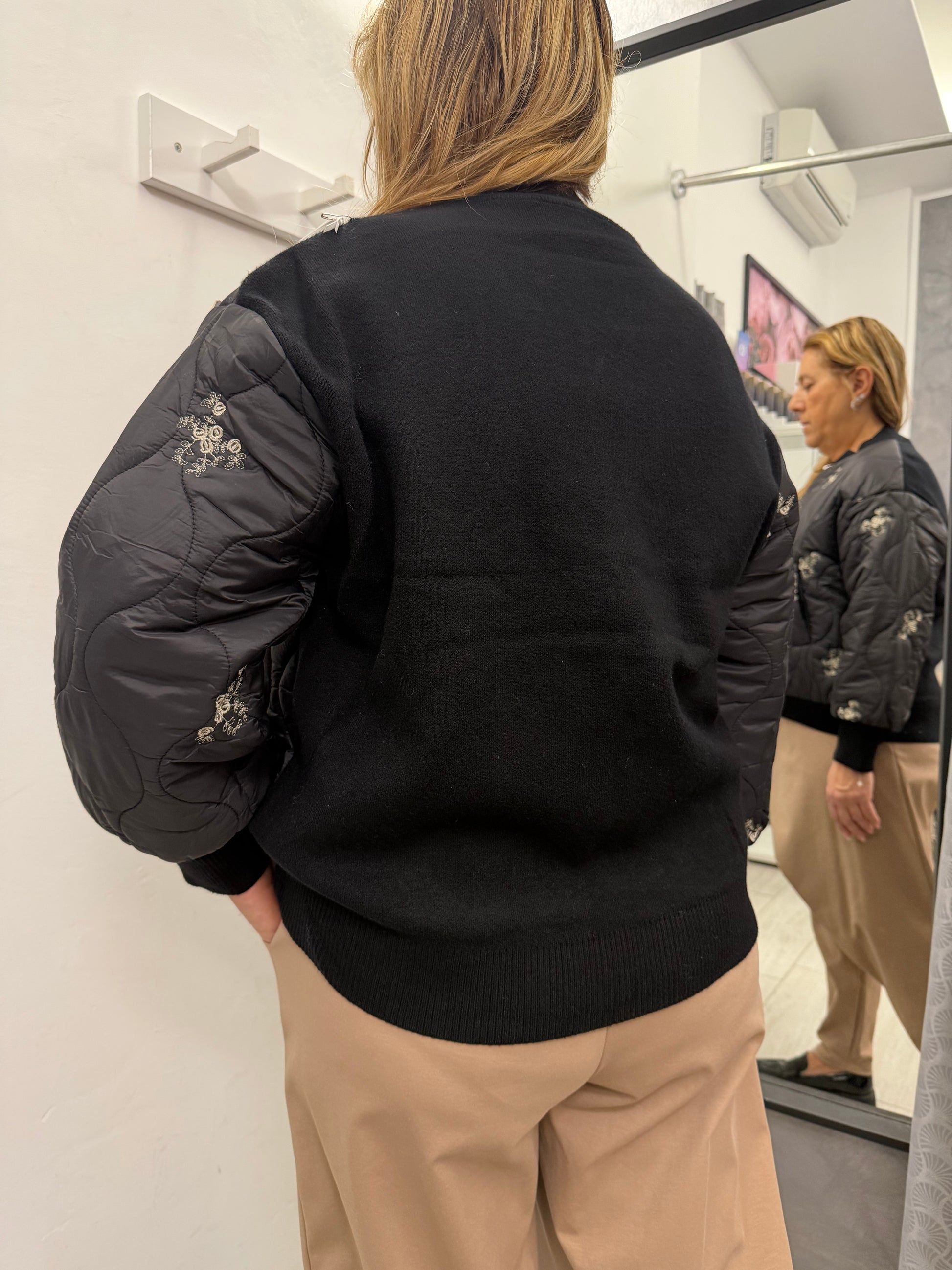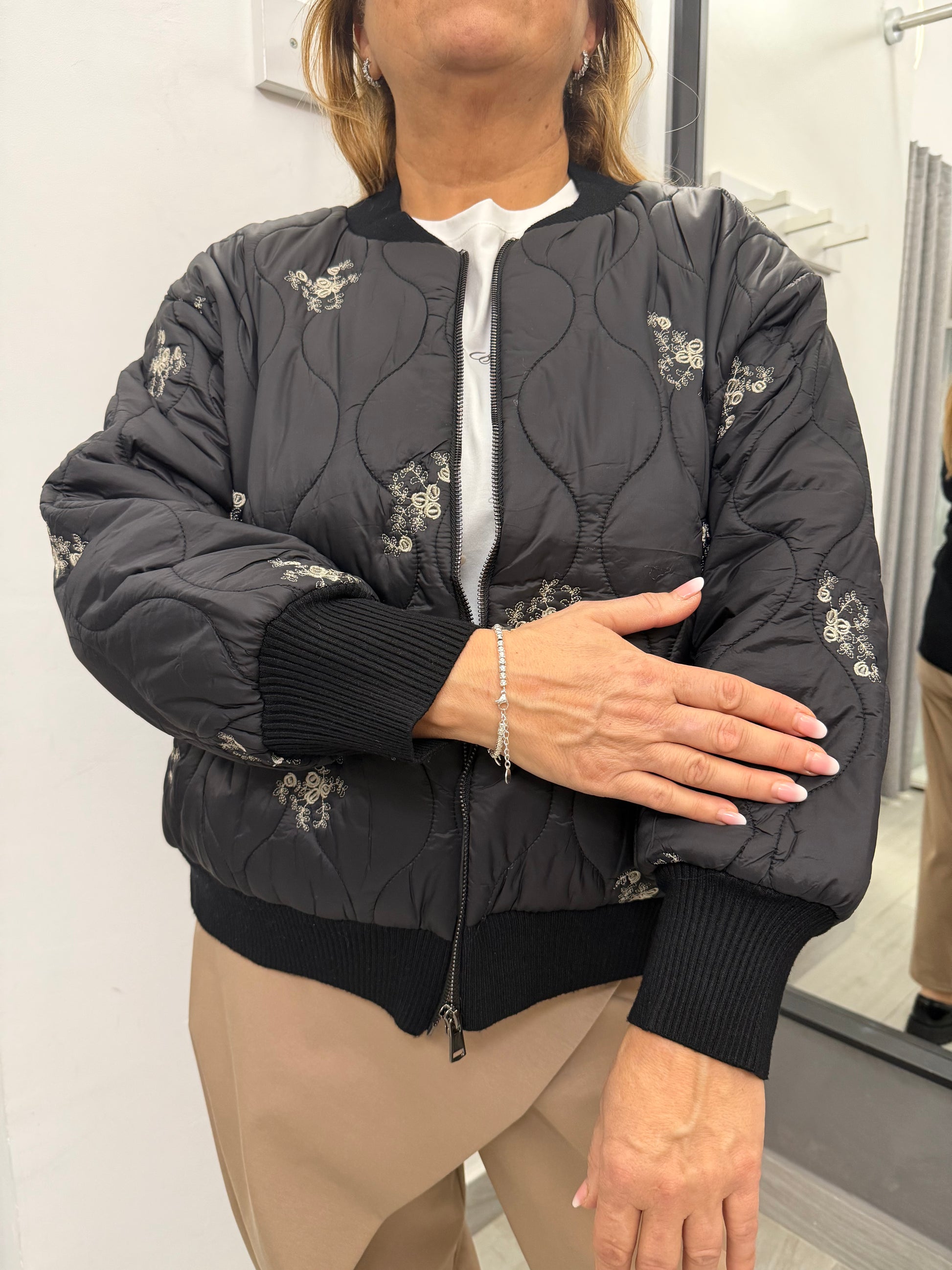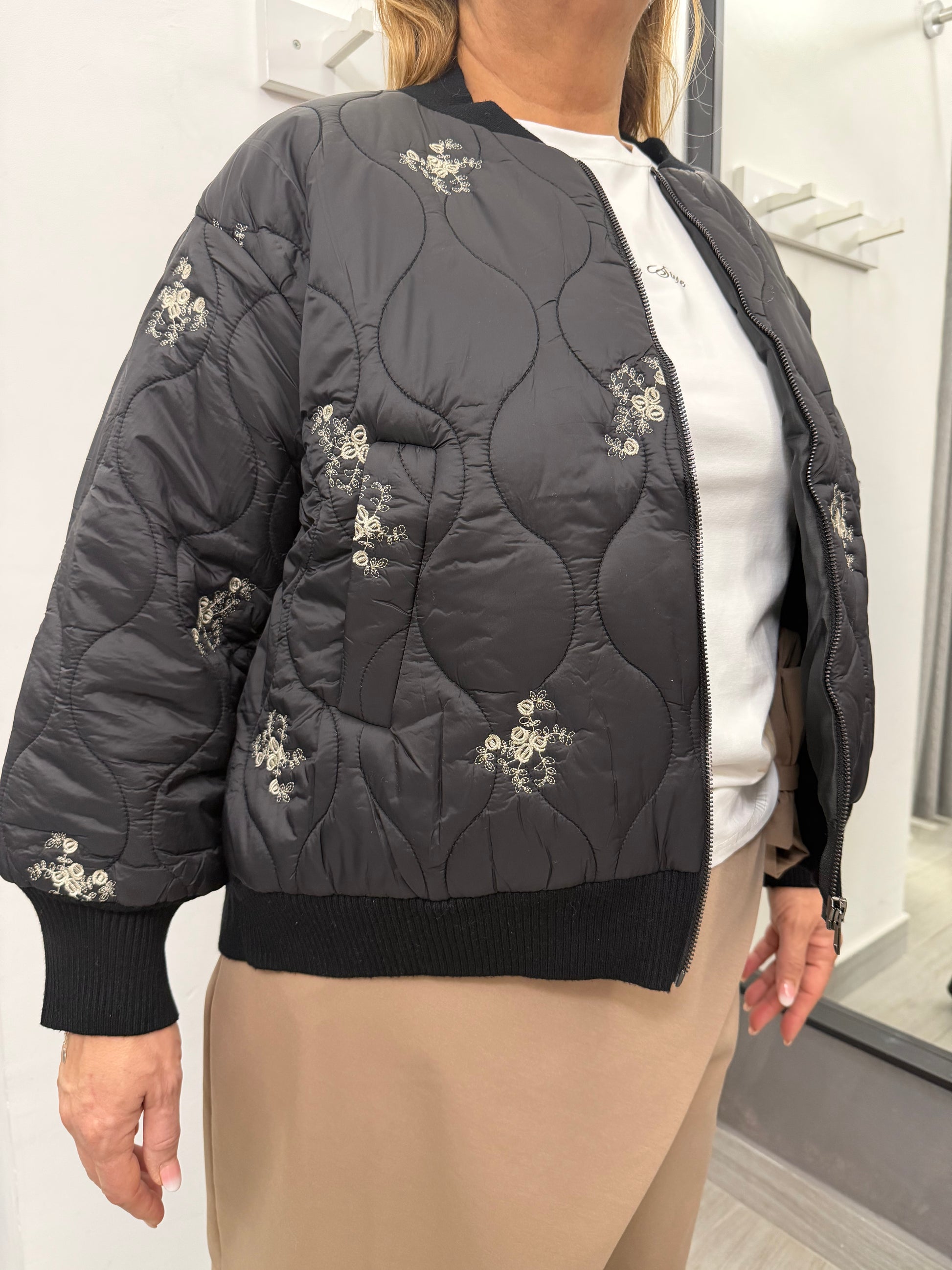 Giubbino modello bomber trapuntato sul davanti e in tessuto di maglia dietro. Abbottonatura con cerniera, tasche laterali e polsino e collo in maglia. Composizione 51% viscosa 39% poliammide 10% elastan.