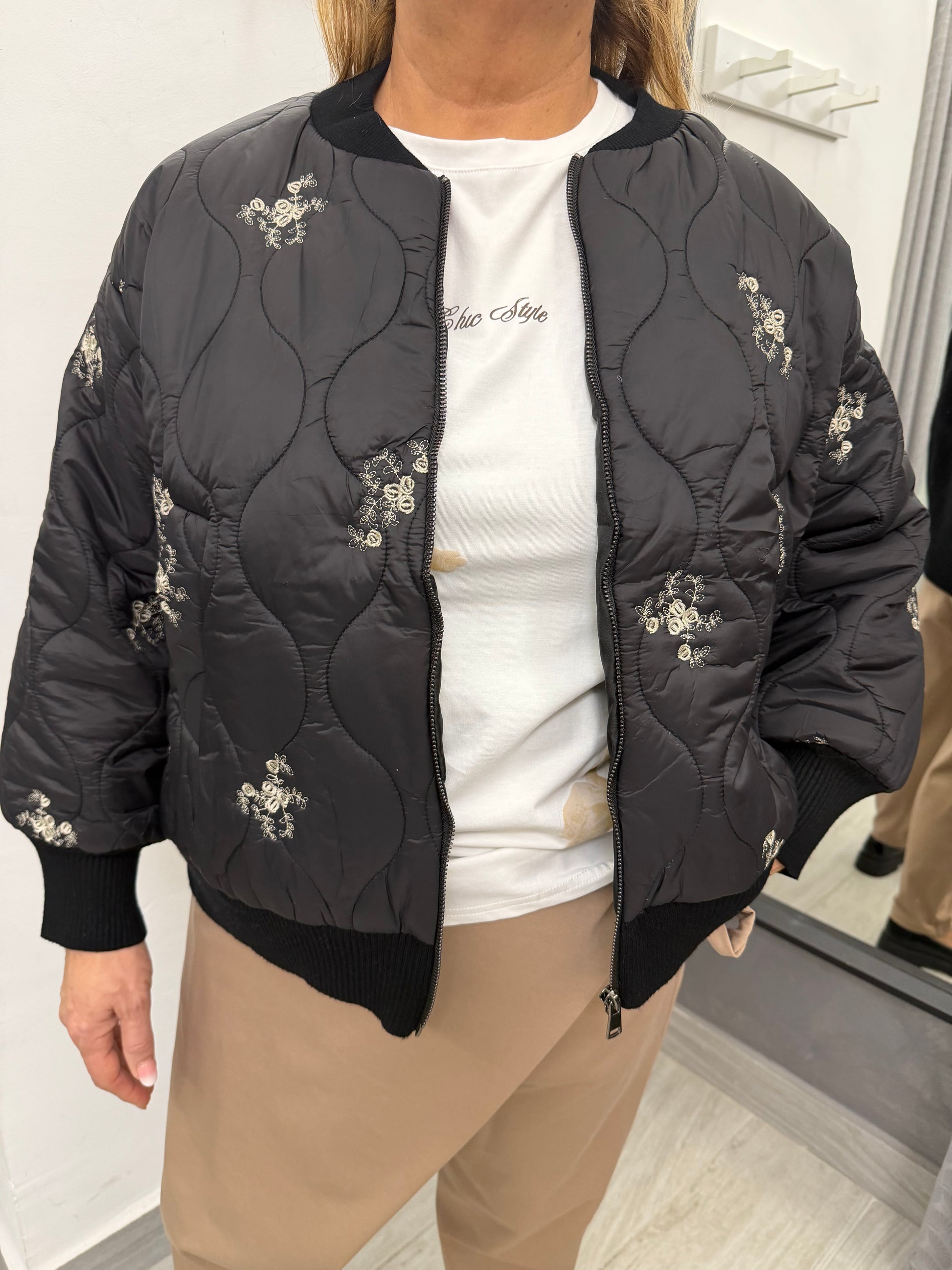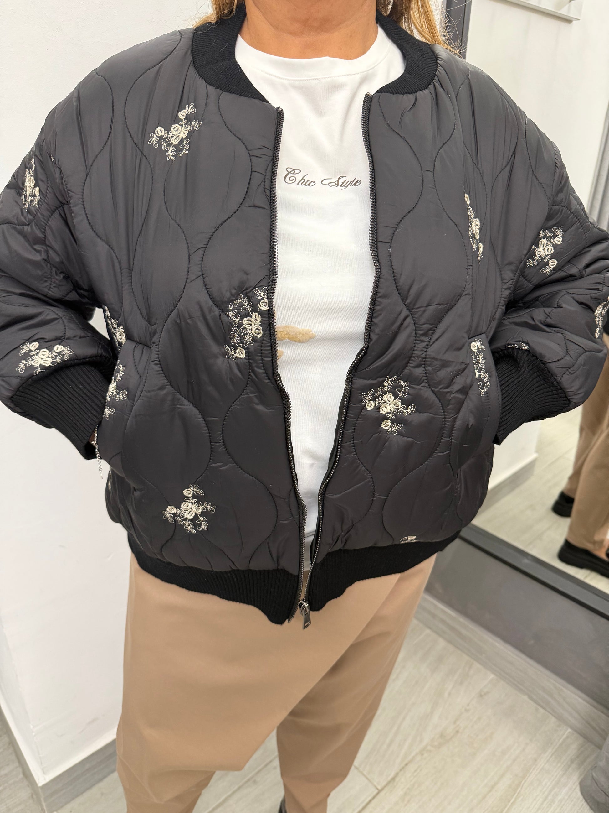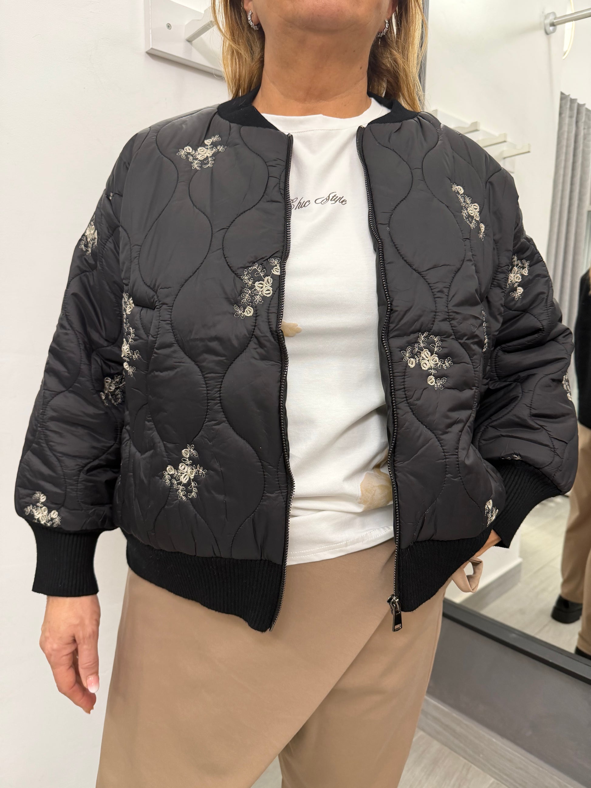 Giubbino modello bomber trapuntato sul davanti e in tessuto di maglia dietro. Abbottonatura con cerniera, tasche laterali e polsino e collo in maglia. Composizione 51% viscosa 39% poliammide 10% elastan.