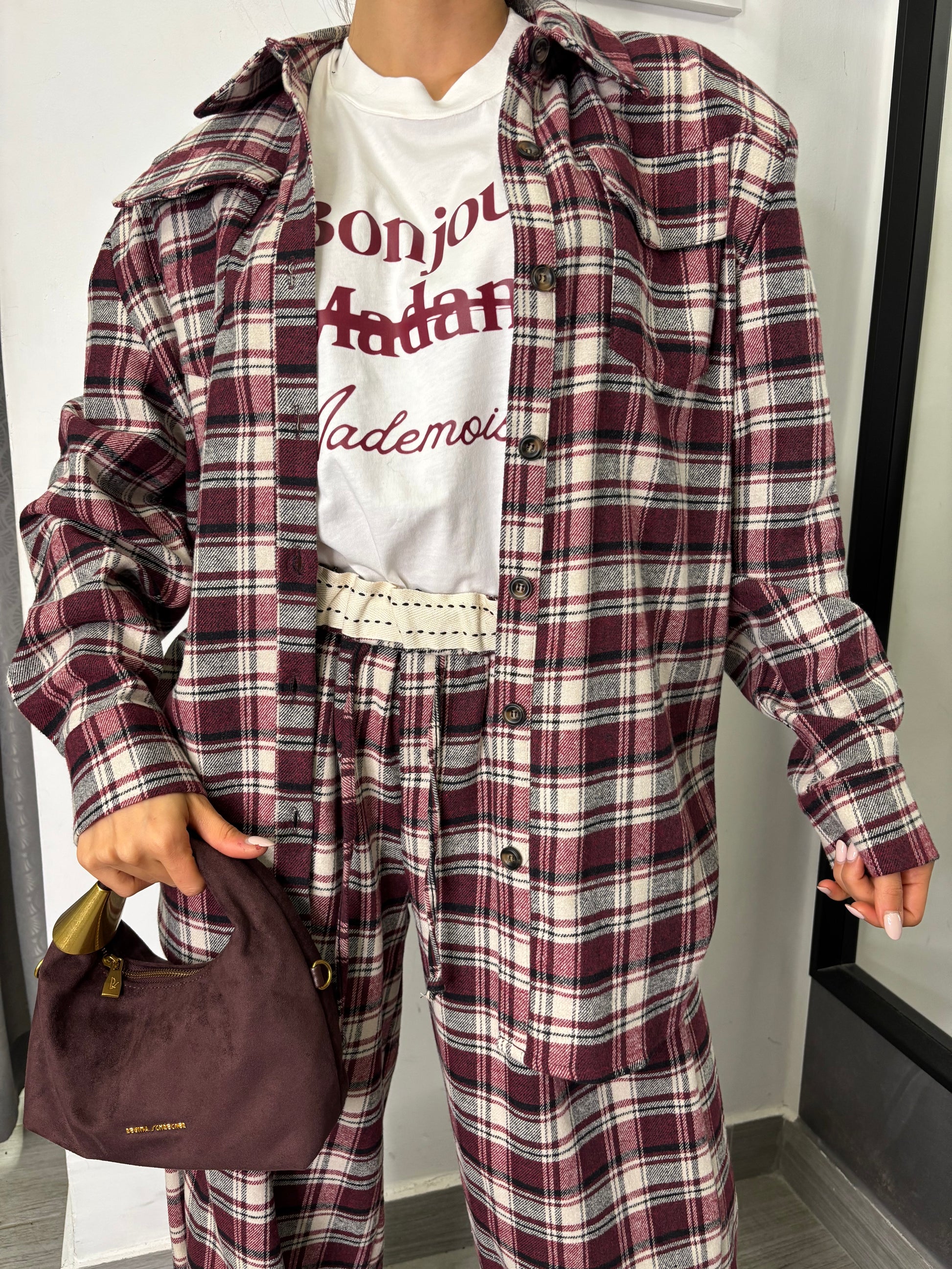 Camicia a quadri modello oversize, imbottitura sulle spalle, abbottonatura frontale con bottoni e tasche applicate. Composizione 70% cotone 30% poliestere