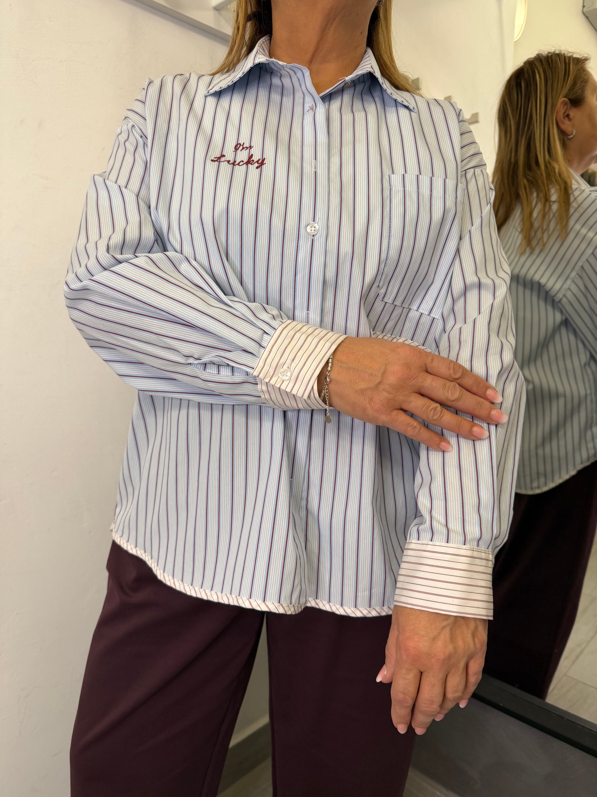 Camicia a righe vertice bianca, azzurra e burgundi , abbottonatura frontale, taschino sulla parte sinistra e scritta ricamata in burgundi sulla parte destra. Manica lunga con polsini a righe orizzontali bianca e burgundi Taglia unica veste fino ad una taglia 48. Composizione 69% cotone 28% poliammide 3% elastan.