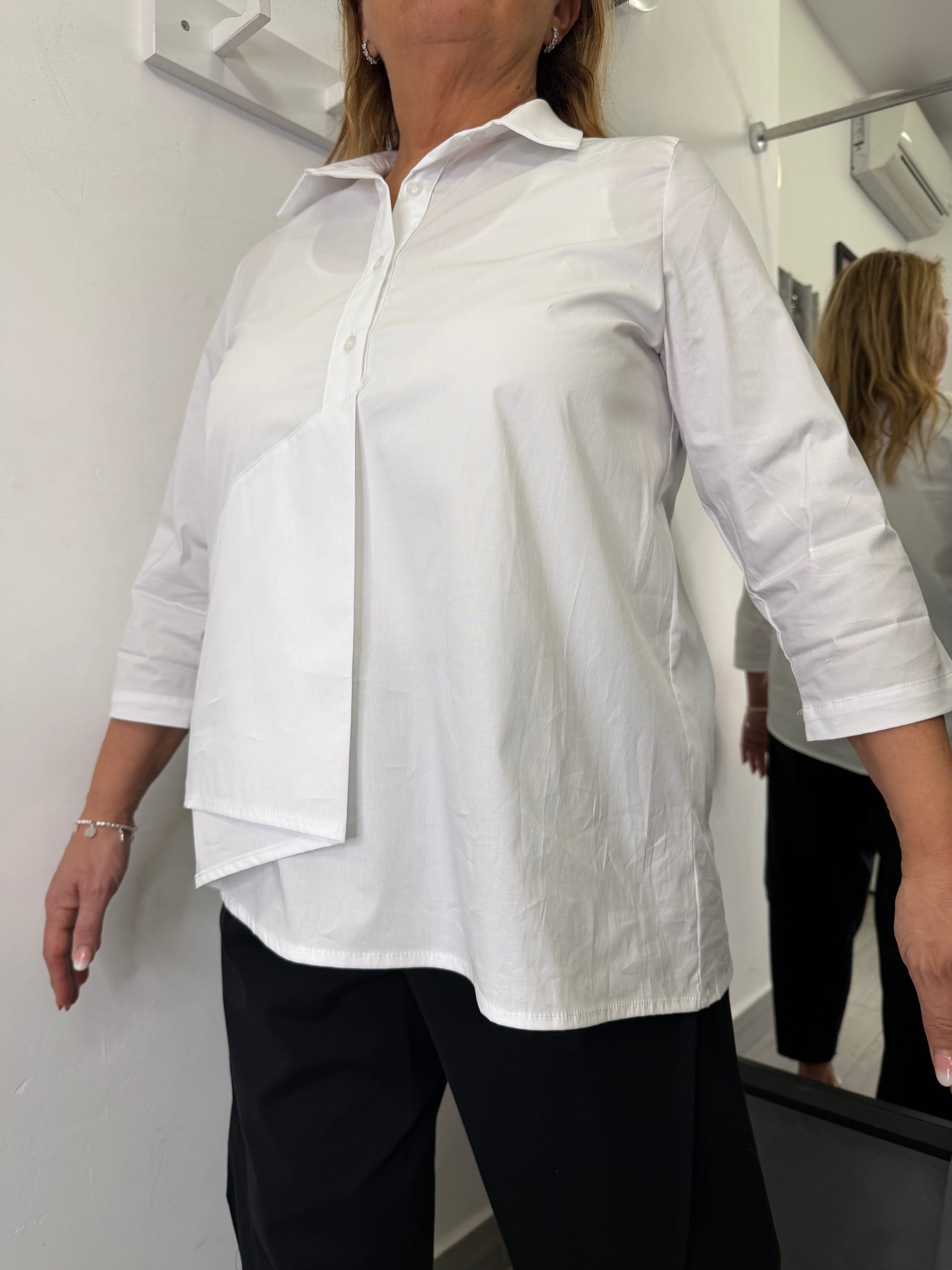 Camicia abbottonatura con 4 bottoni, colletto, manica 3/4, piega sulla parte destra e più lunga sulla parte sinistra. Dettaglio piega sulla schiena. Taglia unica veste fino ad una 46 . Composizione 98% cotone 2% elastan