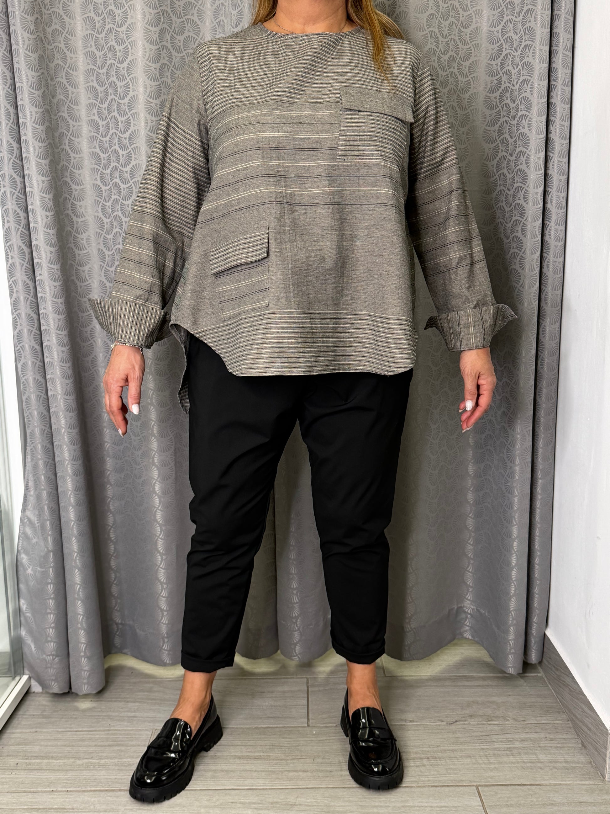 Camicia a righe orizzontali, modello oversize, giro collo, manica lunga con polsino. Tasche applicate sul davanti. Taglia unica veste fino ad una 48. Composizione 53% poliestere 42% cotone 5% Lino