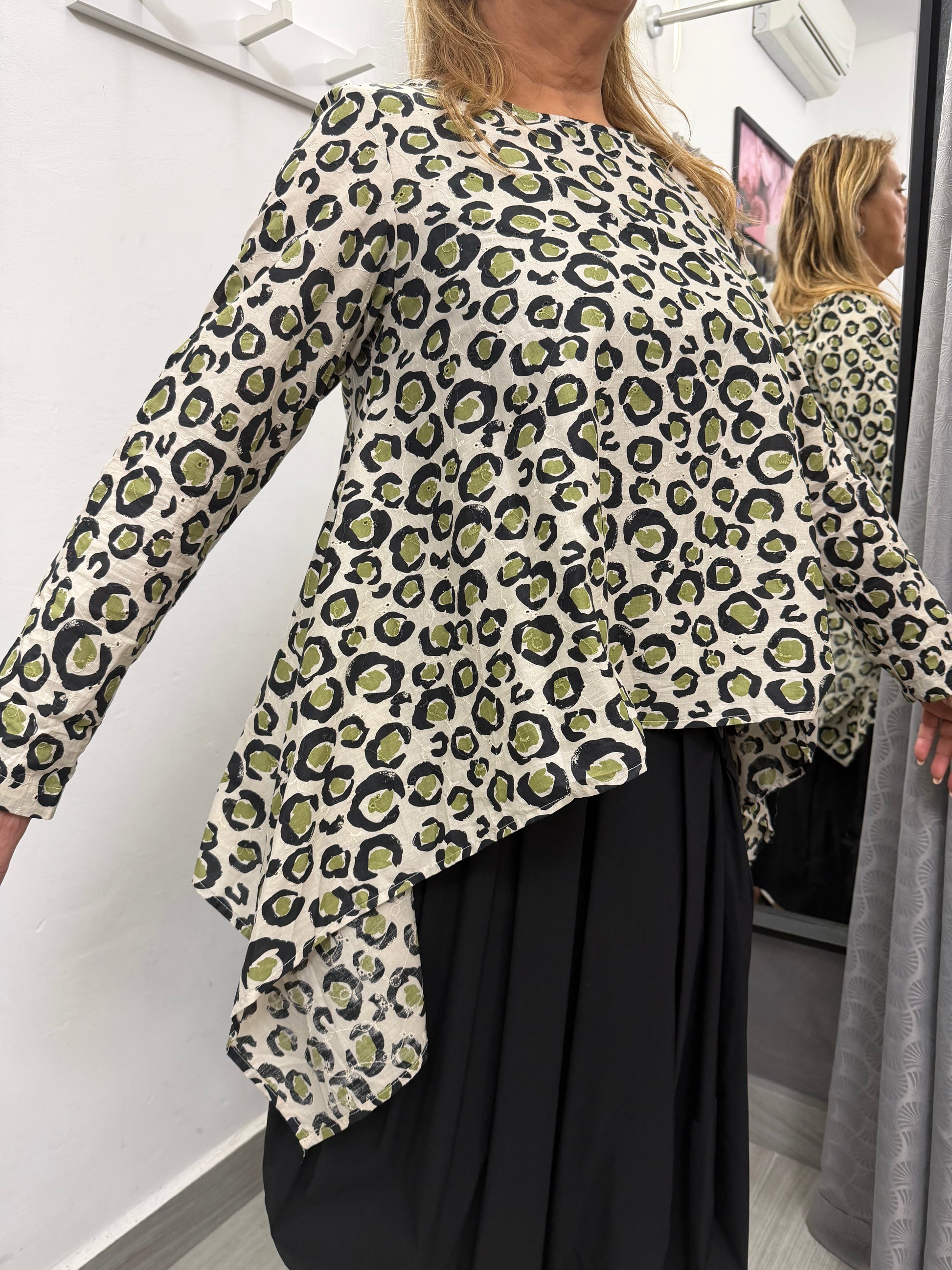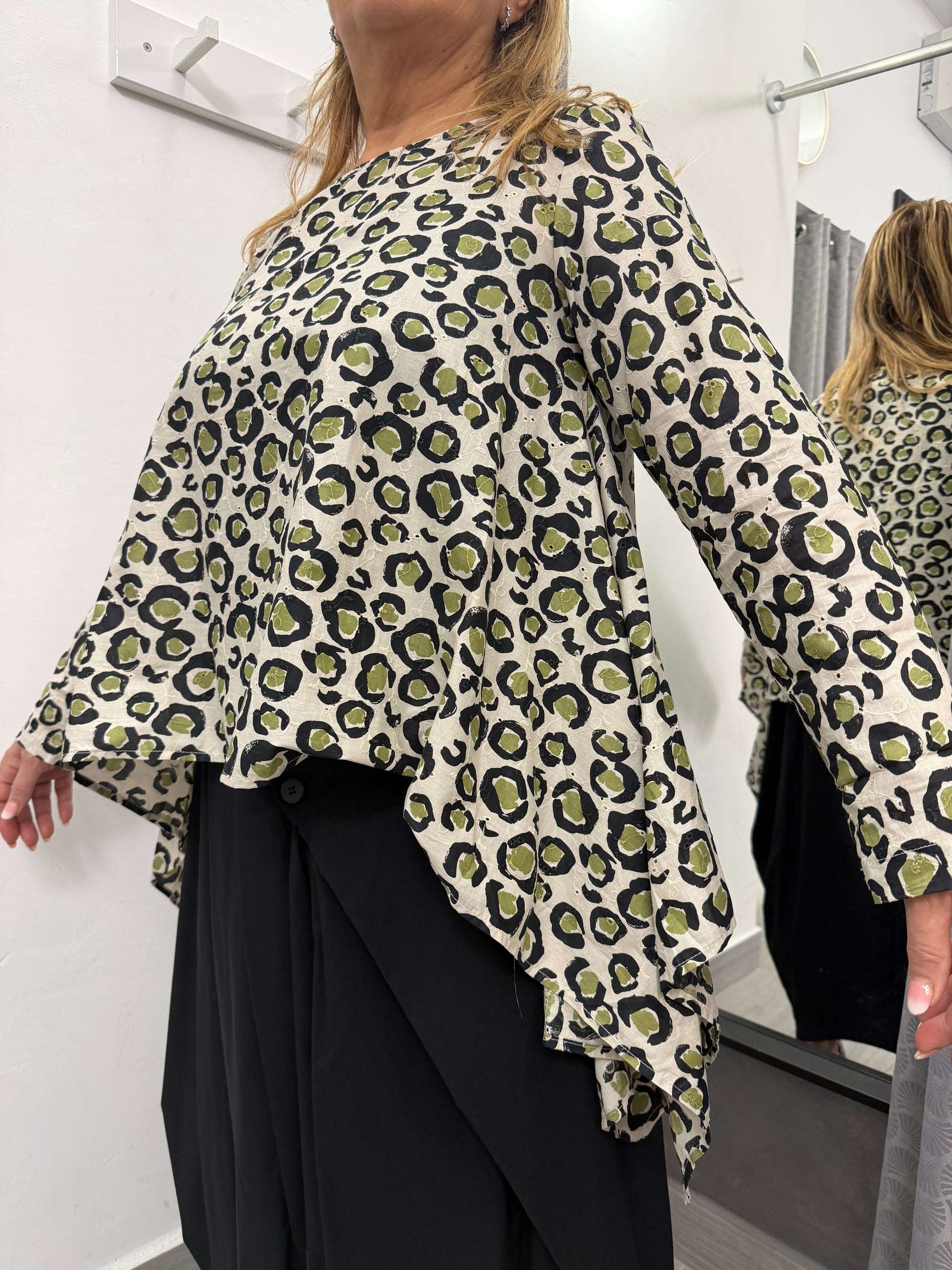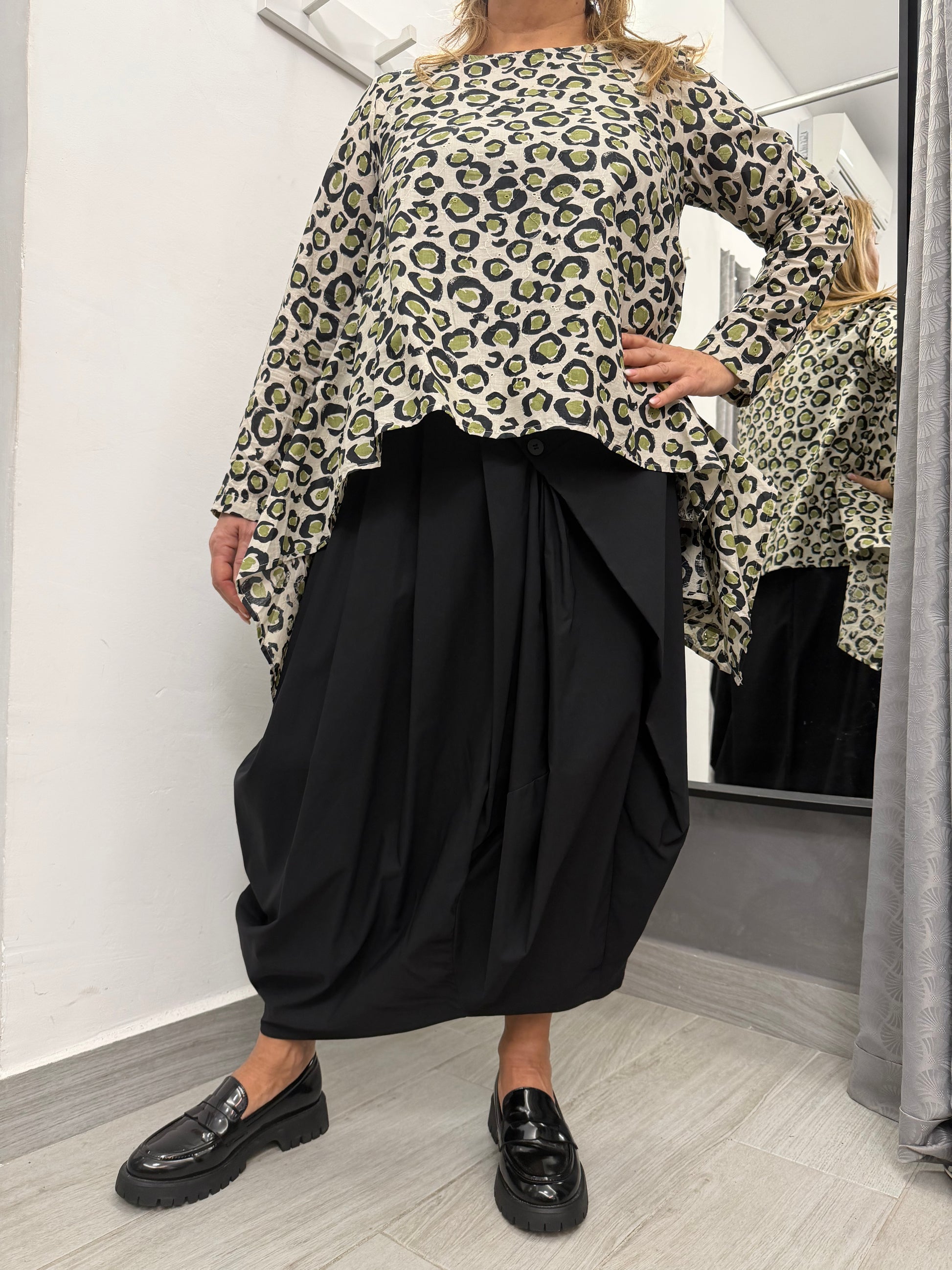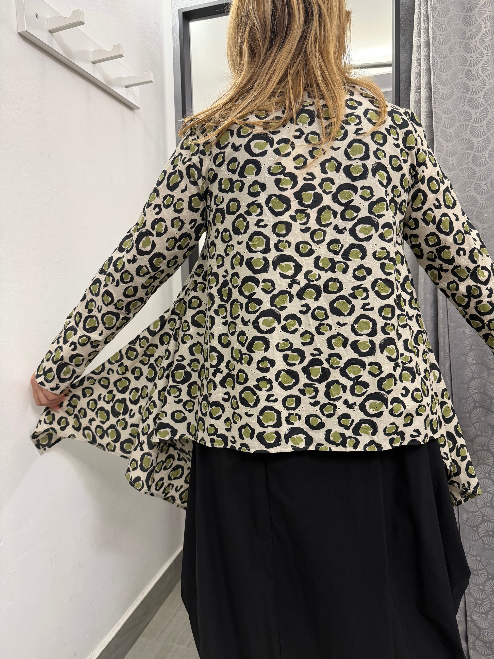 Camicia in fantasia base burro e disegni nel colore nero e verde, giro collo, manica lunga , tasche nei fianchi e punte lunghe sui lati. Taglia unica veste fino ad una 46. Composizione 100% cotone.