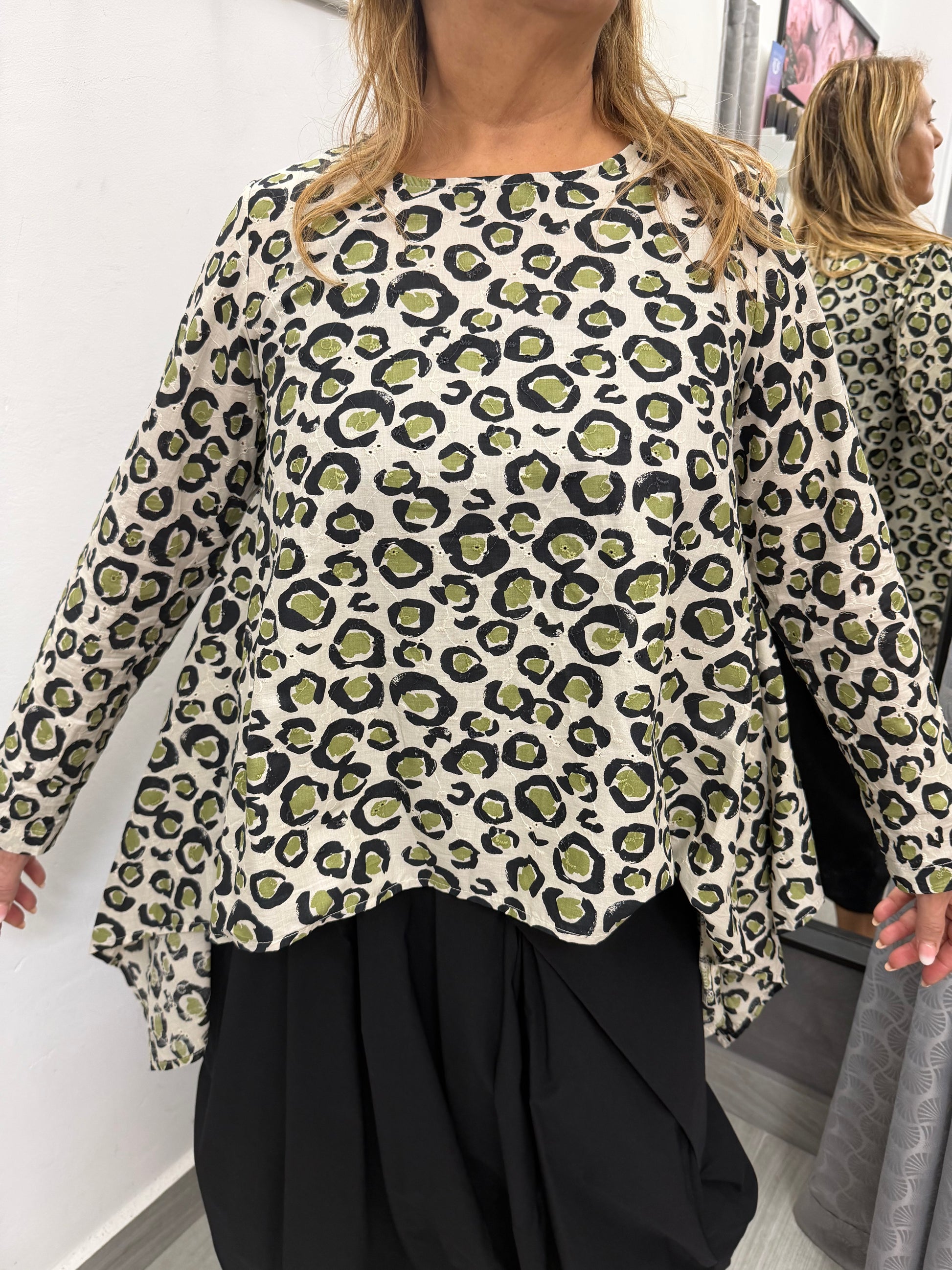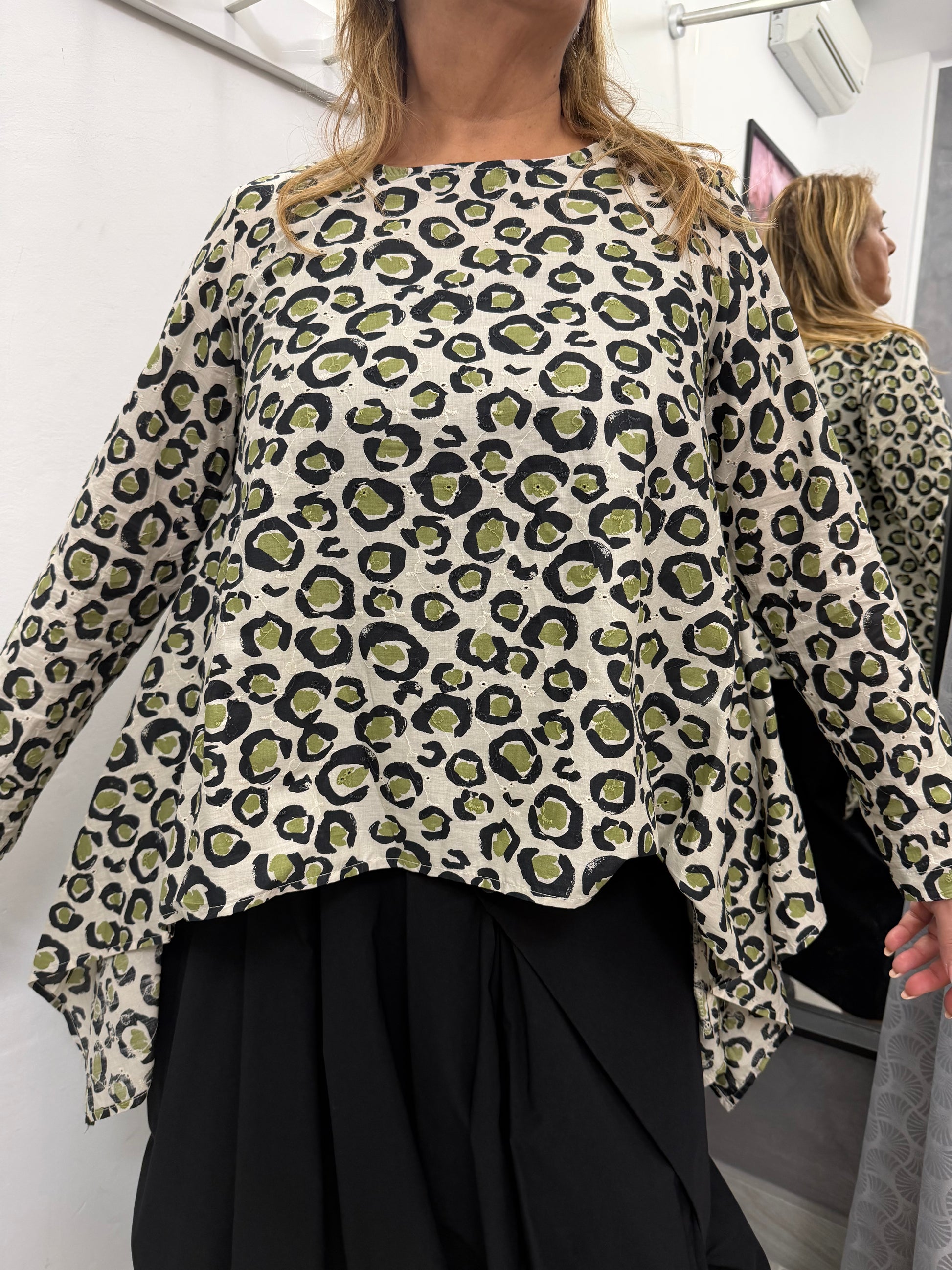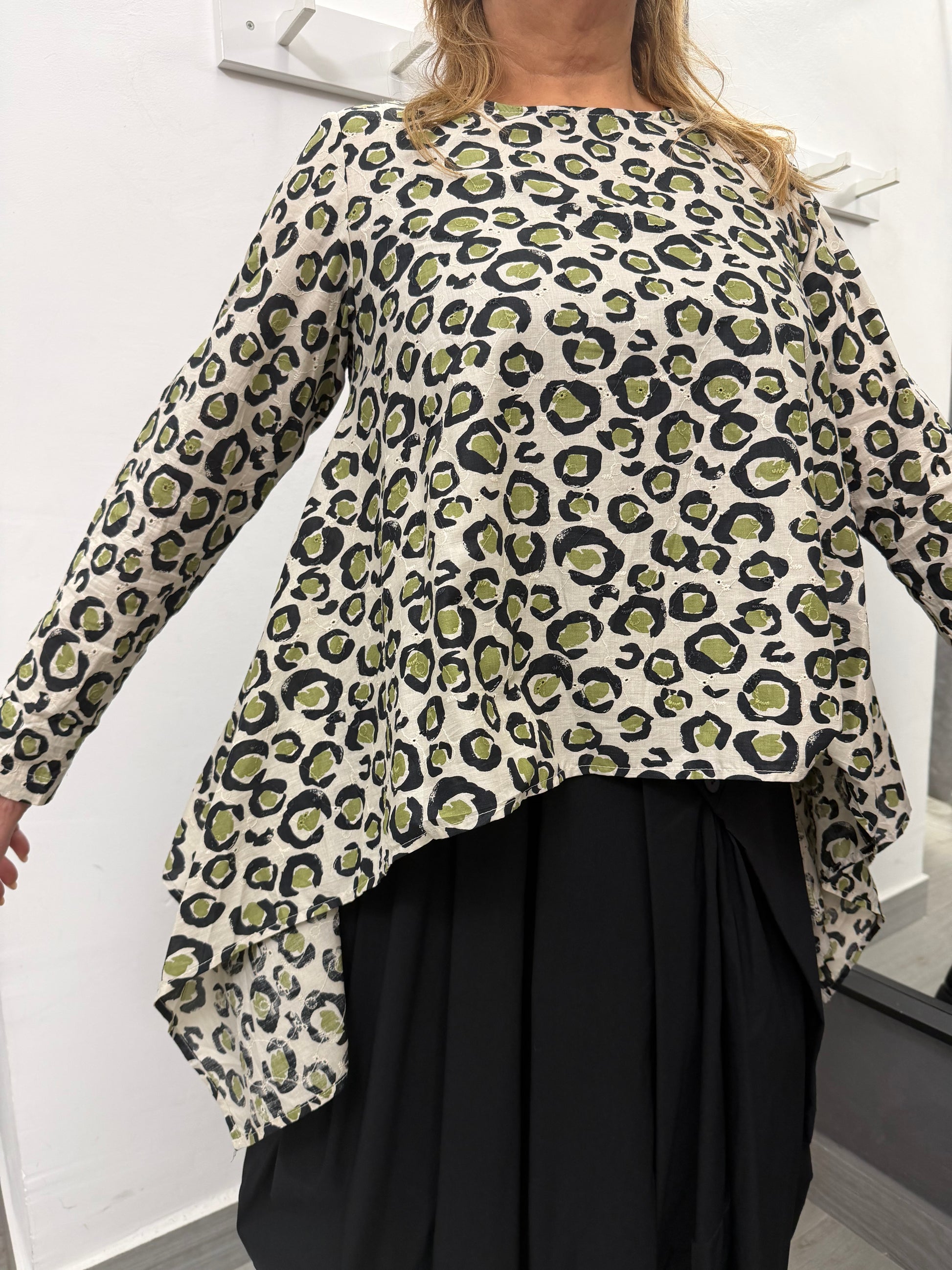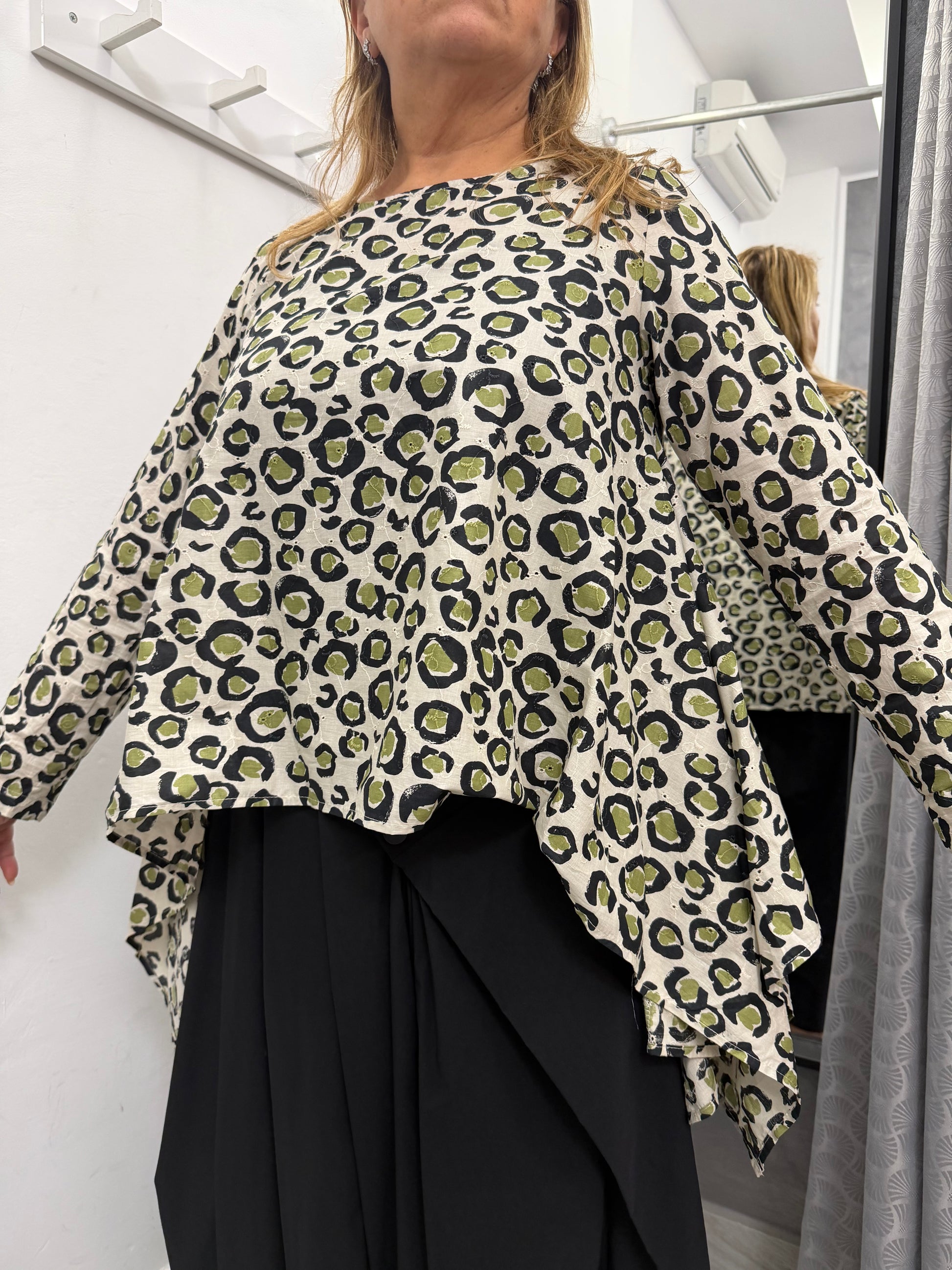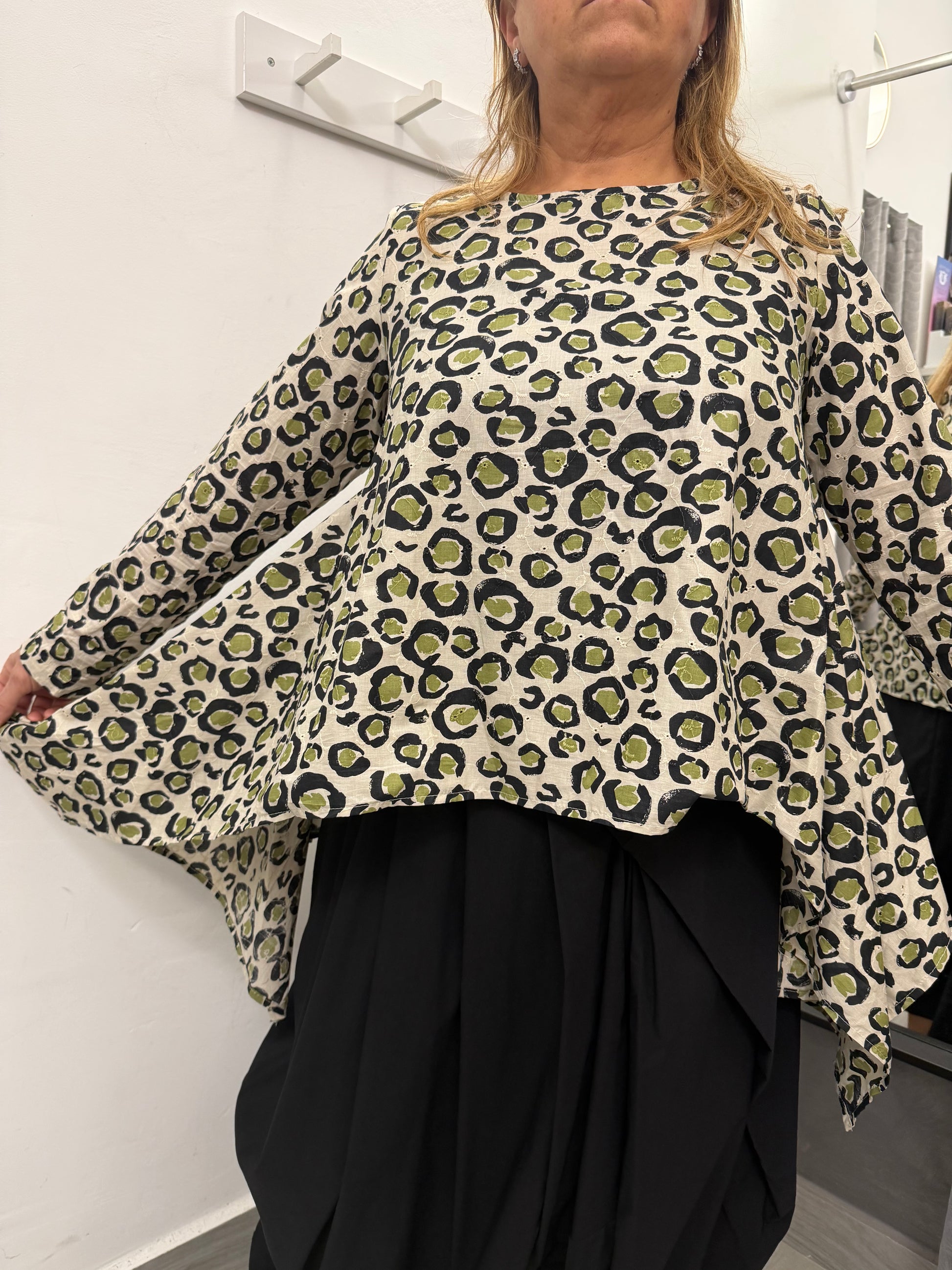 Camicia in fantasia base burro e disegni nel colore nero e verde, giro collo, manica lunga , tasche nei fianchi e punte lunghe sui lati. Taglia unica veste fino ad una 46. Composizione 100% cotone.