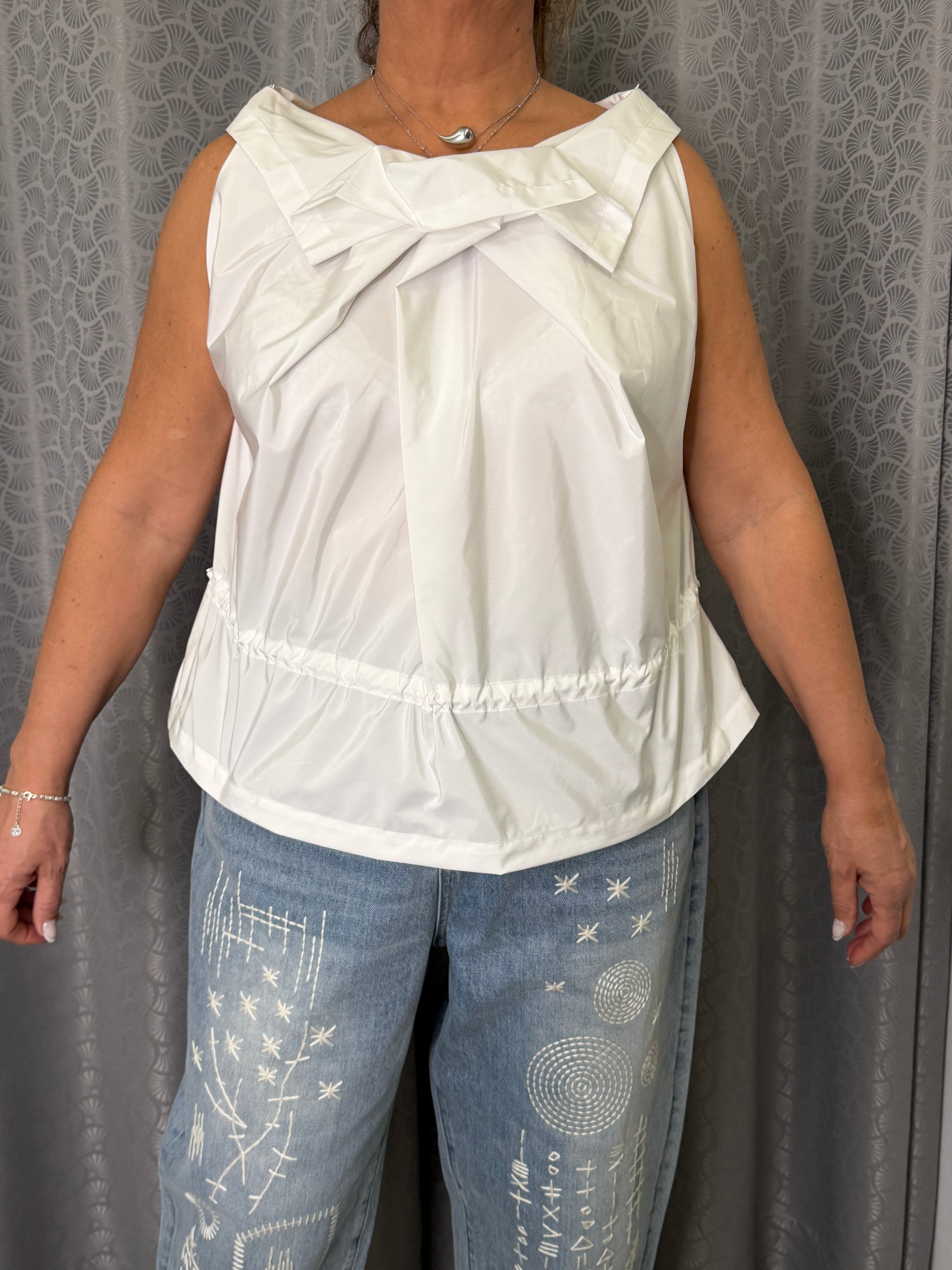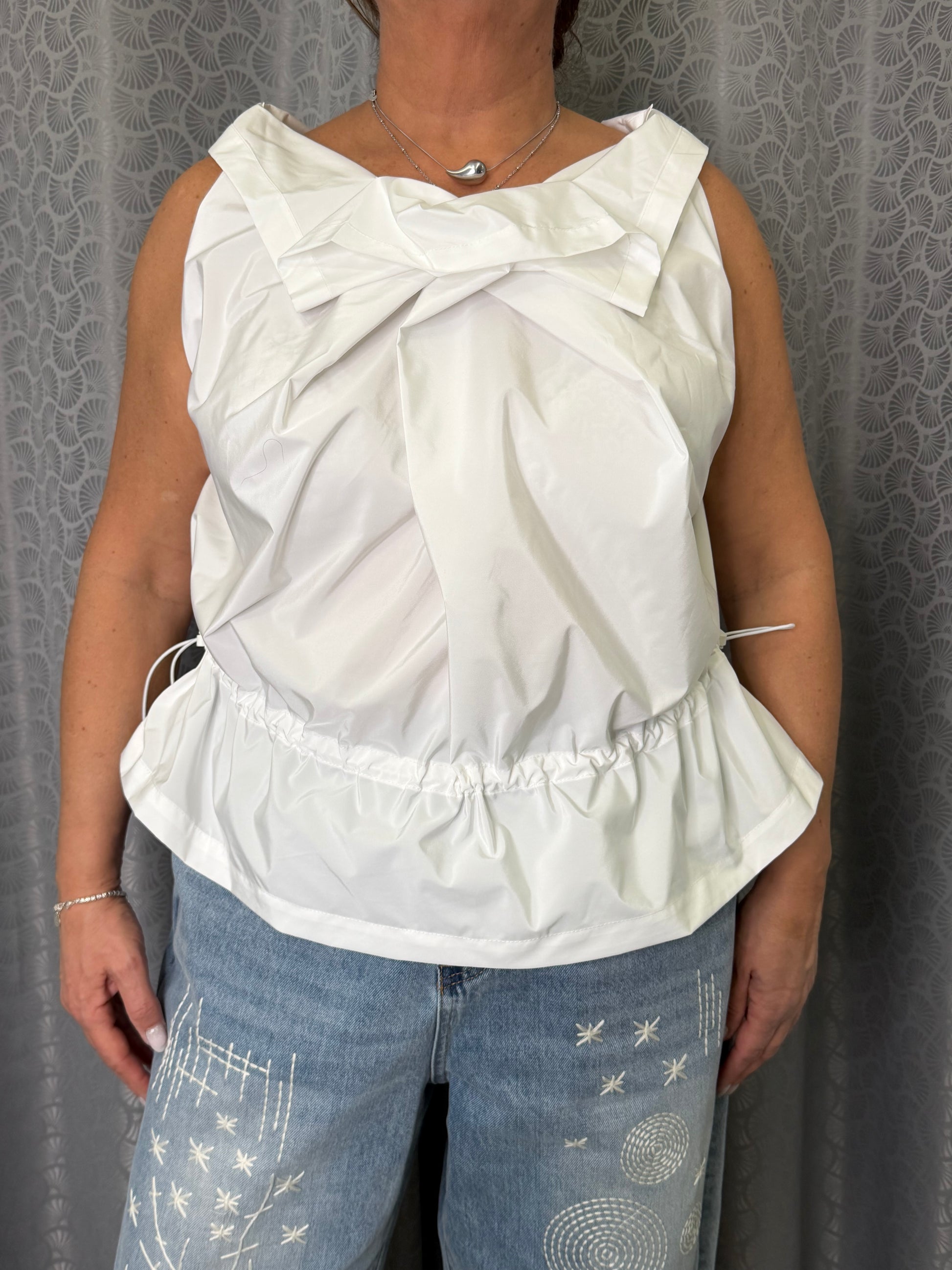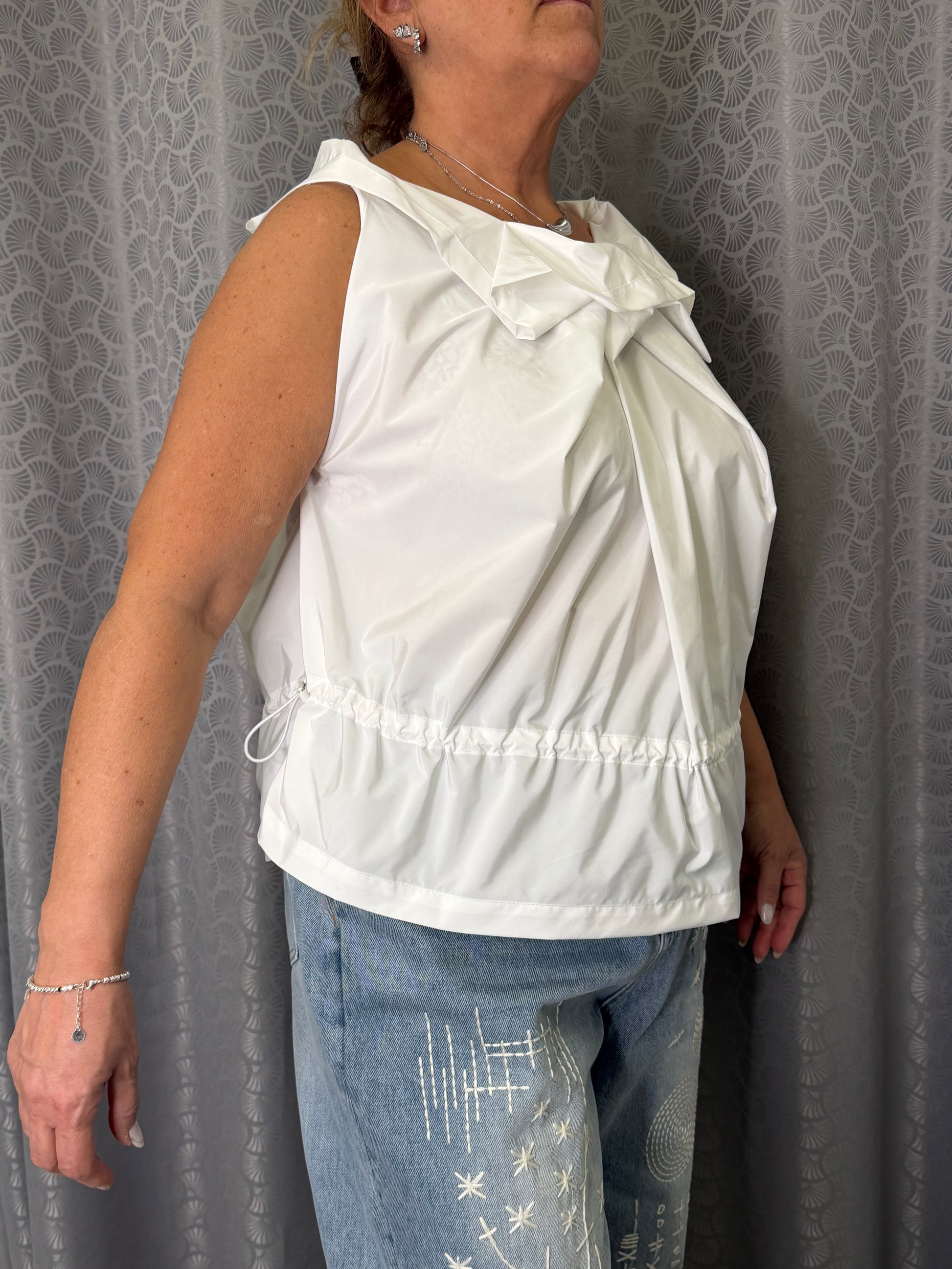 Canotta con taglio all’ americana in tessuto tecnico, collo con pieghe e coulisse in gita. Taglia unica veste fino ad una 48. Composizione 100% poliestere