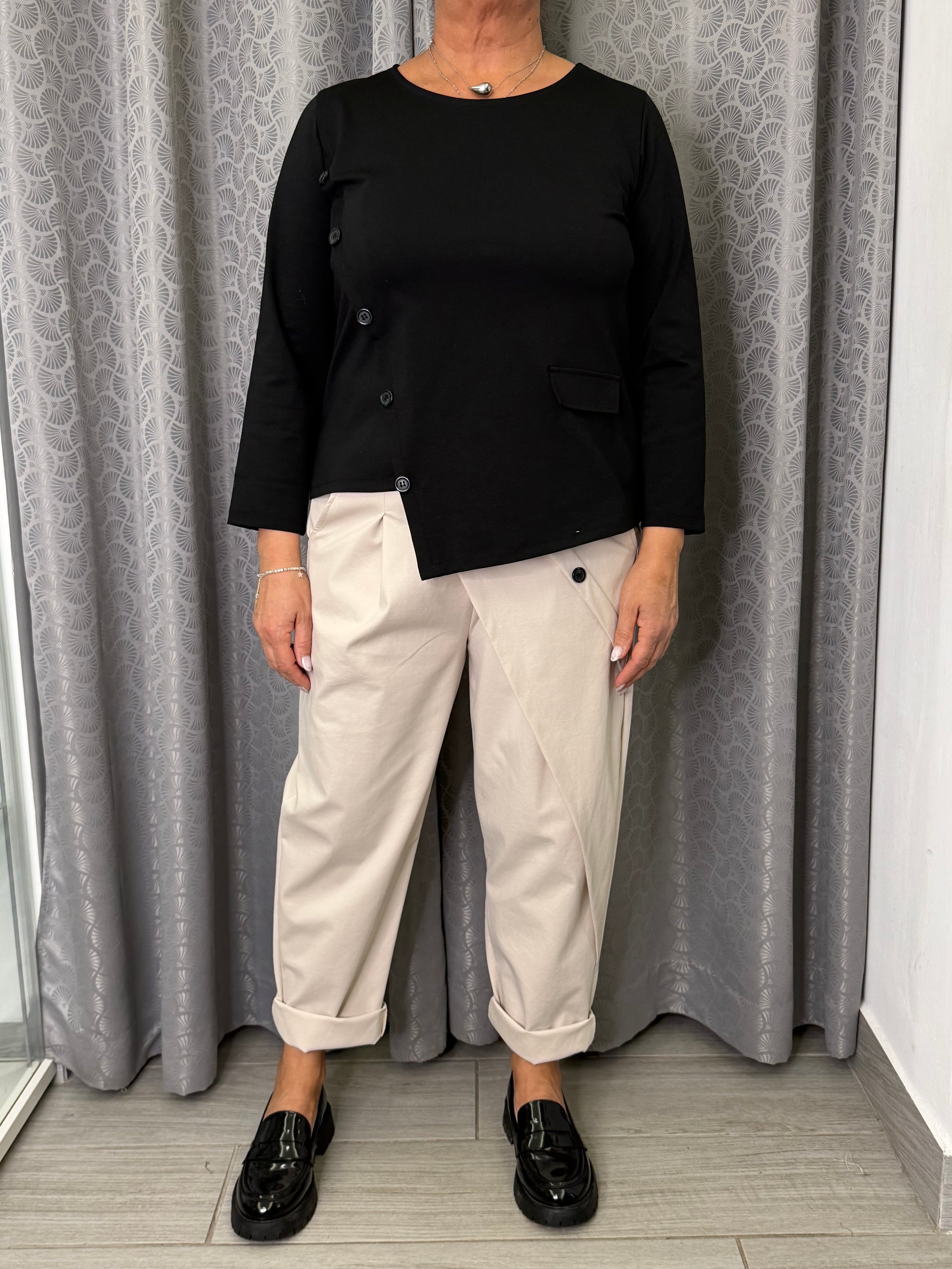 Casacca in tessuto punto Milano, finta abbottonatura trasversale, giro collo e manica 3/4. Taglia unica veste fino ad una 46. Composizione 53% cotone 38% poliestere 9% elastan