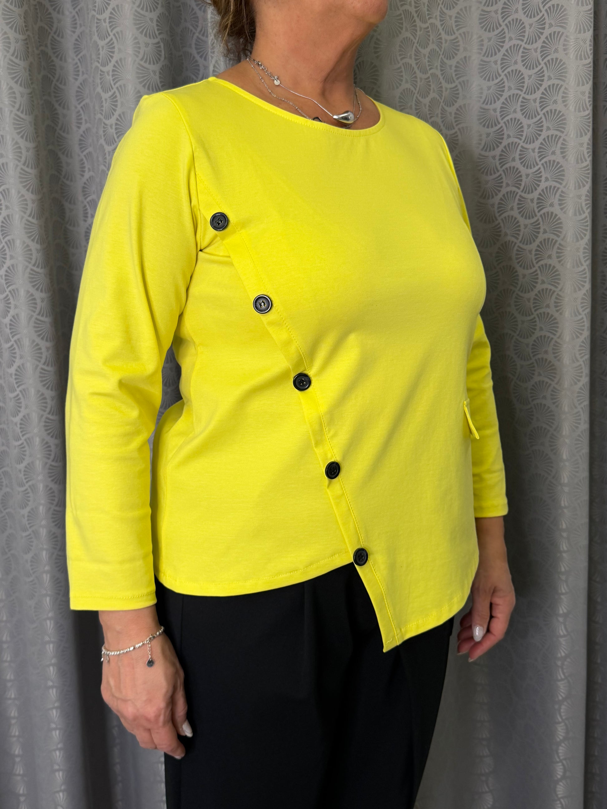 Casacca in tessuto punto Milano, finta abbottonatura trasversale, giro collo e manica 3/4. Taglia unica veste fino ad una 46. Composizione 53% cotone 38% poliestere 9% elastan