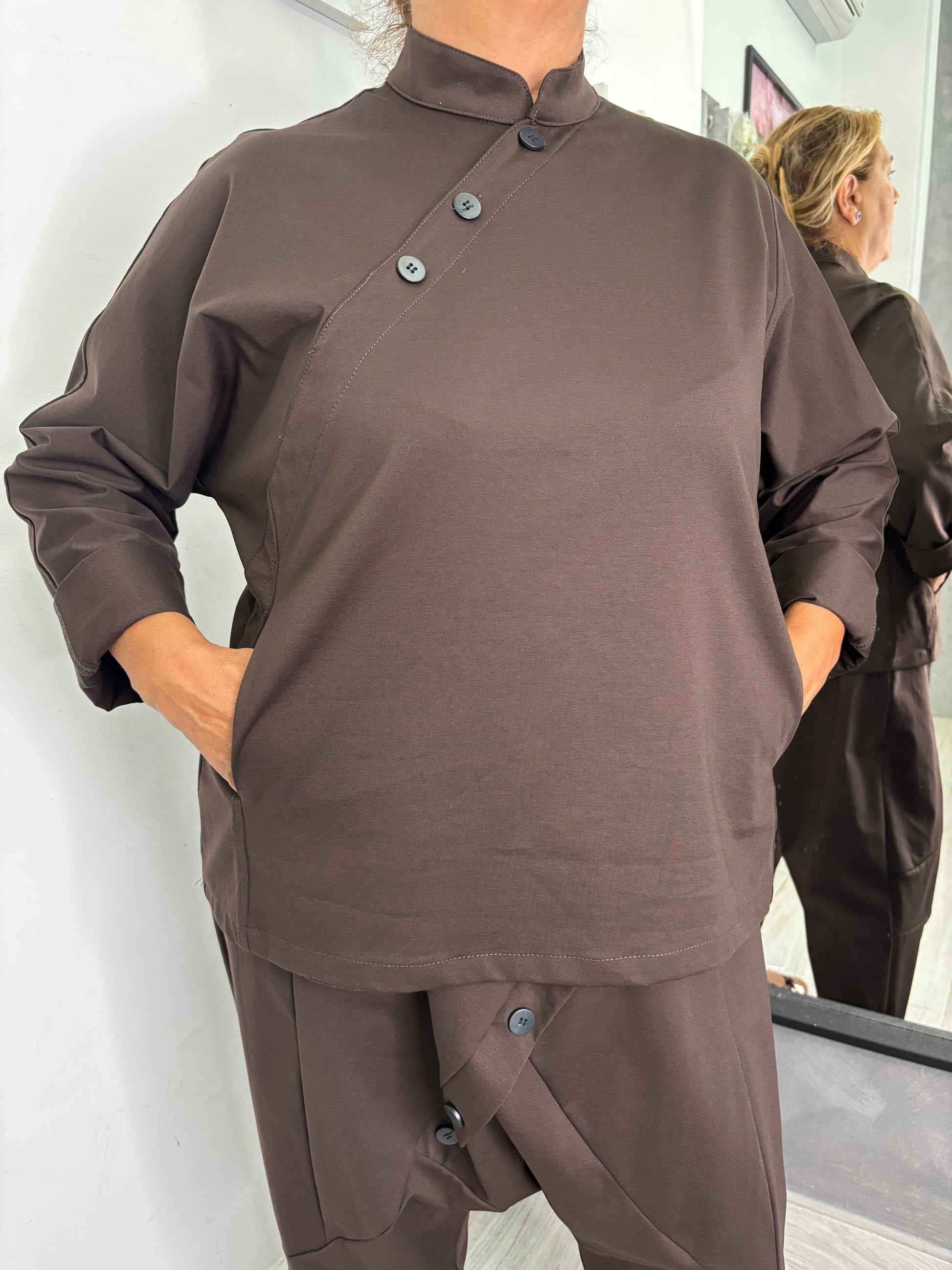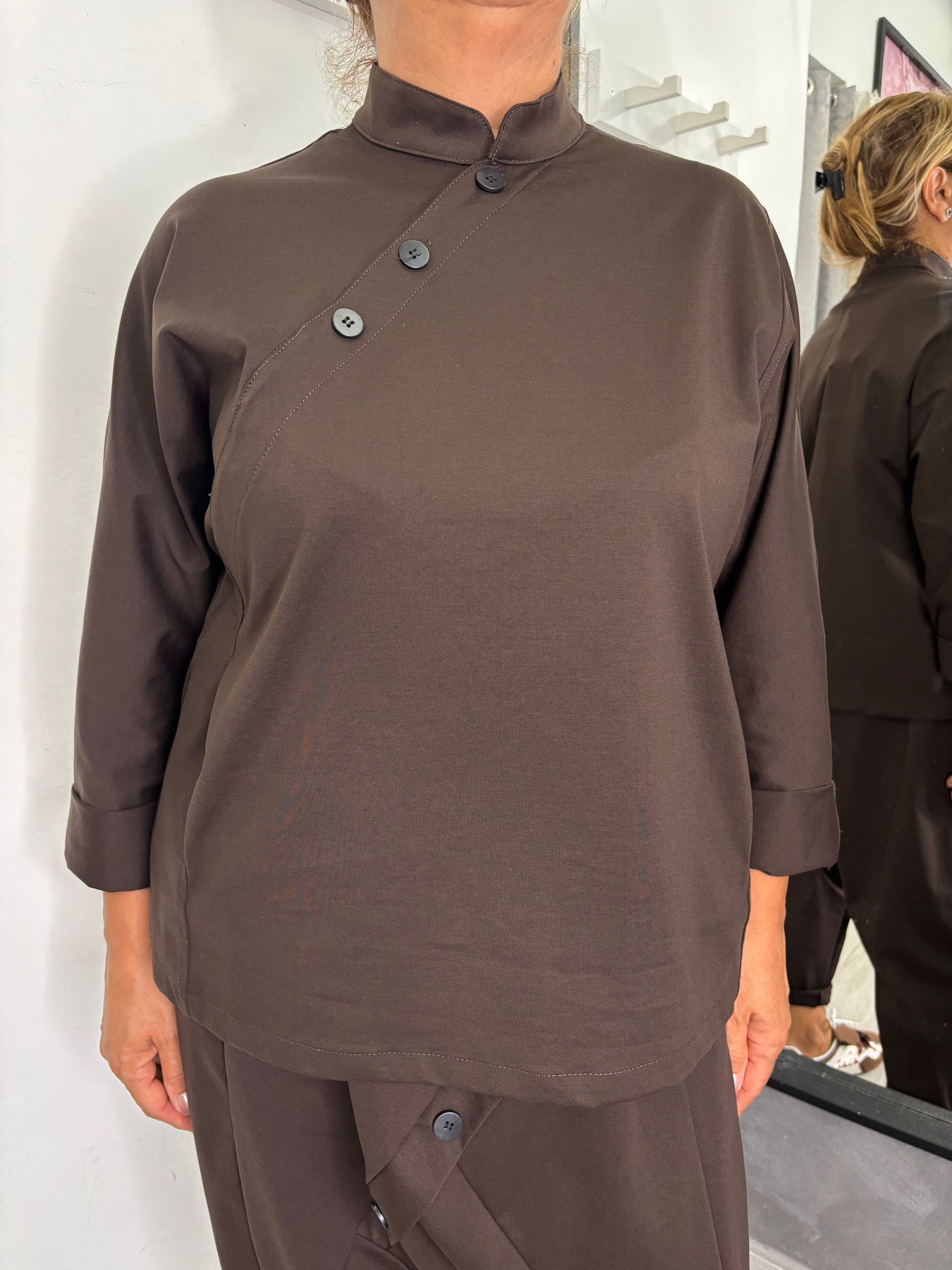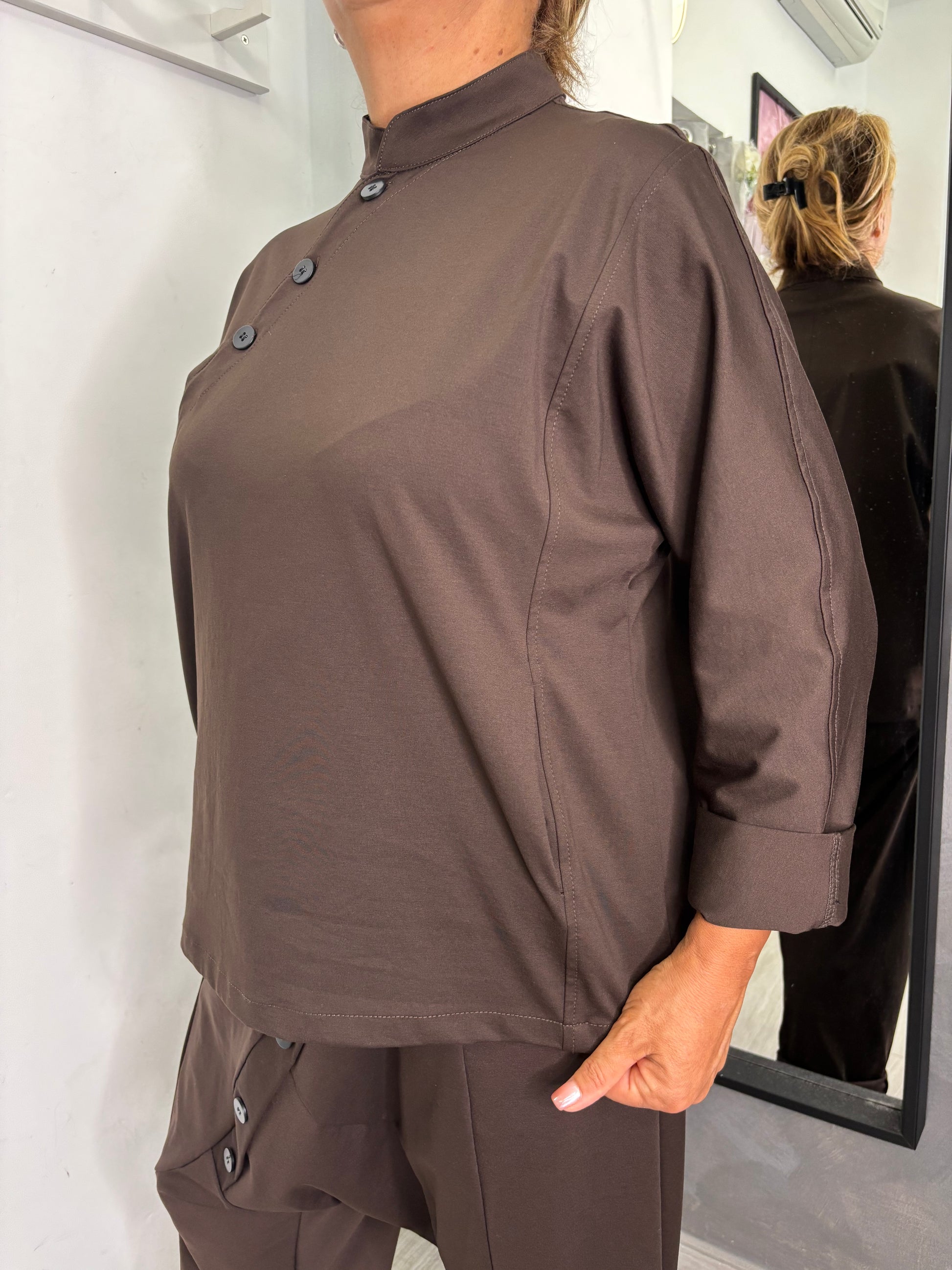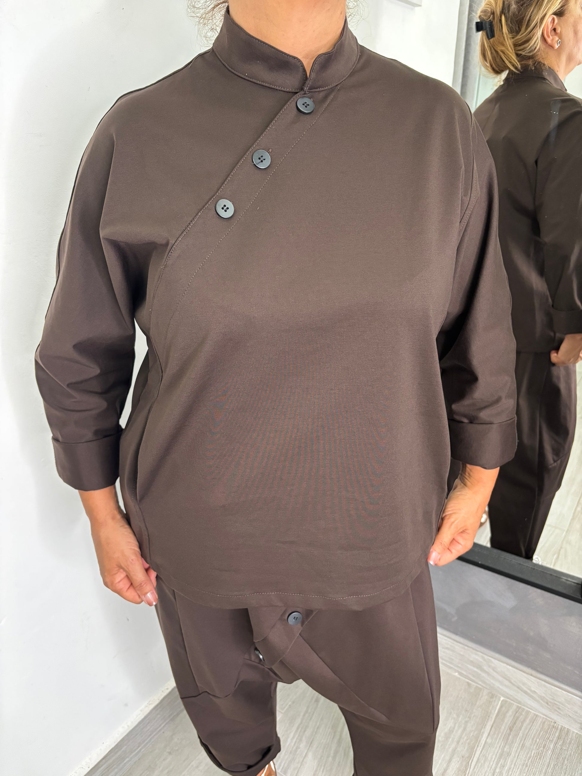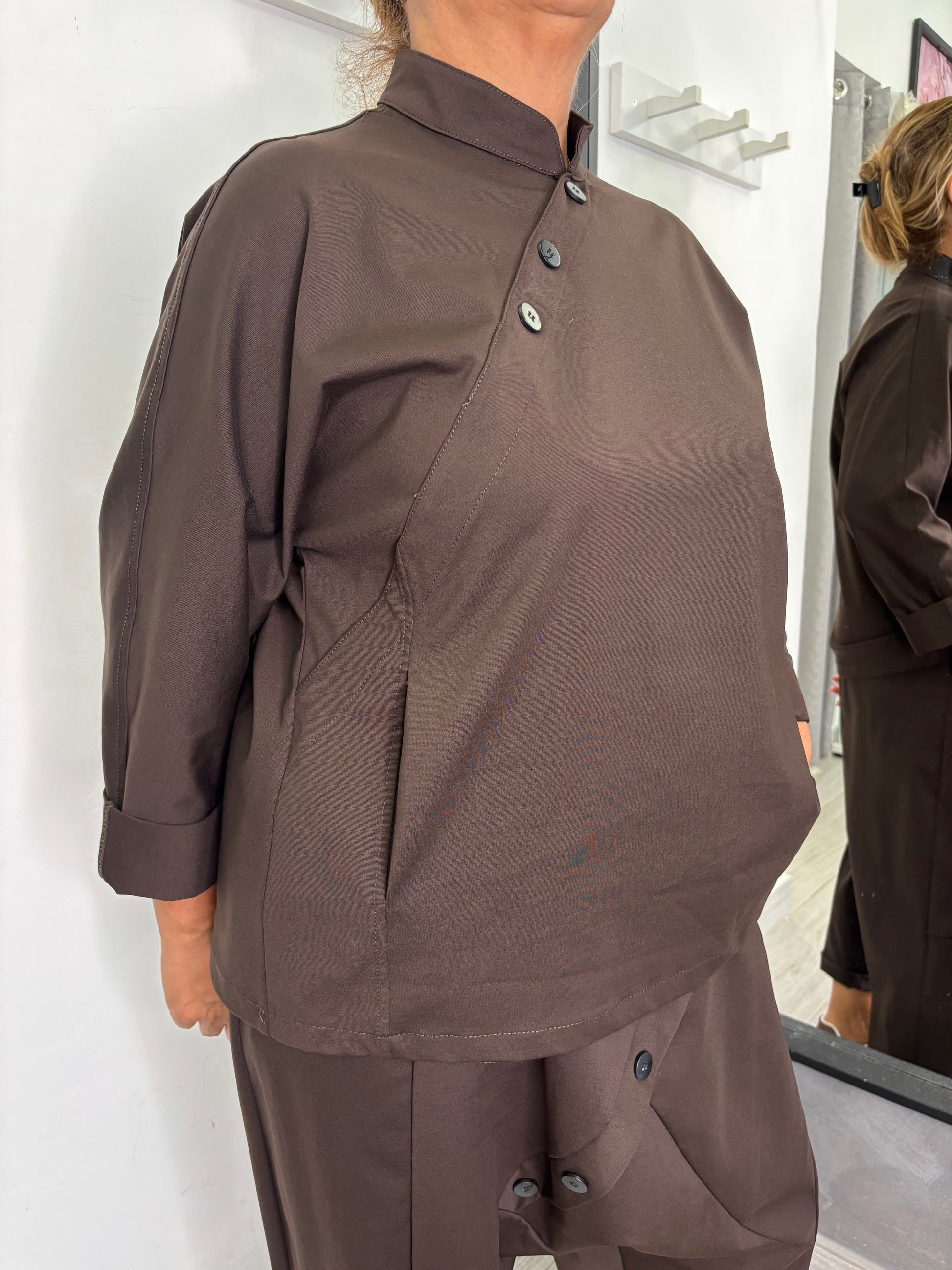 Casacca in tessuto punto Milano, collo alla coreana, abbottonatura trasversale, tasche inserite davanti nella cucitura. Taglia unica veste fino ad una 46. Composizione 53% cotone 38% poliammide 9% elastan.