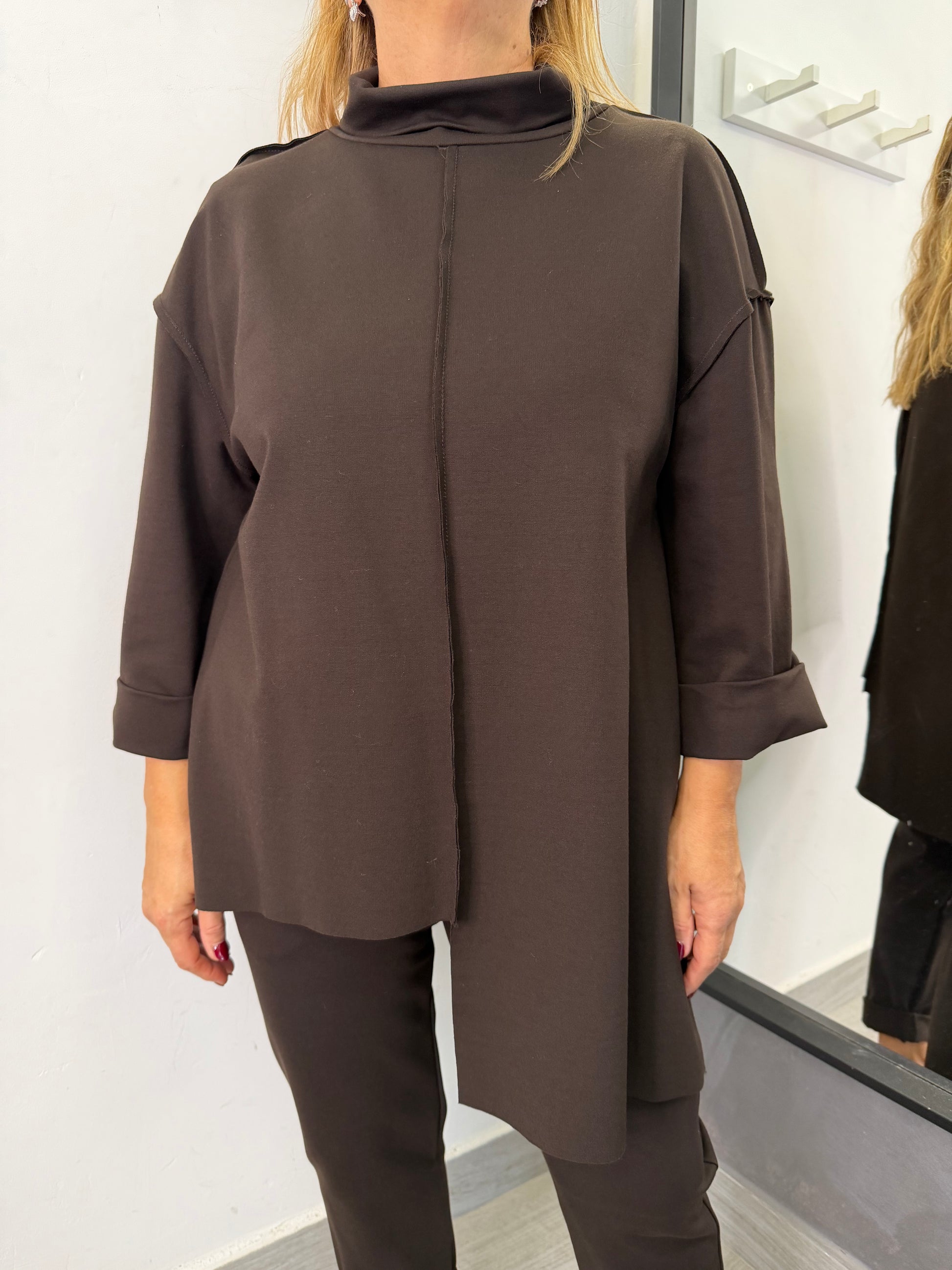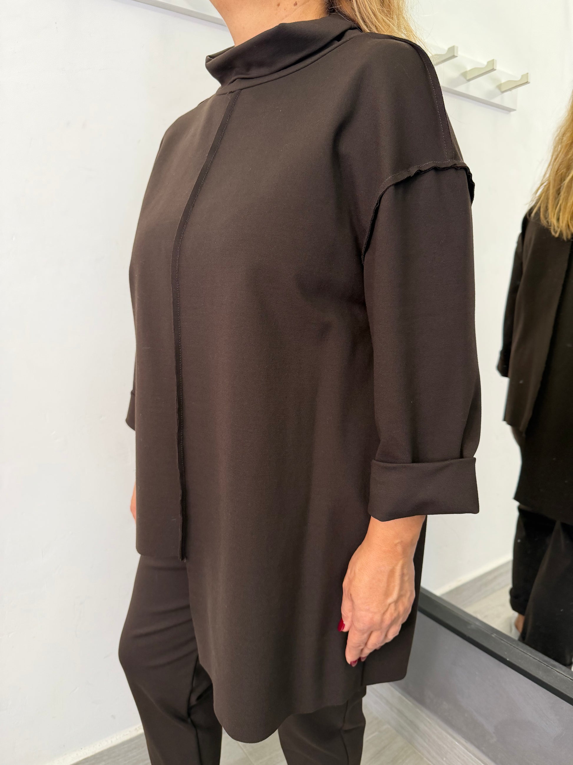 Casacca in tessuto punto Milano, taglio assimetrico, più lunga nella parte destra, manica lunga e collo ad anello, rifinito con cucitura a taglio vivo. Taglia unica veste fino ad una 46. Composizione 65% viscosa 30% poliammide 5% elastan.