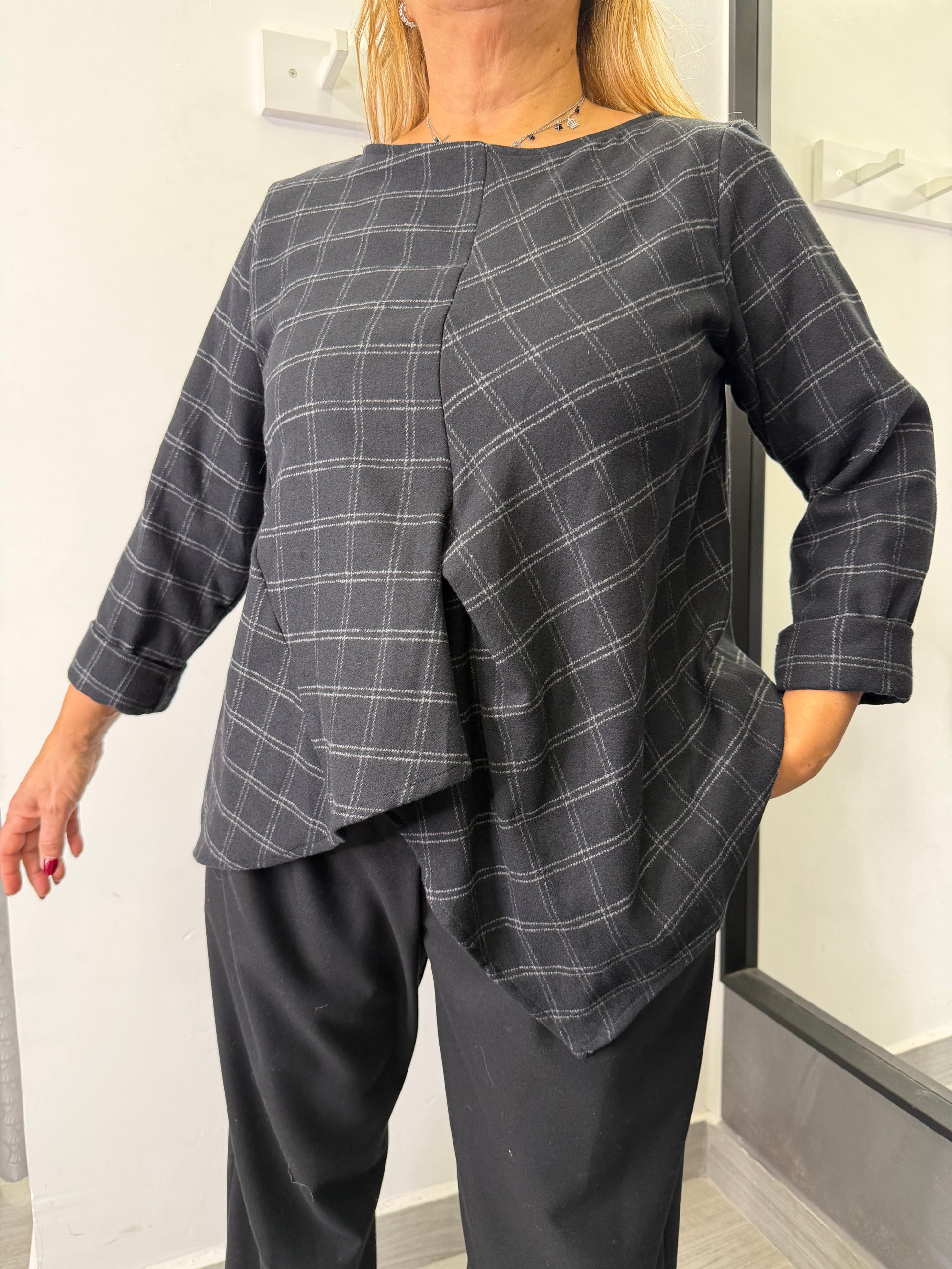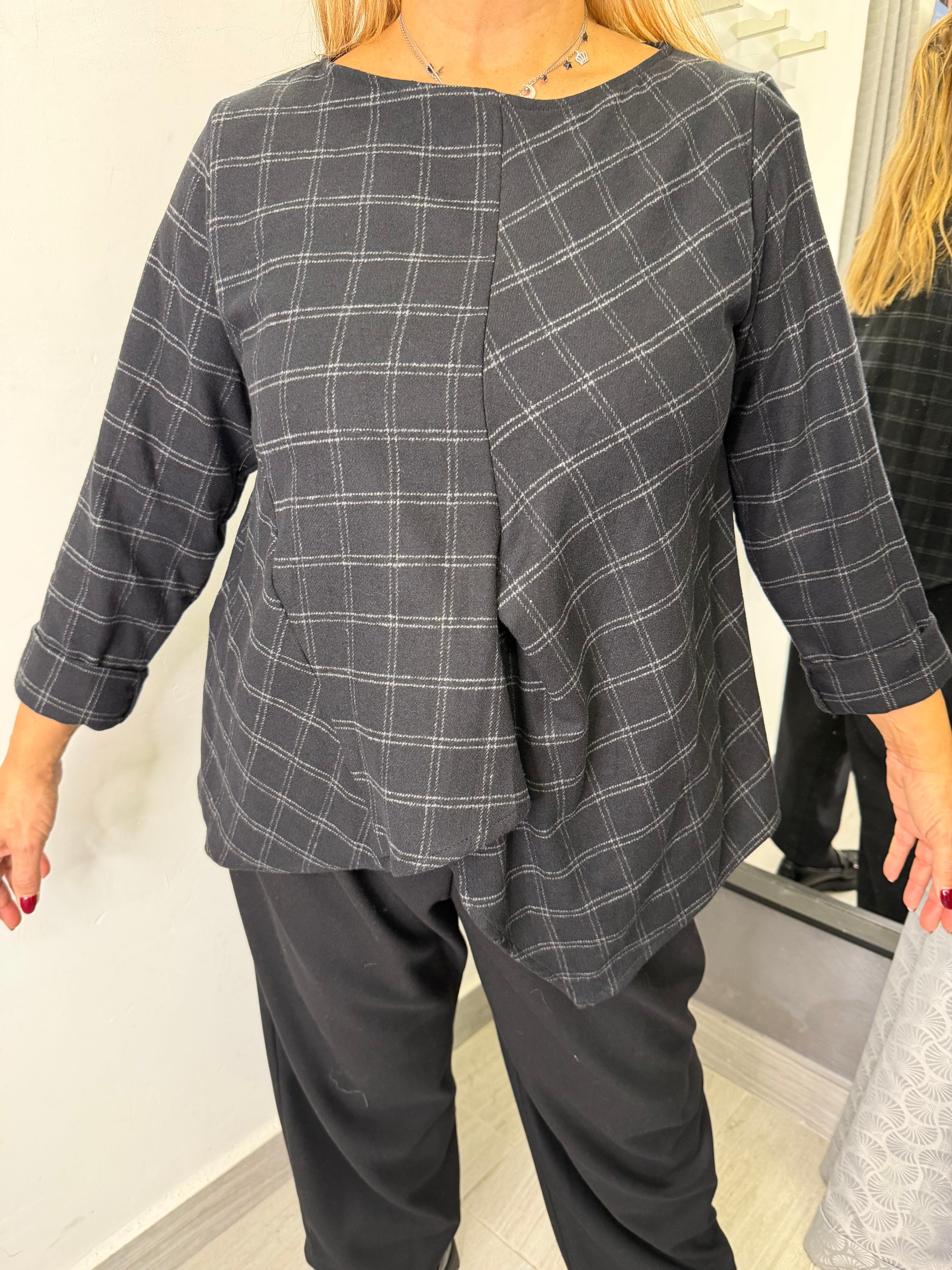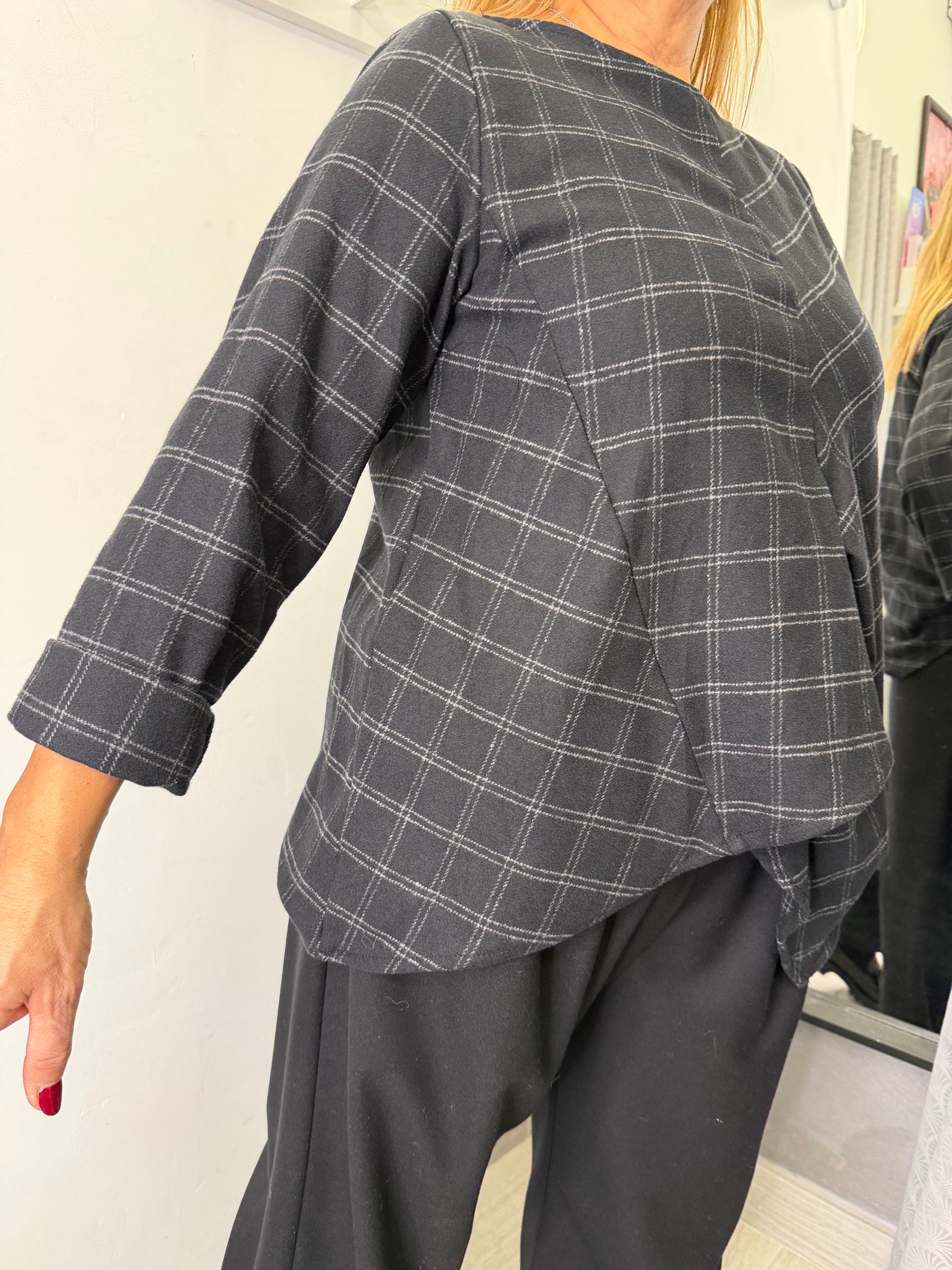 Casacca in tessuto pesante a quadri, scollo rotondo, cucitura davanti con piegone. Taglia unica veste fino ad una 46. Composizione 70% cotone, 25% poliestere 5% altre fibre