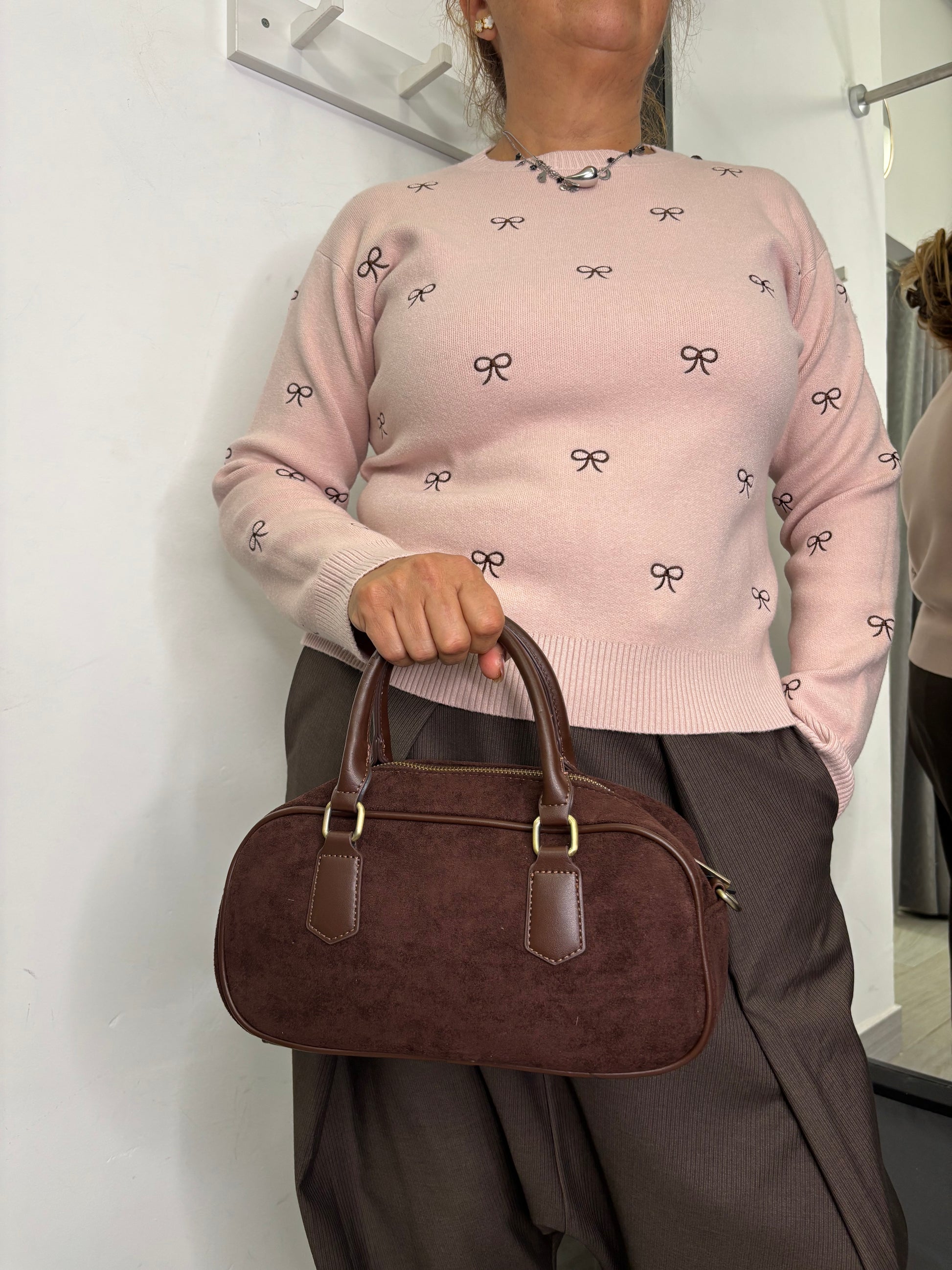 Bauletto in simil alcantara con cerniera manici corti e tracolla.