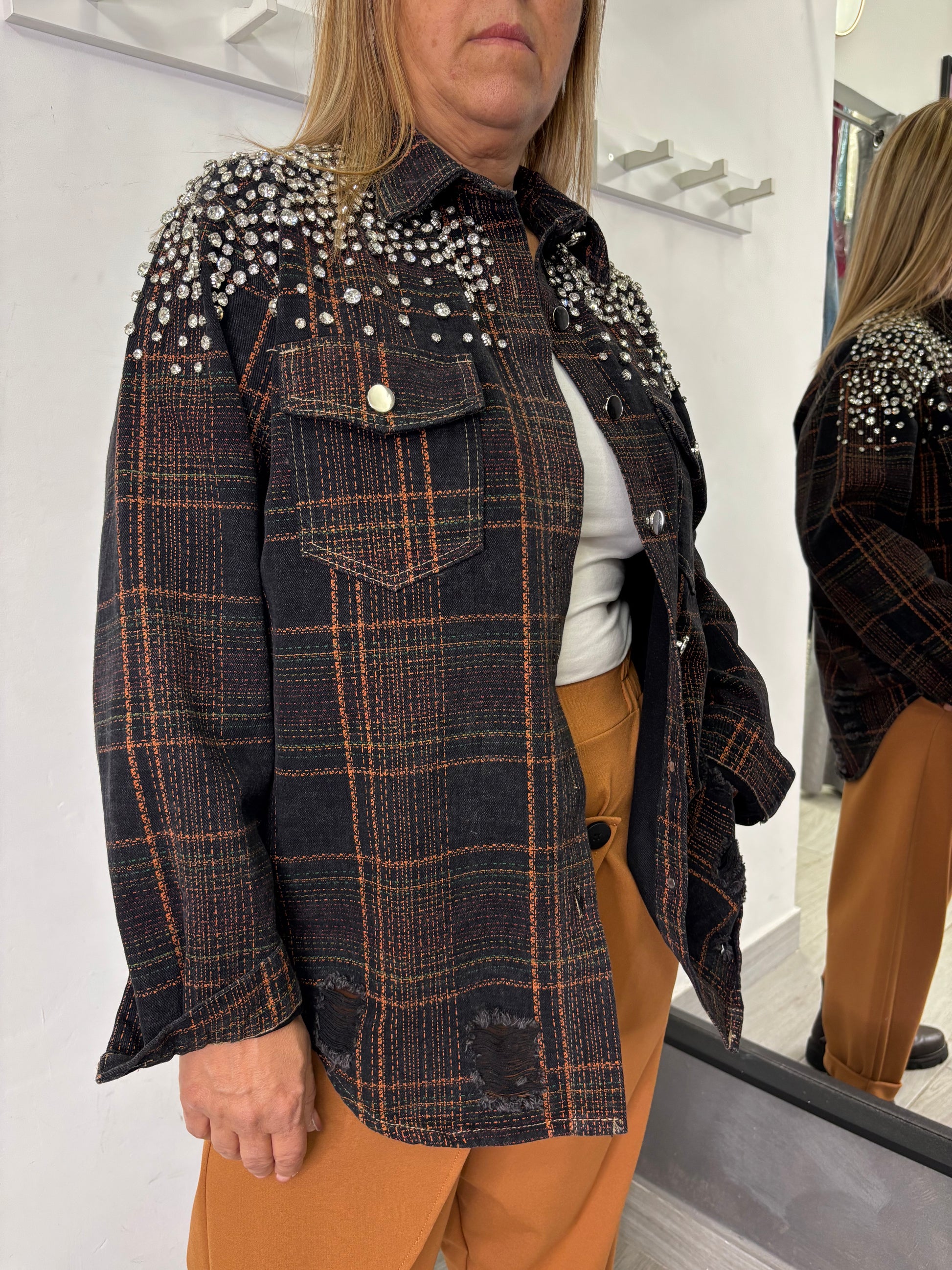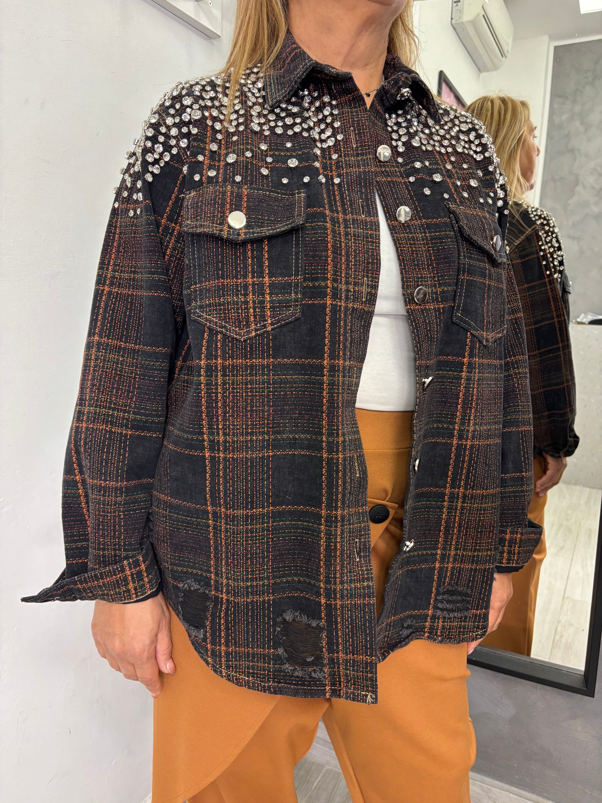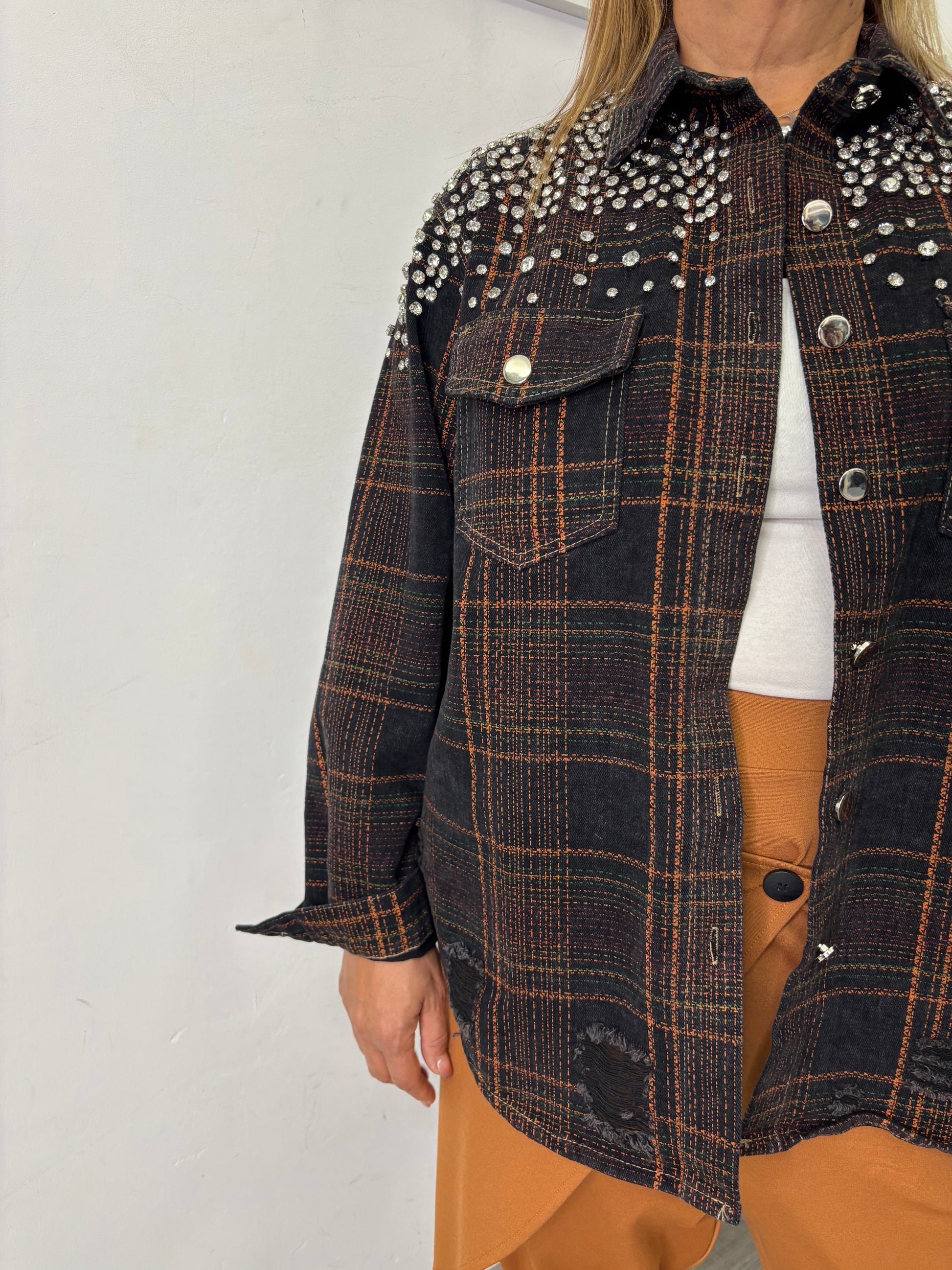 Camicia in tessuto di jeans a quadri, tutta ricoperta di pietre in silver, tasche applicate davanti e abbottonatura frontale con bottoni in acciaio. Taglia unica veste fino ad una 46. Composizione 95% cotone 5% poliestere