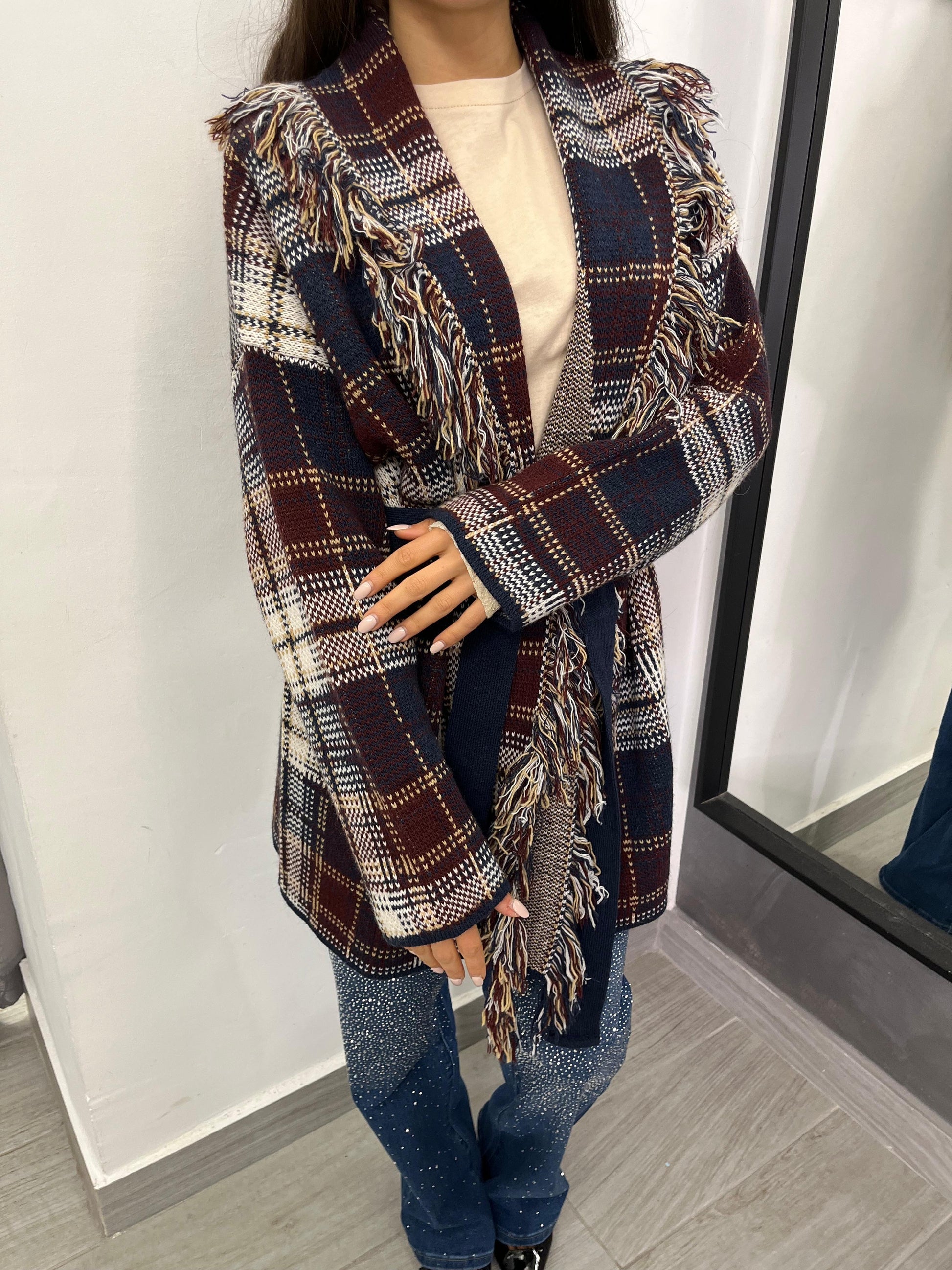 Cardigan con frange e cintura. Modello Oversize, taglia unica veste fino ad una 48. Composizione 10% lana 5% alpaca 10 viscosa 75% acrilico