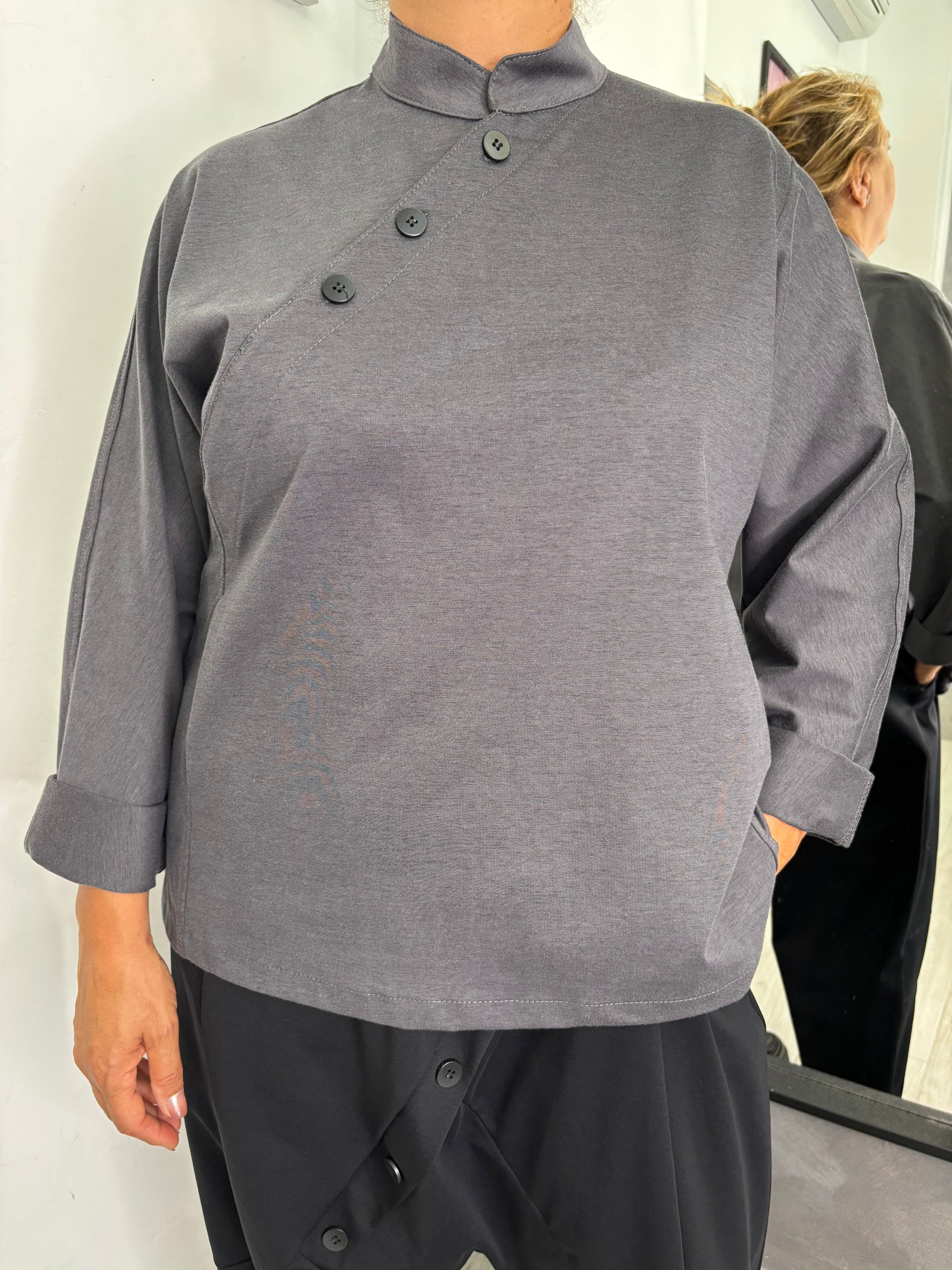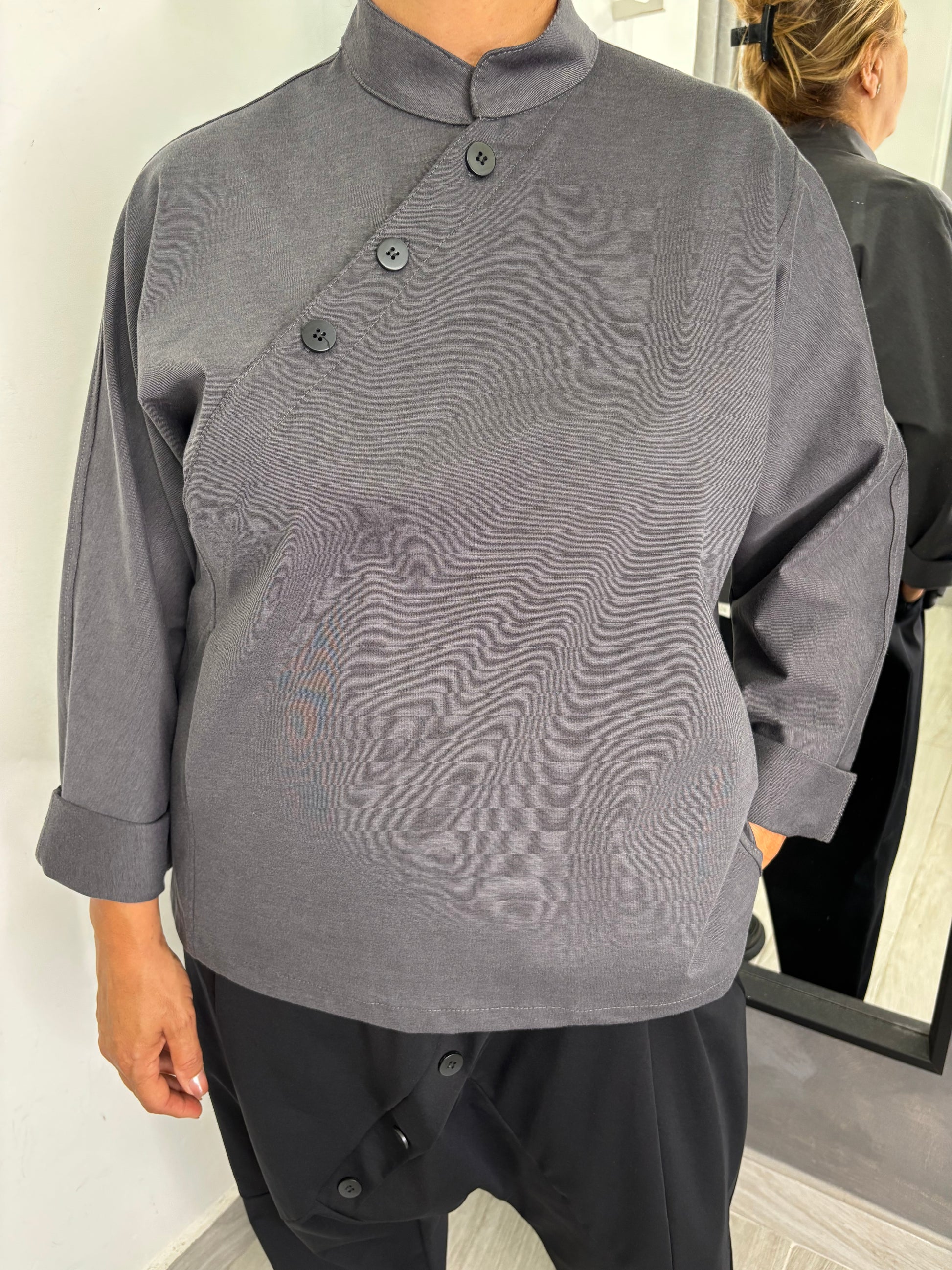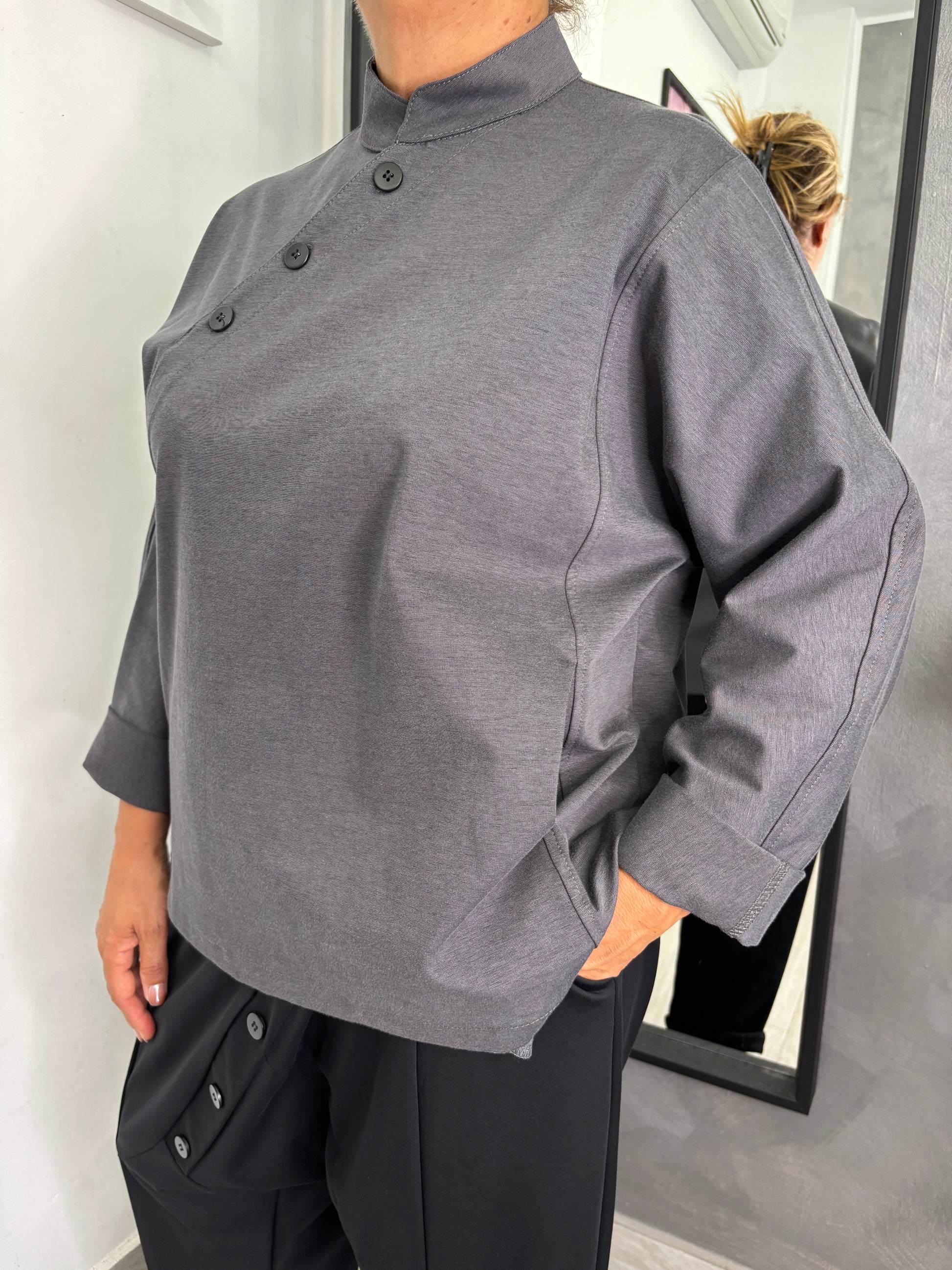 Casacca in tessuto punto Milano, collo alla coreana, abbottonatura trasversale, tasche inserite davanti nella cucitura. Taglia unica veste fino ad una 46. Composizione 53% cotone 38% poliammide 9% elastan.