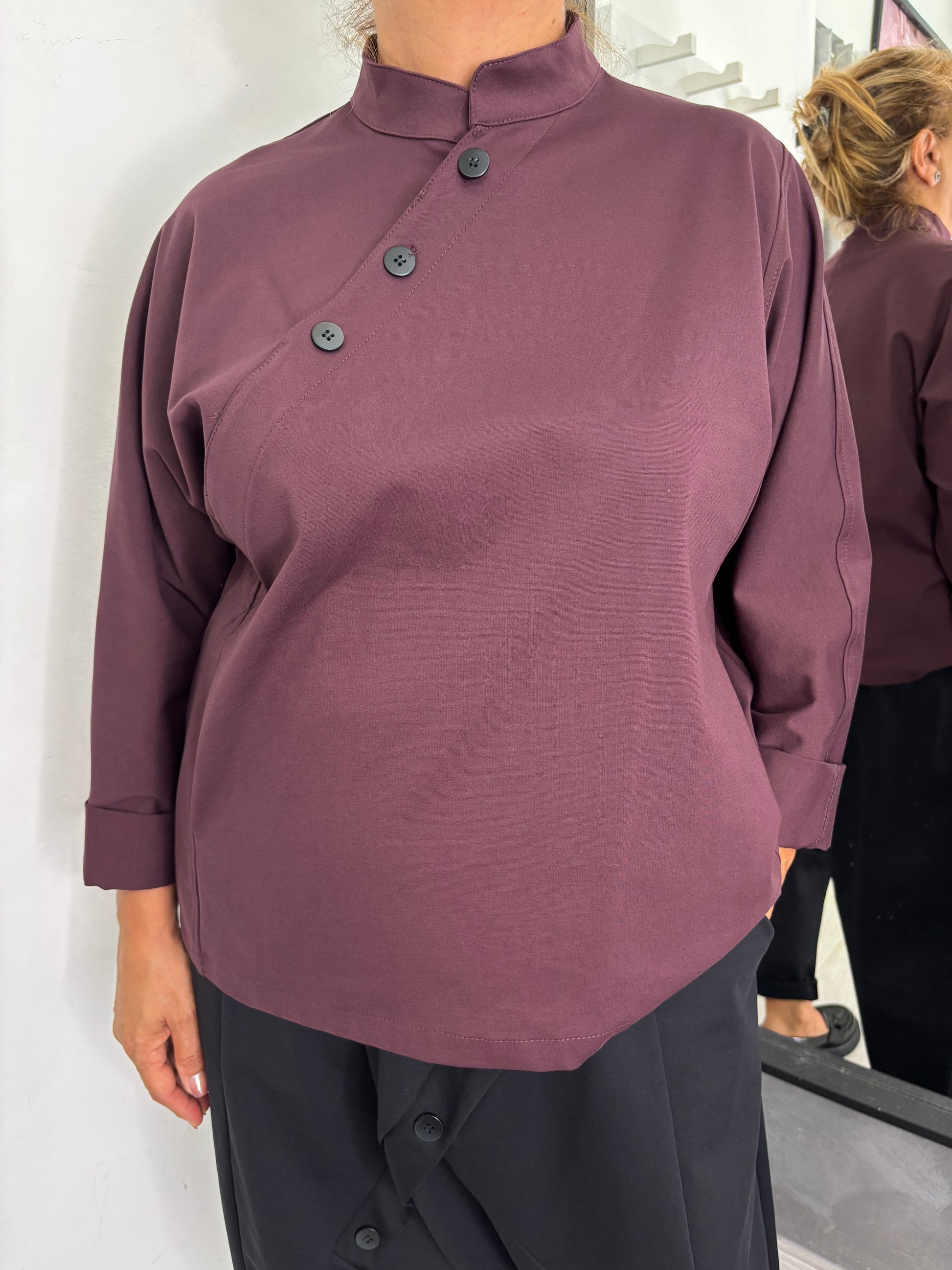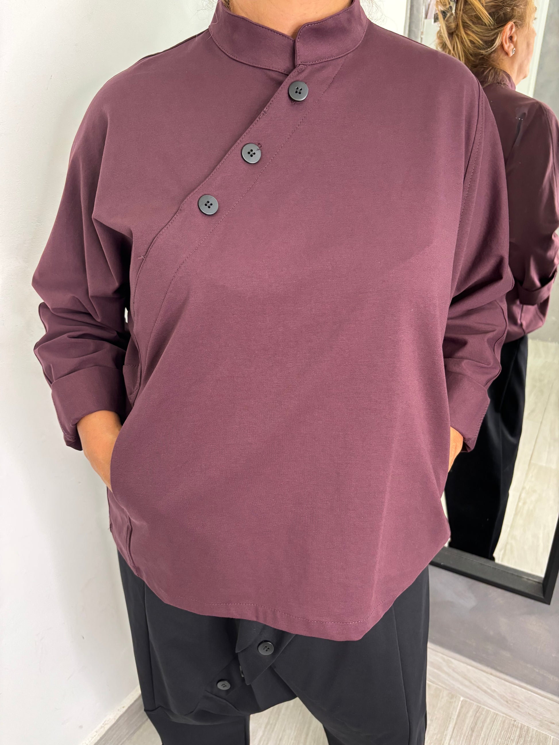 Casacca in tessuto punto Milano, collo alla coreana, abbottonatura trasversale, tasche inserite davanti nella cucitura. Taglia unica veste fino ad una 46. Composizione 53% cotone 38% poliammide 9% elastan.