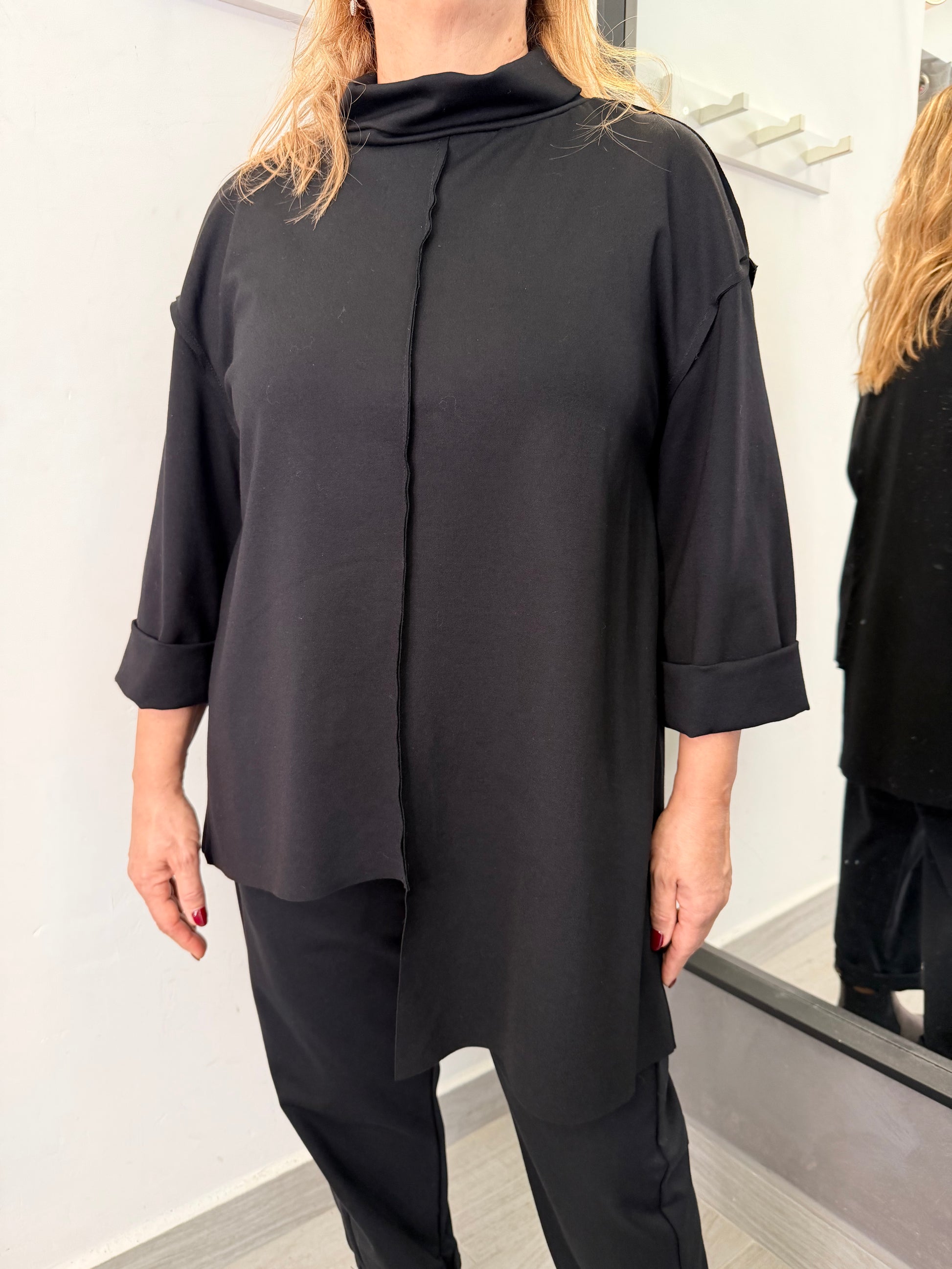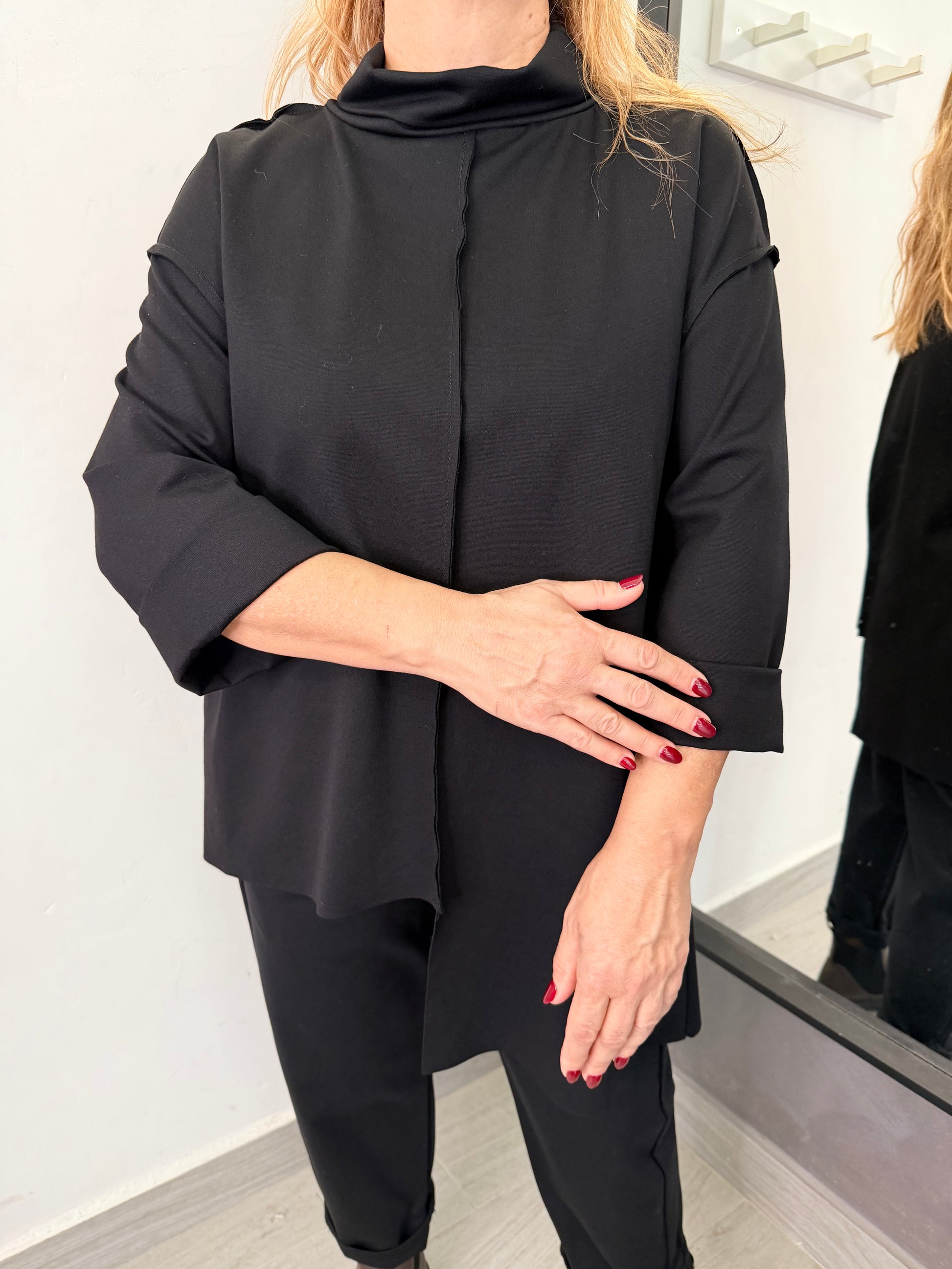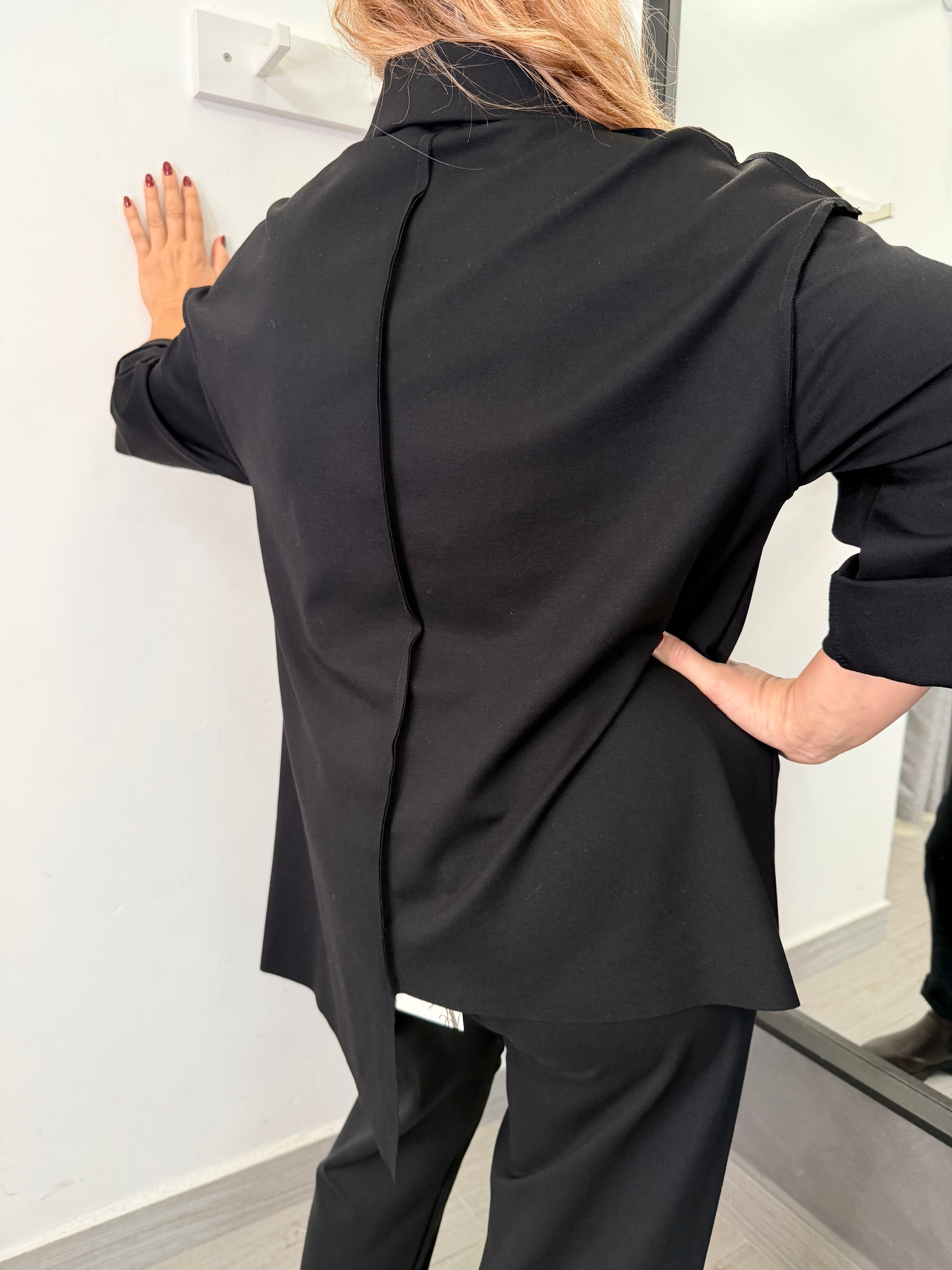 Casacca in tessuto punto Milano, taglio assimetrico, più lunga nella parte destra, manica lunga e collo ad anello, rifinito con cucitura a taglio vivo. Taglia unica veste fino ad una 46. Composizione 65% viscosa 30% poliammide 5% elastan.