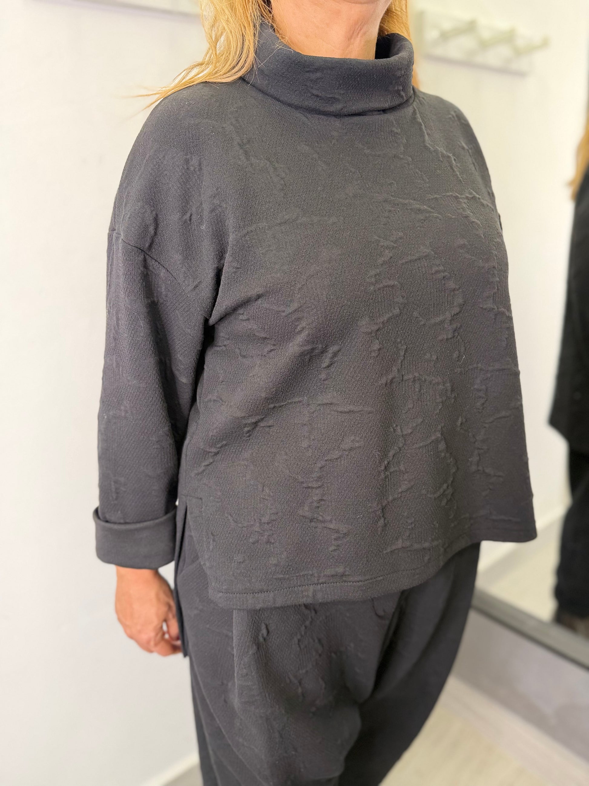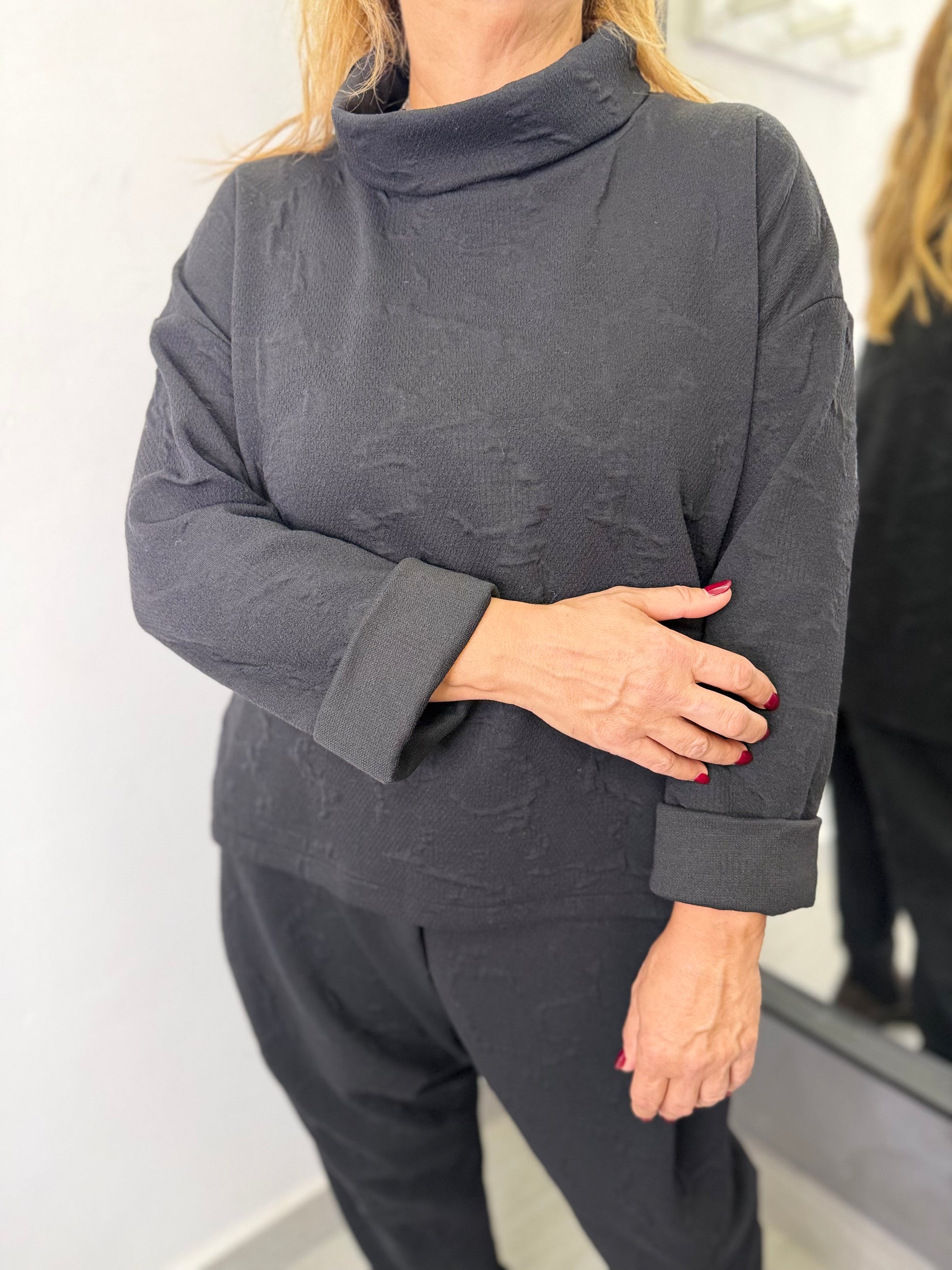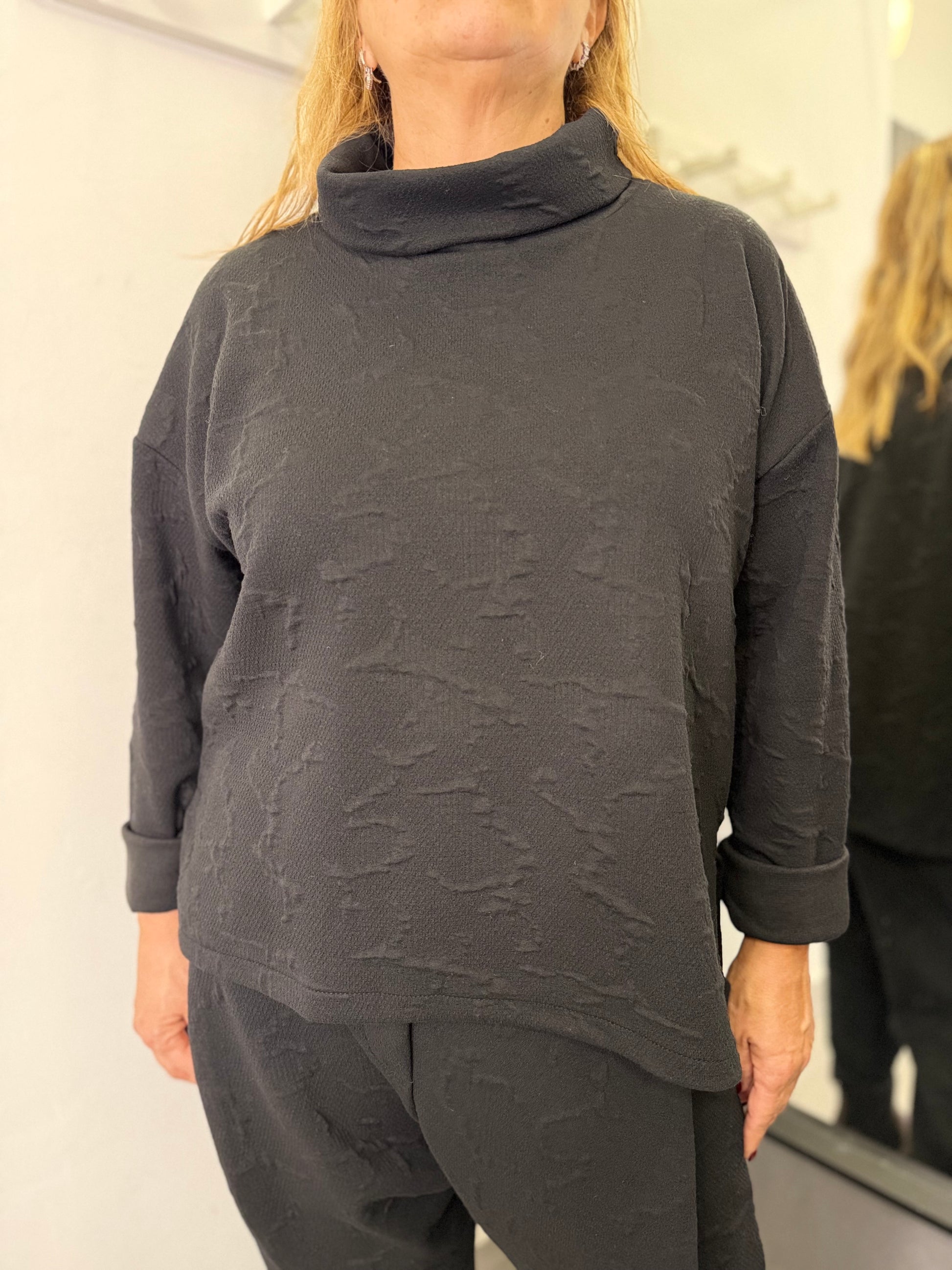 Casacca modello oversize in tessuto lavorato, collo ad anello, più lunga dietro è leggermente più corta davanti. Taglia unica veste fino ad una 48. Composizione 62% poliestere 36% cotone 2% EA
