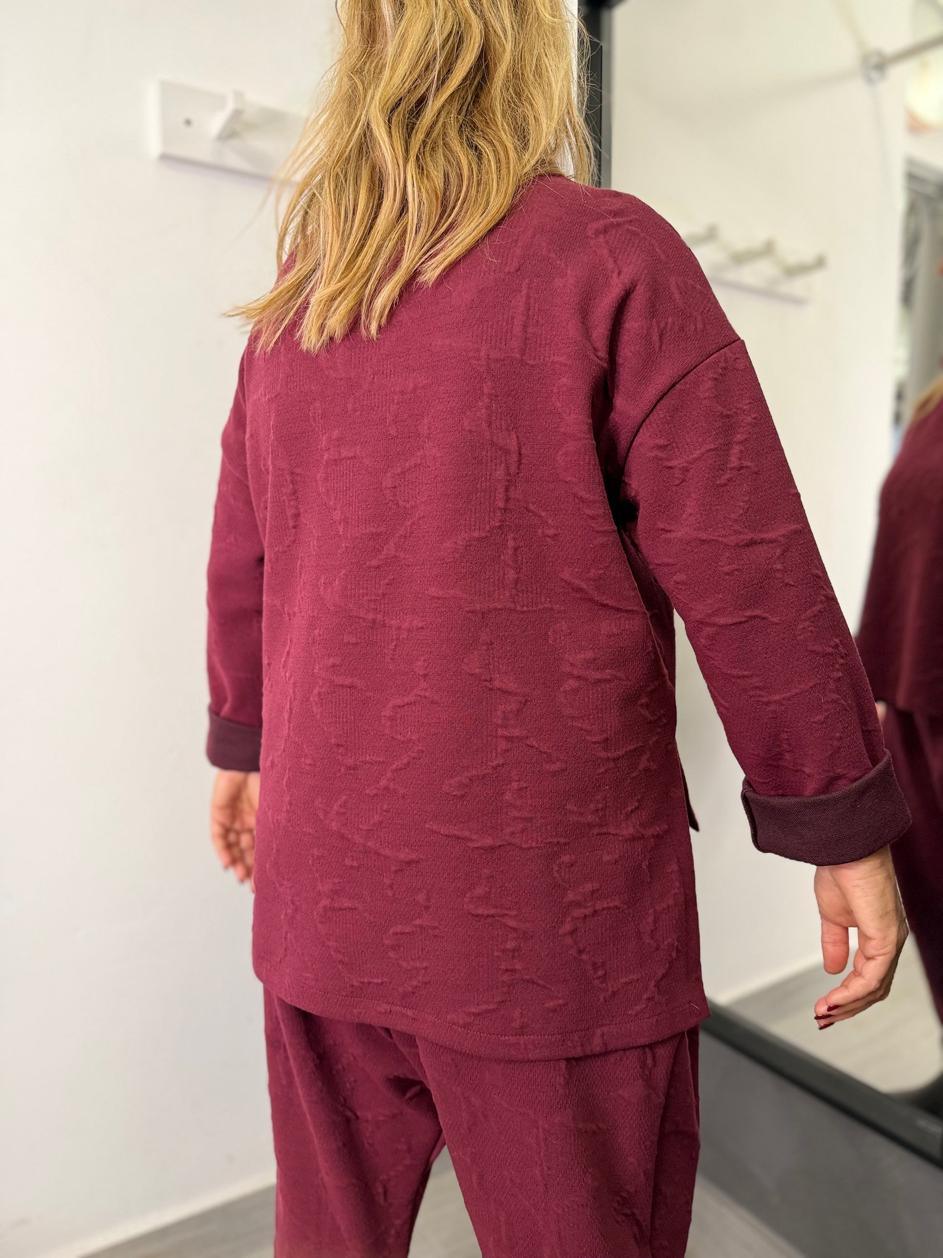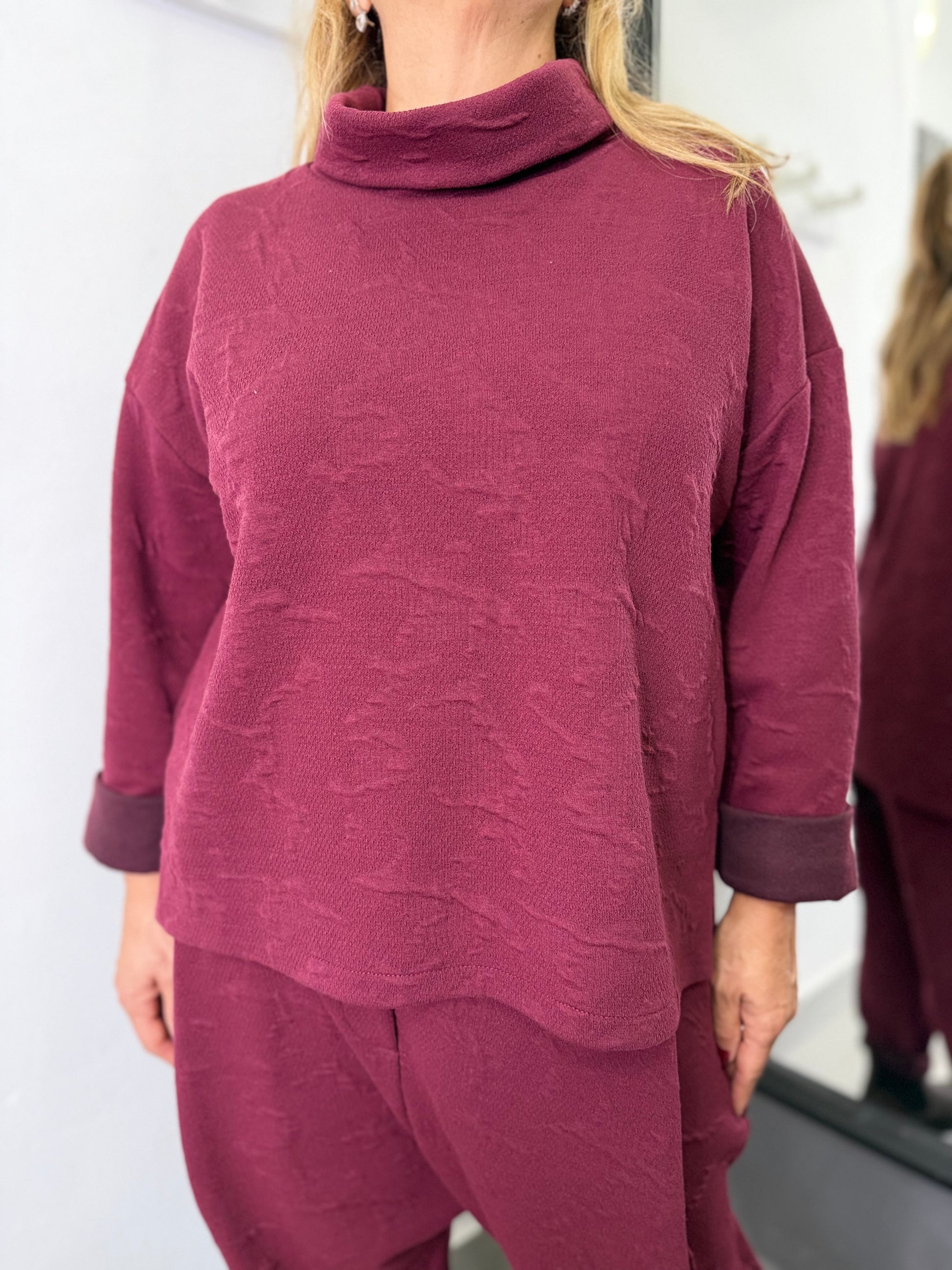 Casacca modello oversize in tessuto lavorato, collo ad anello, più lunga dietro è leggermente più corta davanti. Taglia unica veste fino ad una 48. Composizione 62% poliestere 36% cotone 2% EA