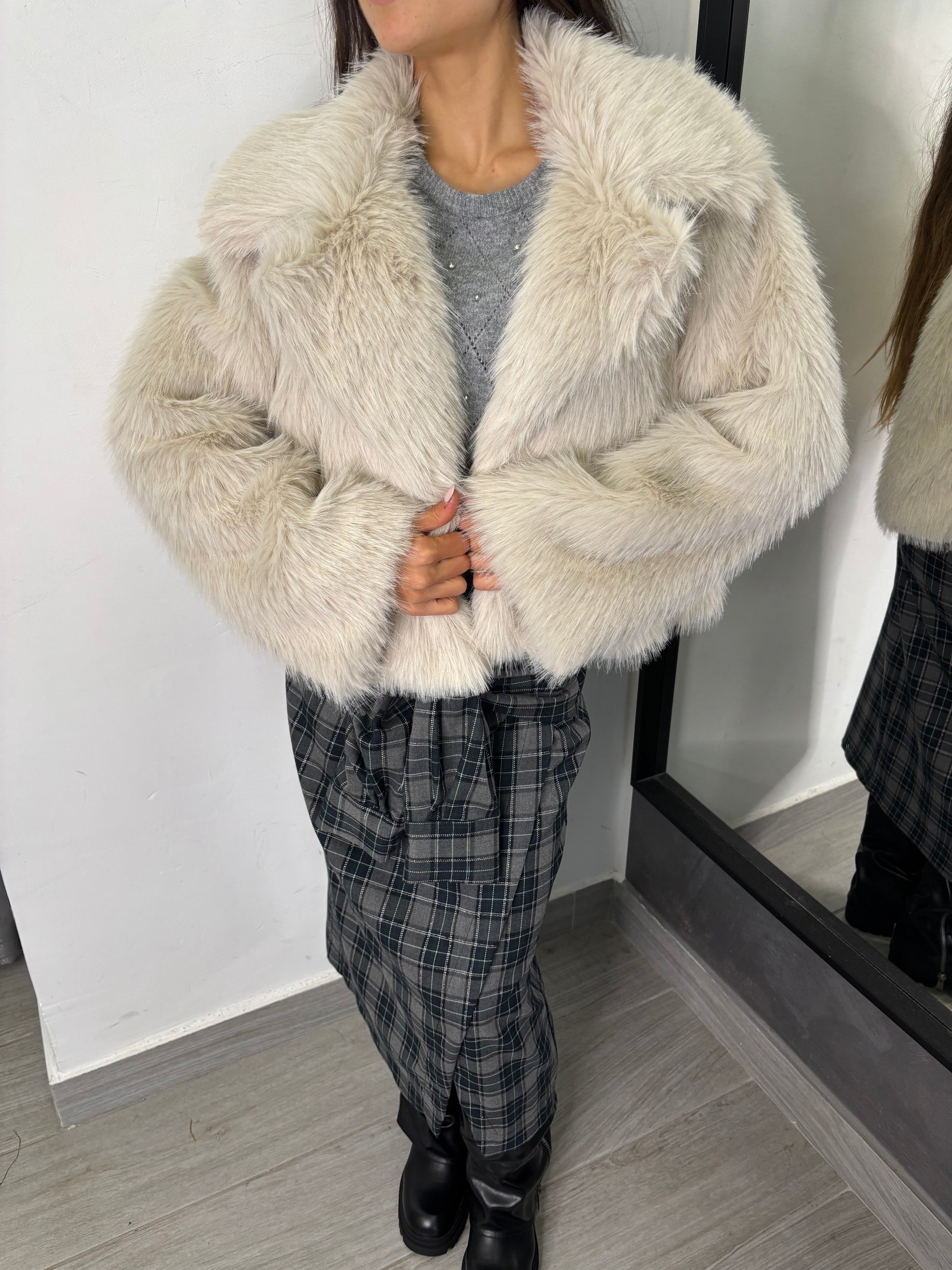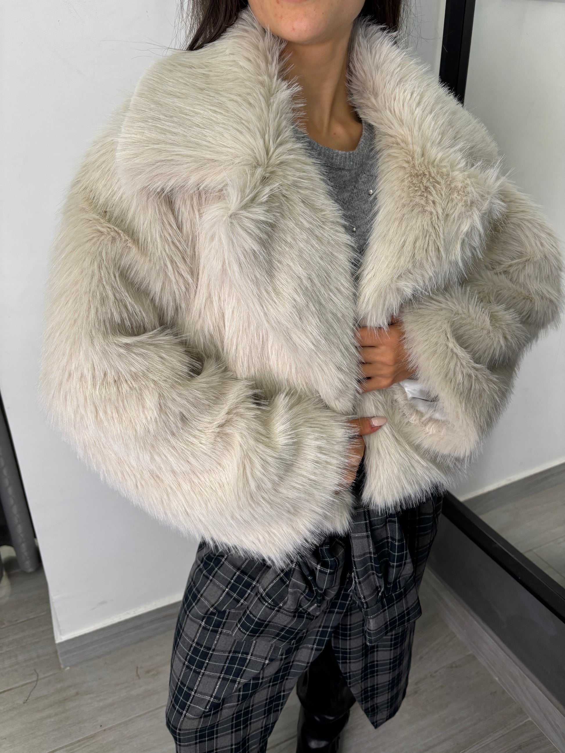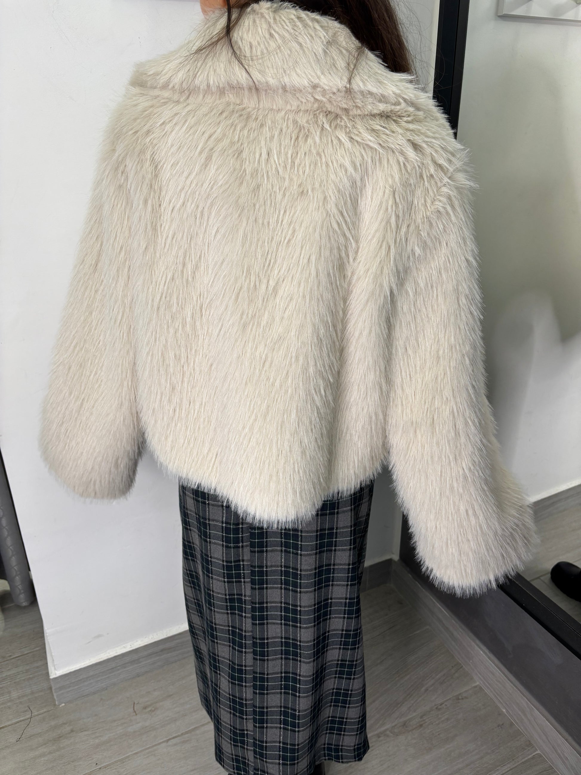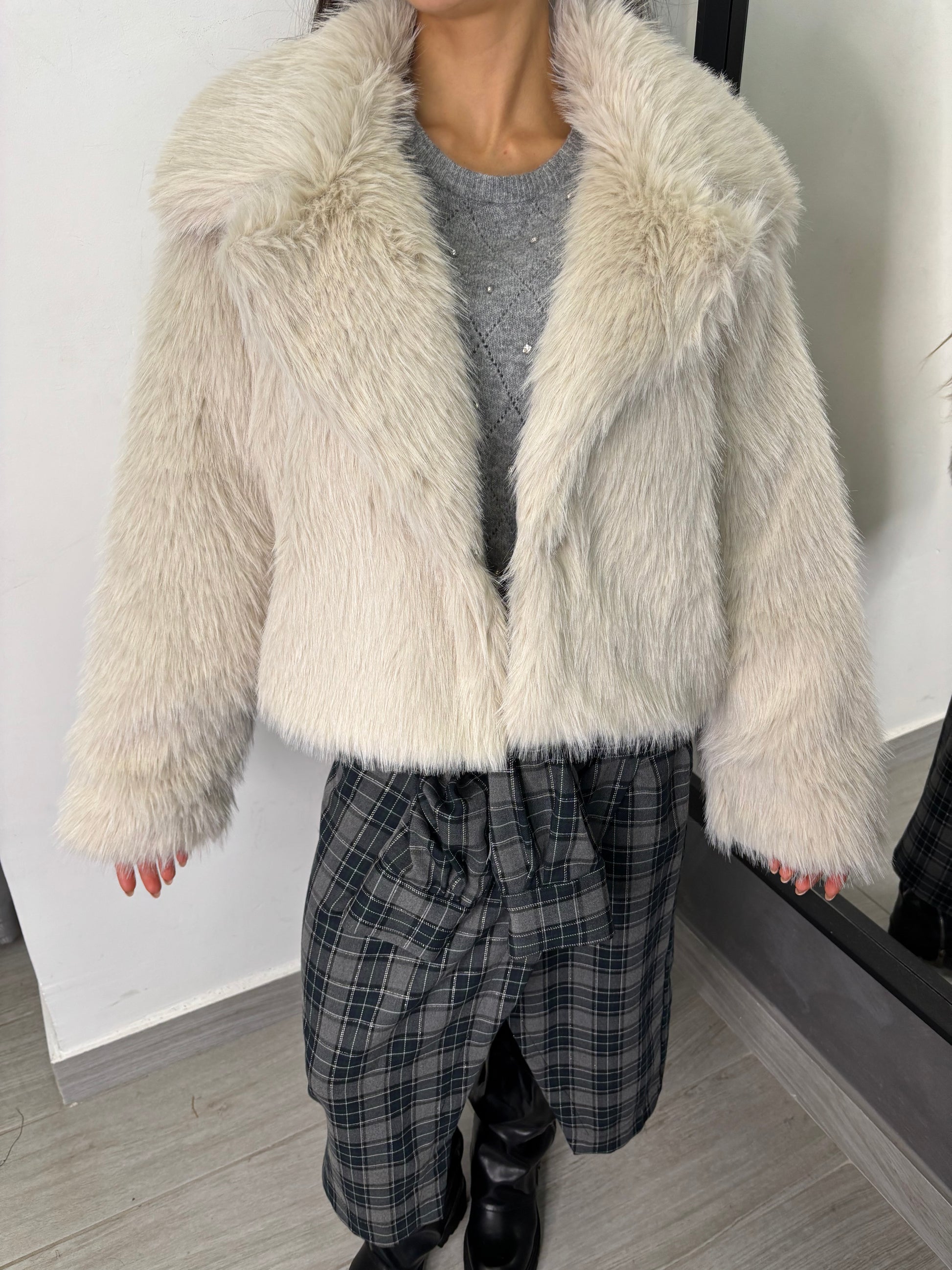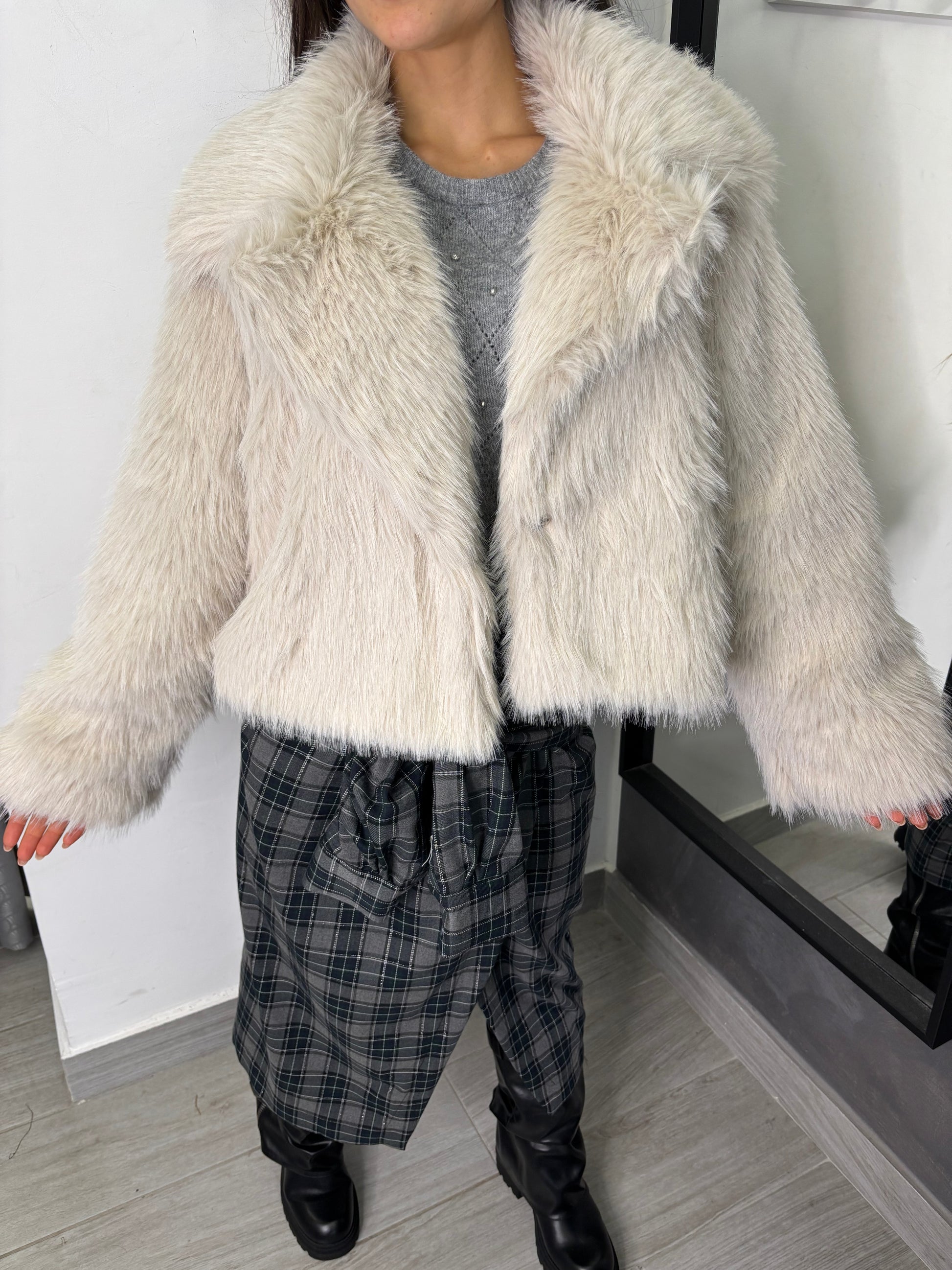 Giacca in eco pelliccia con collo a reverse. Taglia unica veste fino ad una 46.