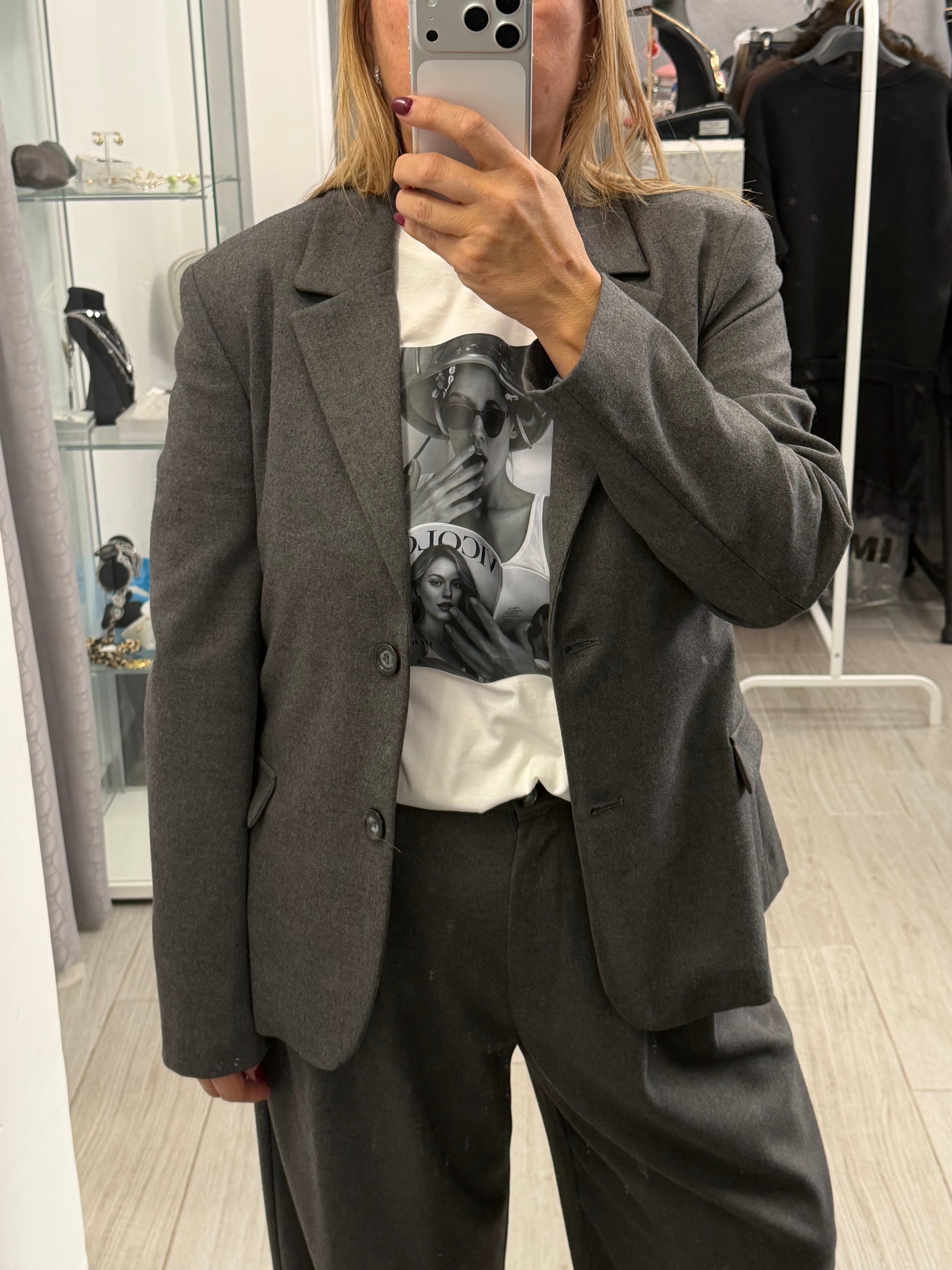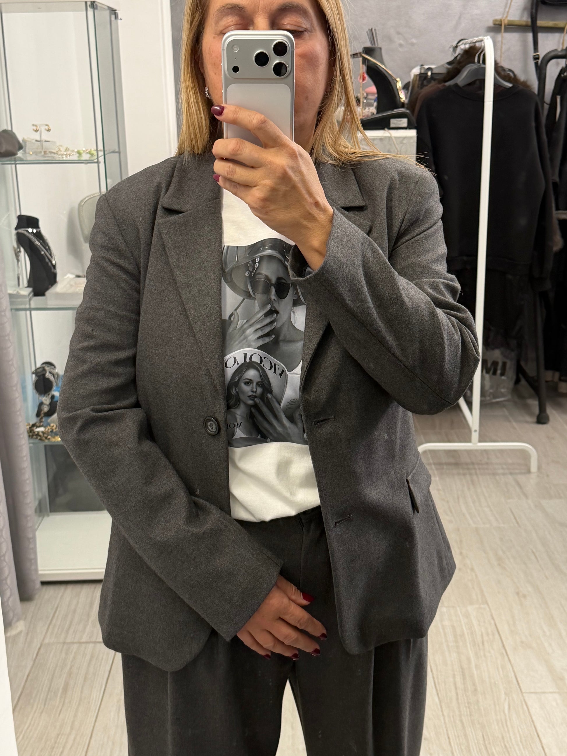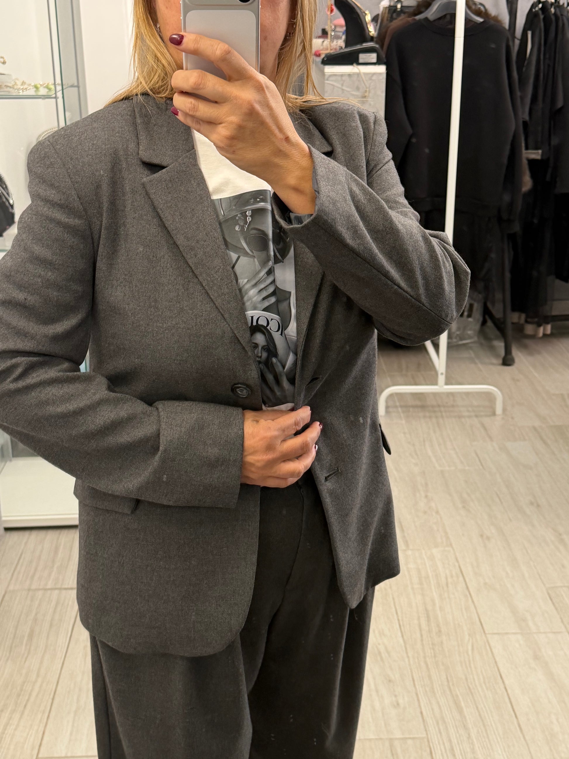 Giacca con due bottoni frontali, collo a reverse finte tasche. Composizione 65% poliestere 33% viscosa 2% elastan