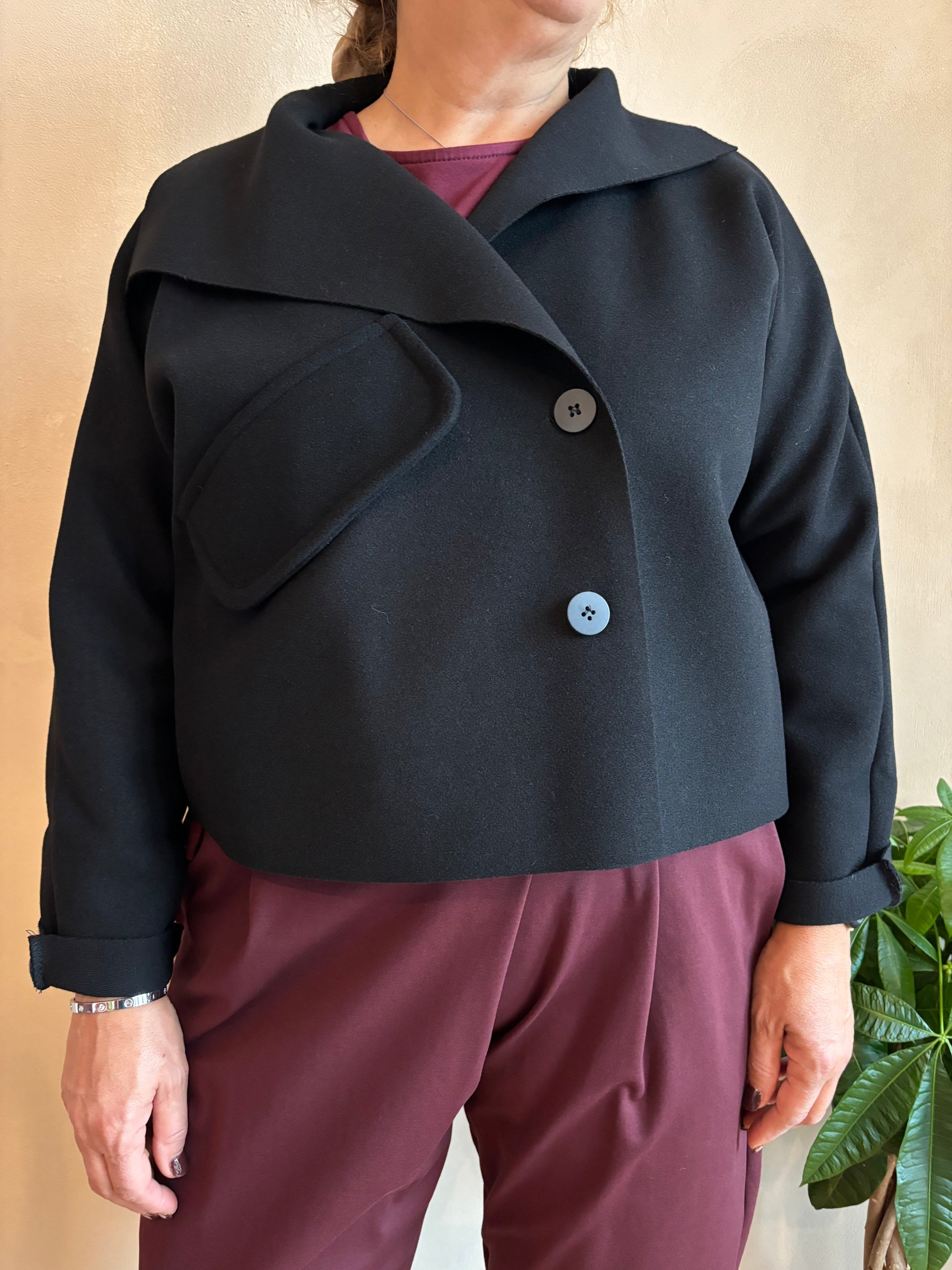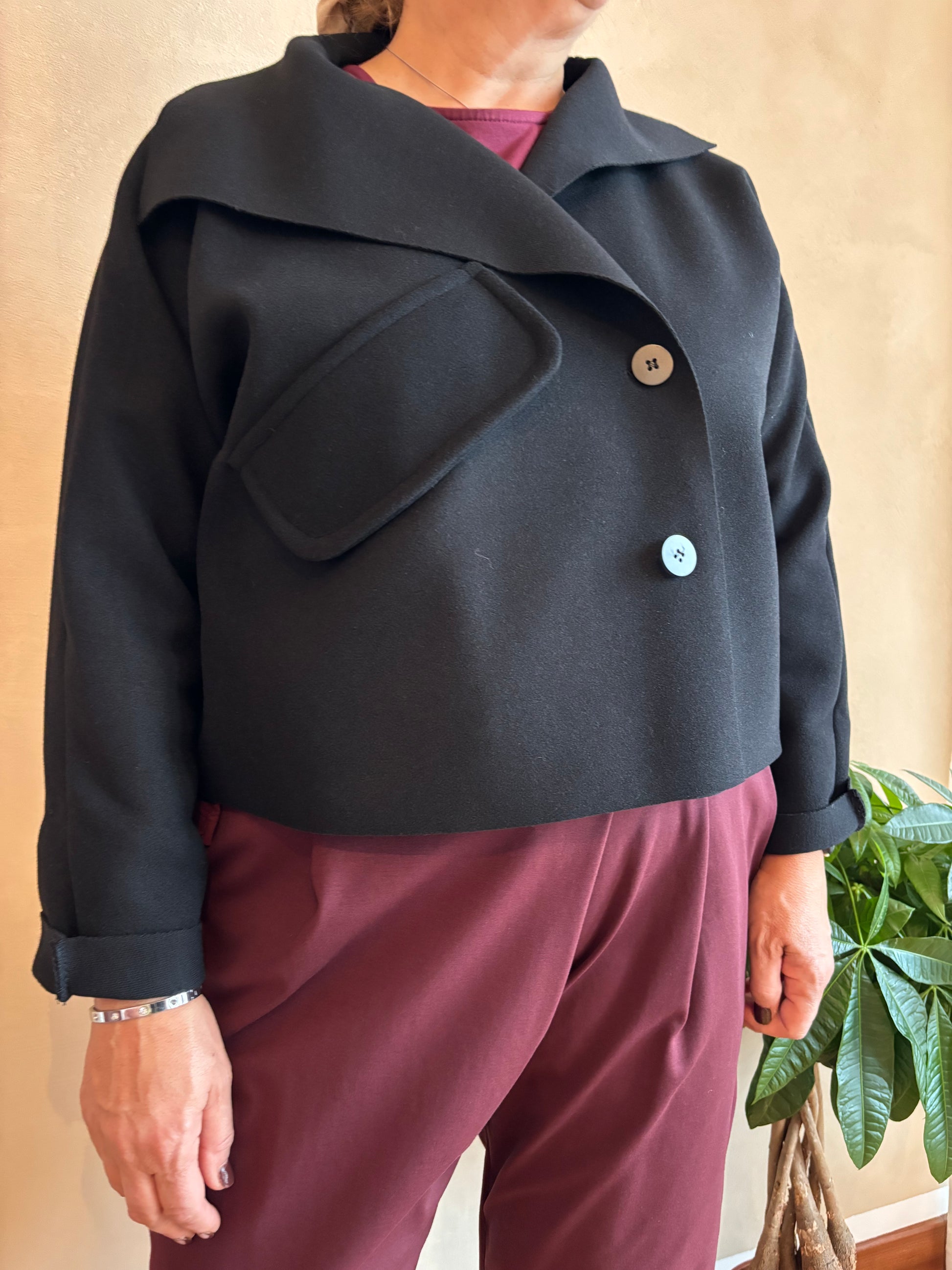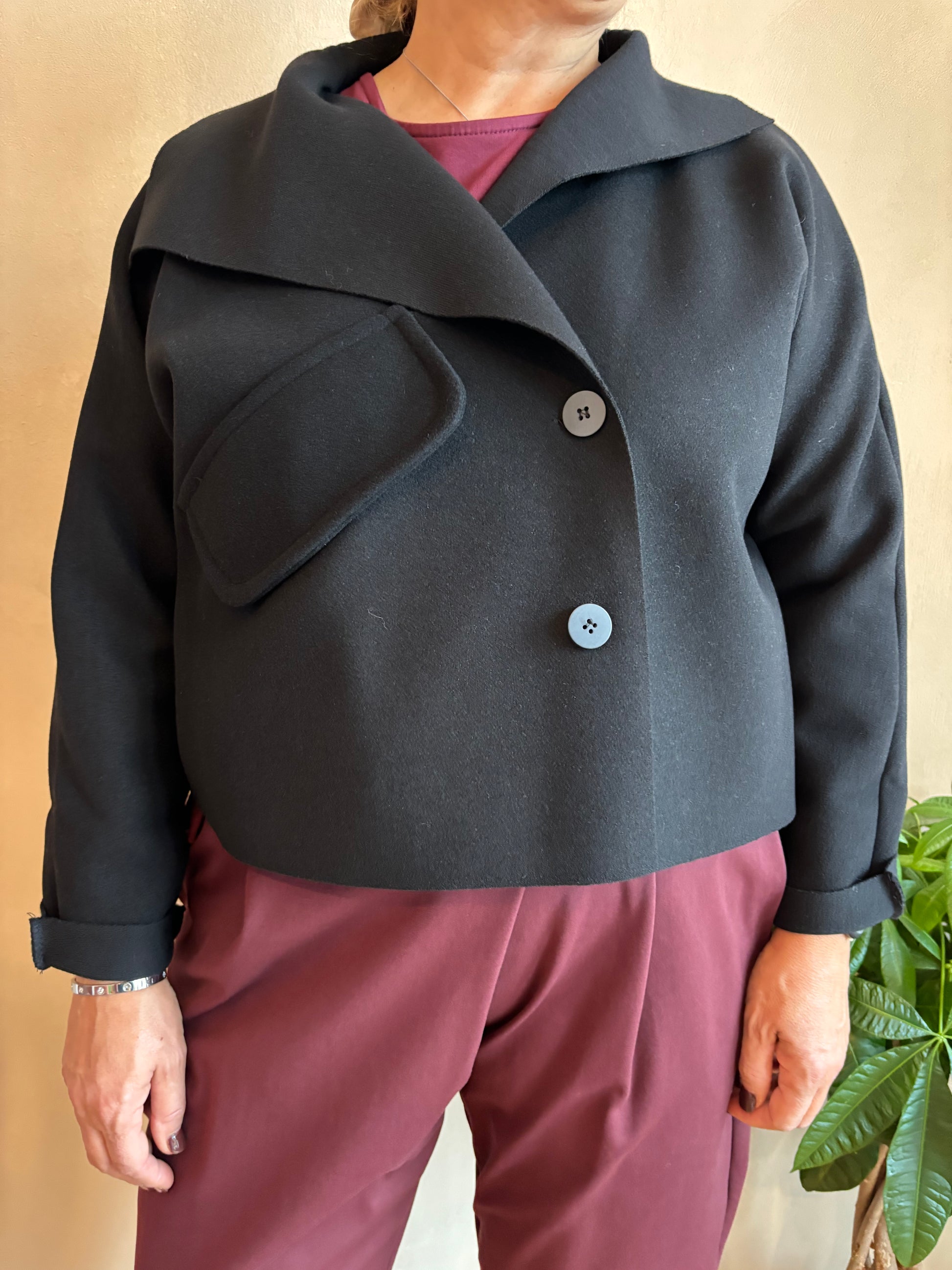 Giacca un tessuto simil panno con collo a reverse. Finta tasca nella parte destra. Taglia unica veste fino ad una 46.