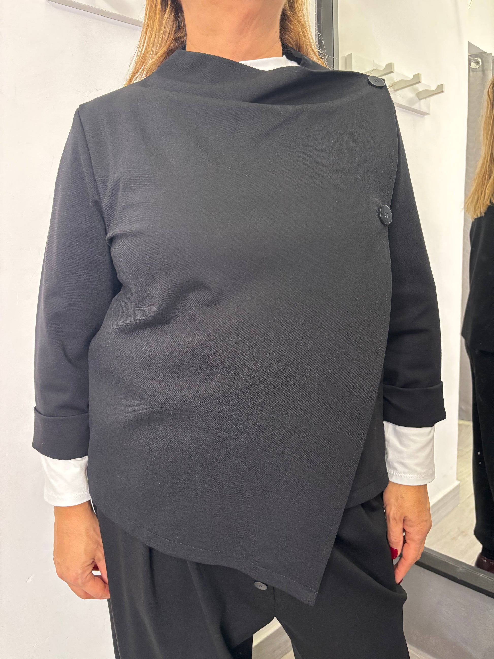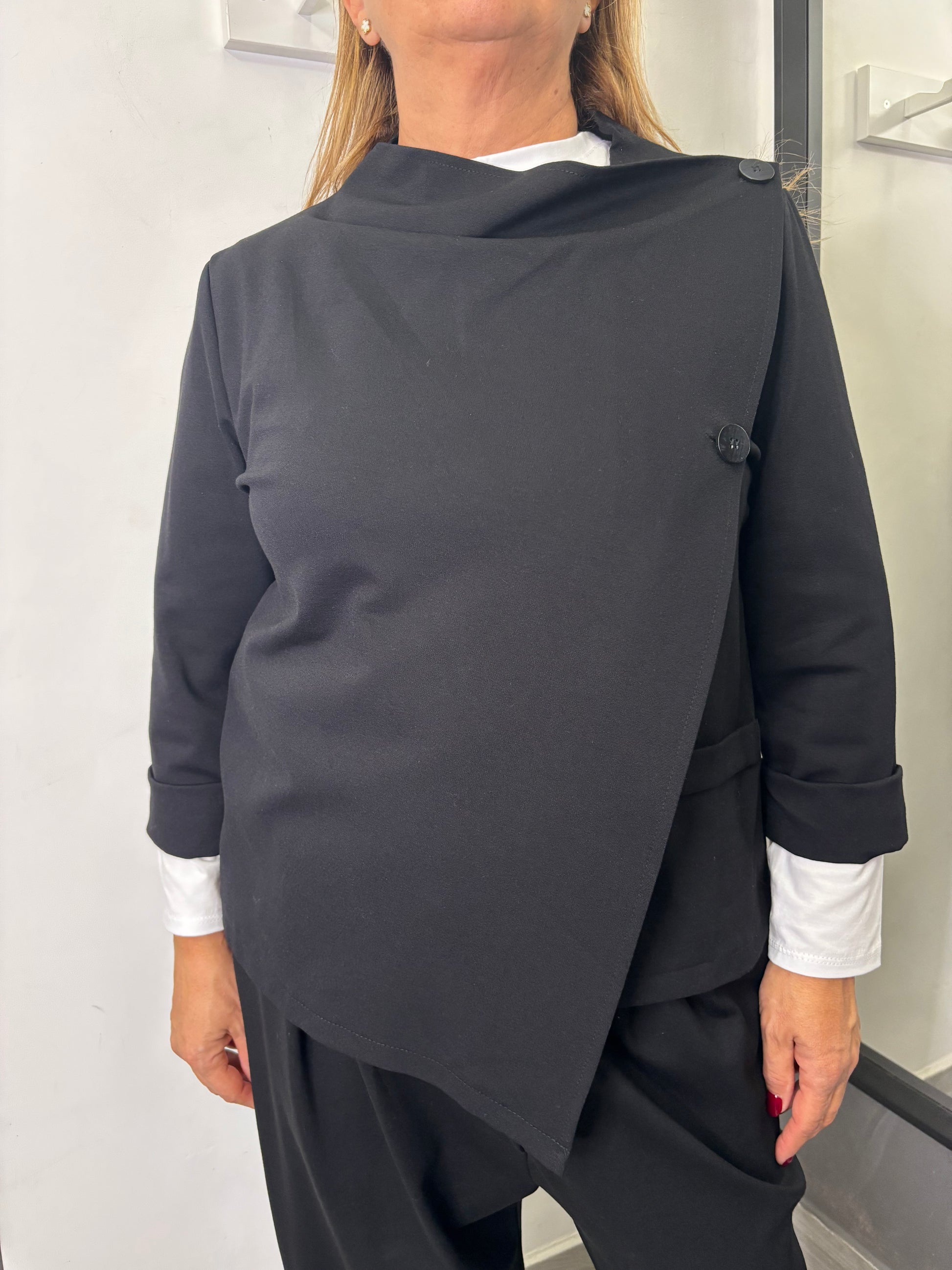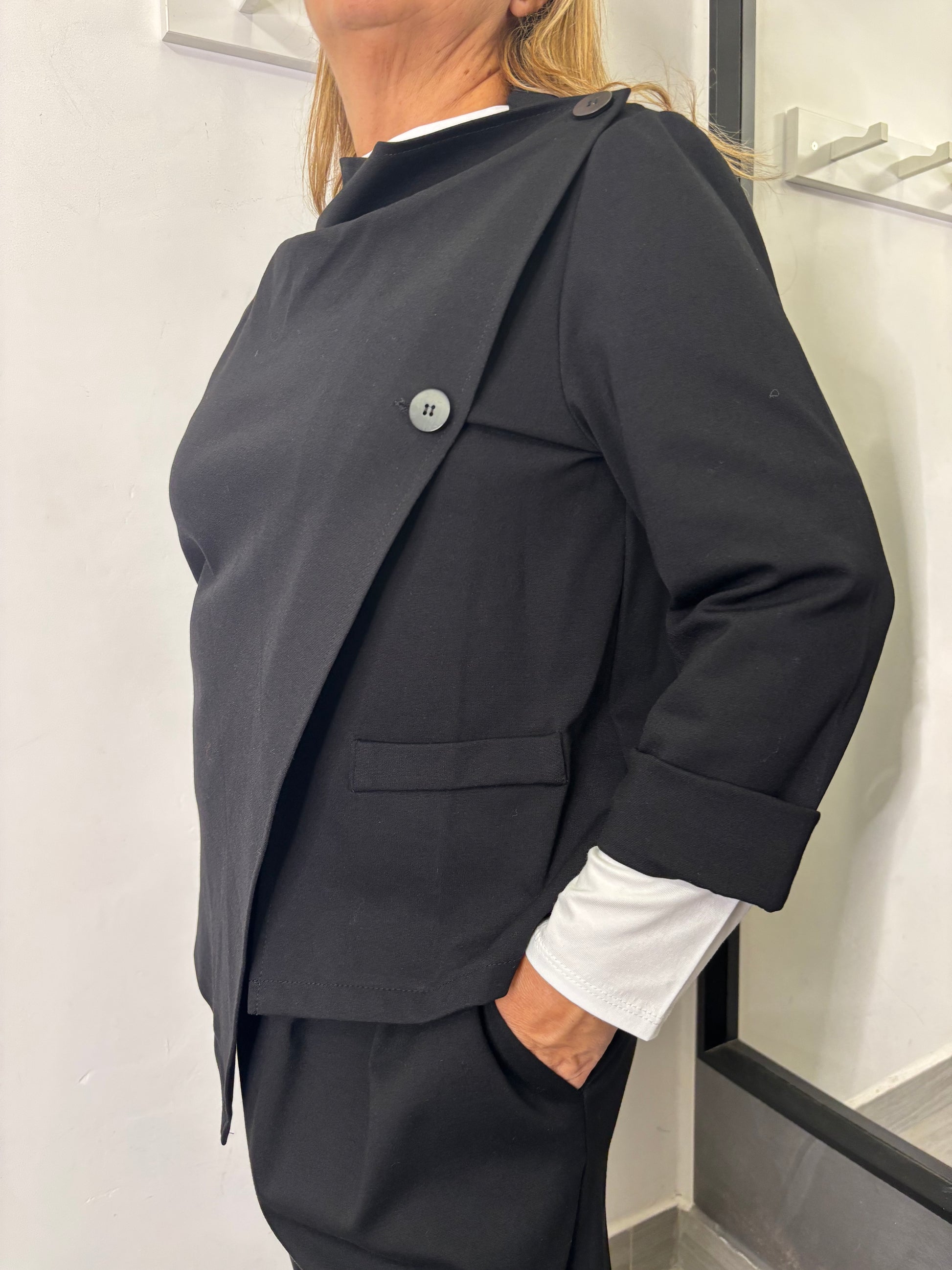Giacca in tessuto punto Milano. Abbottonatura laterale, collo ad anello. Presenta una punta più lunga nella parte sinistra. Taglia unica veste fino ad una 46. Composizione 65% viscosa 30% poliammide 5% elastan