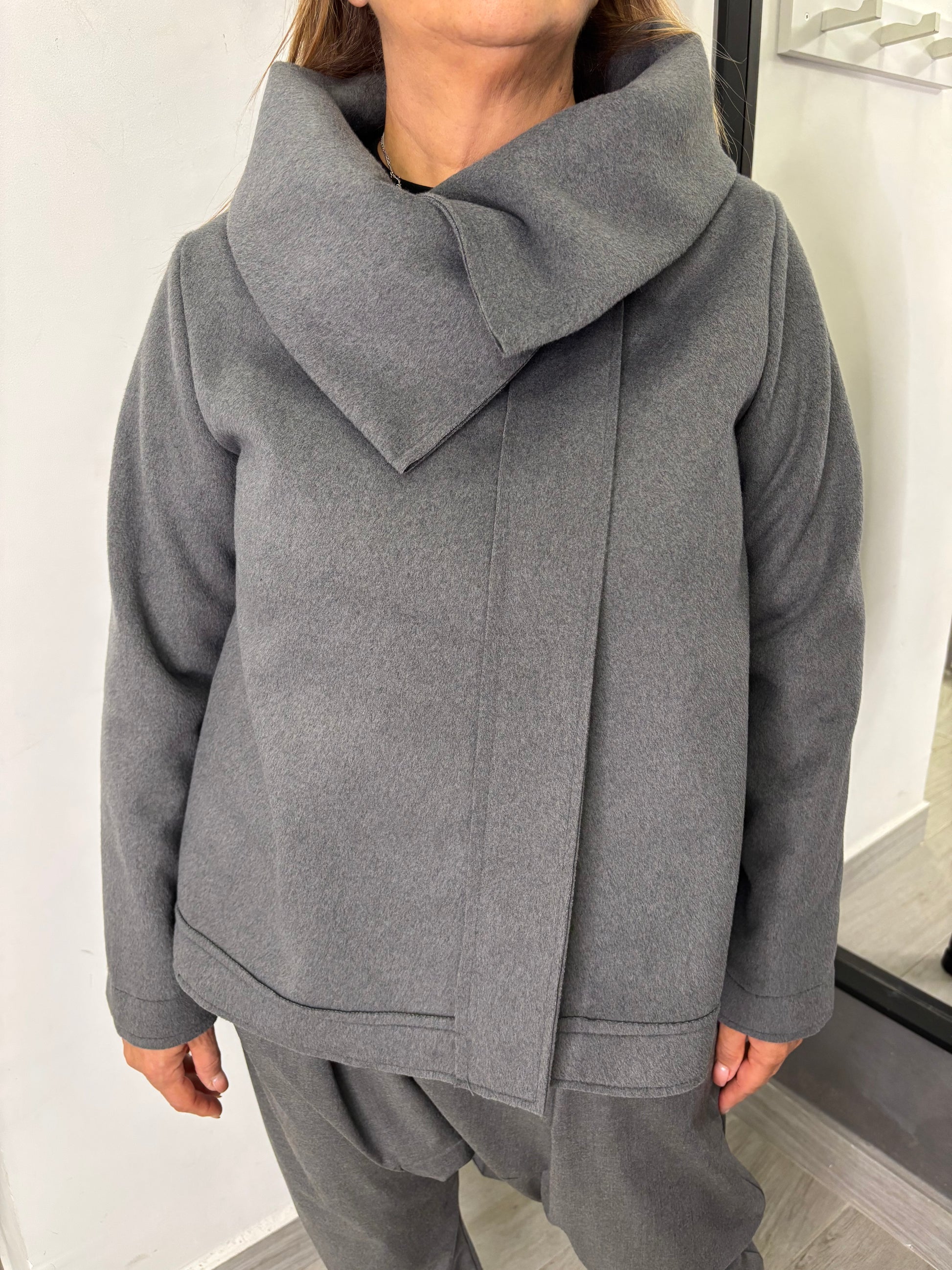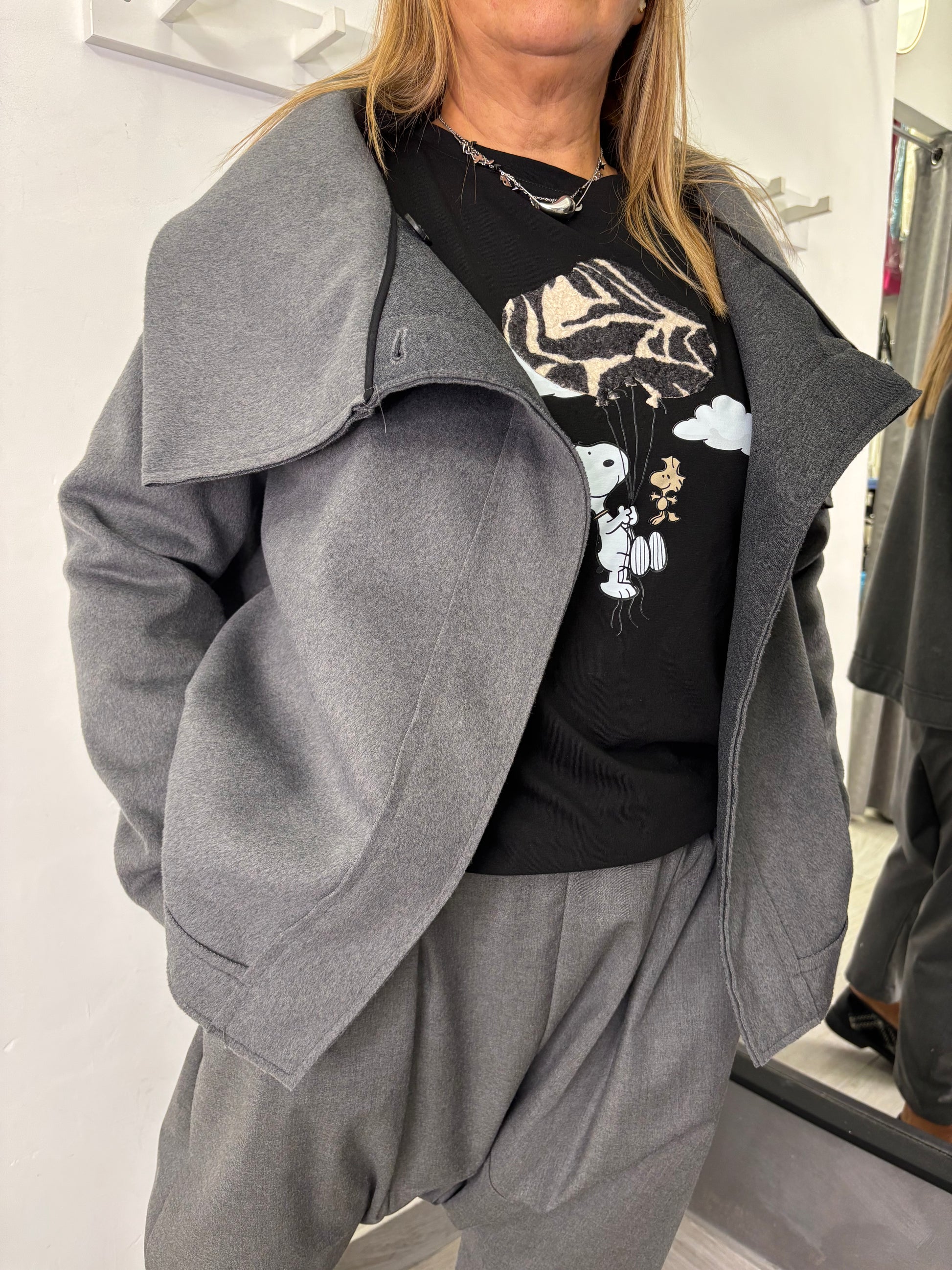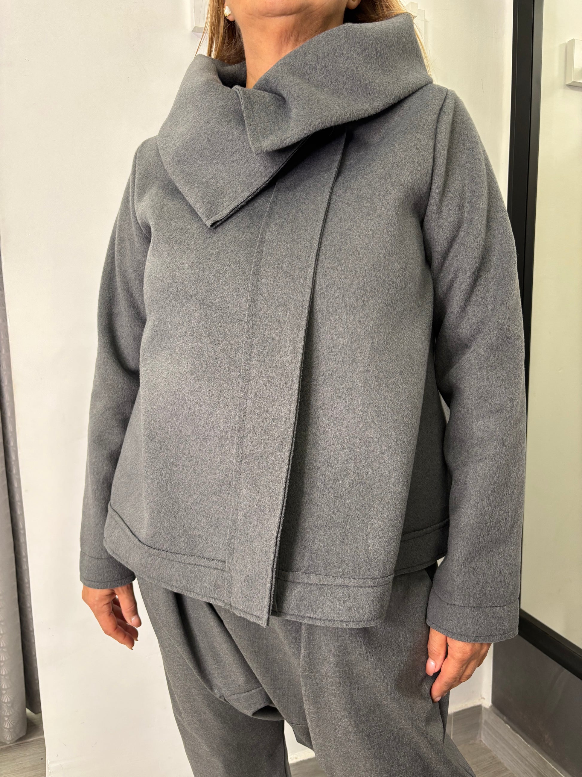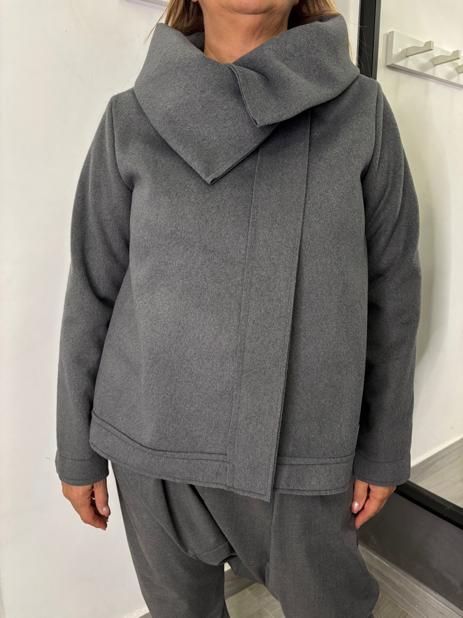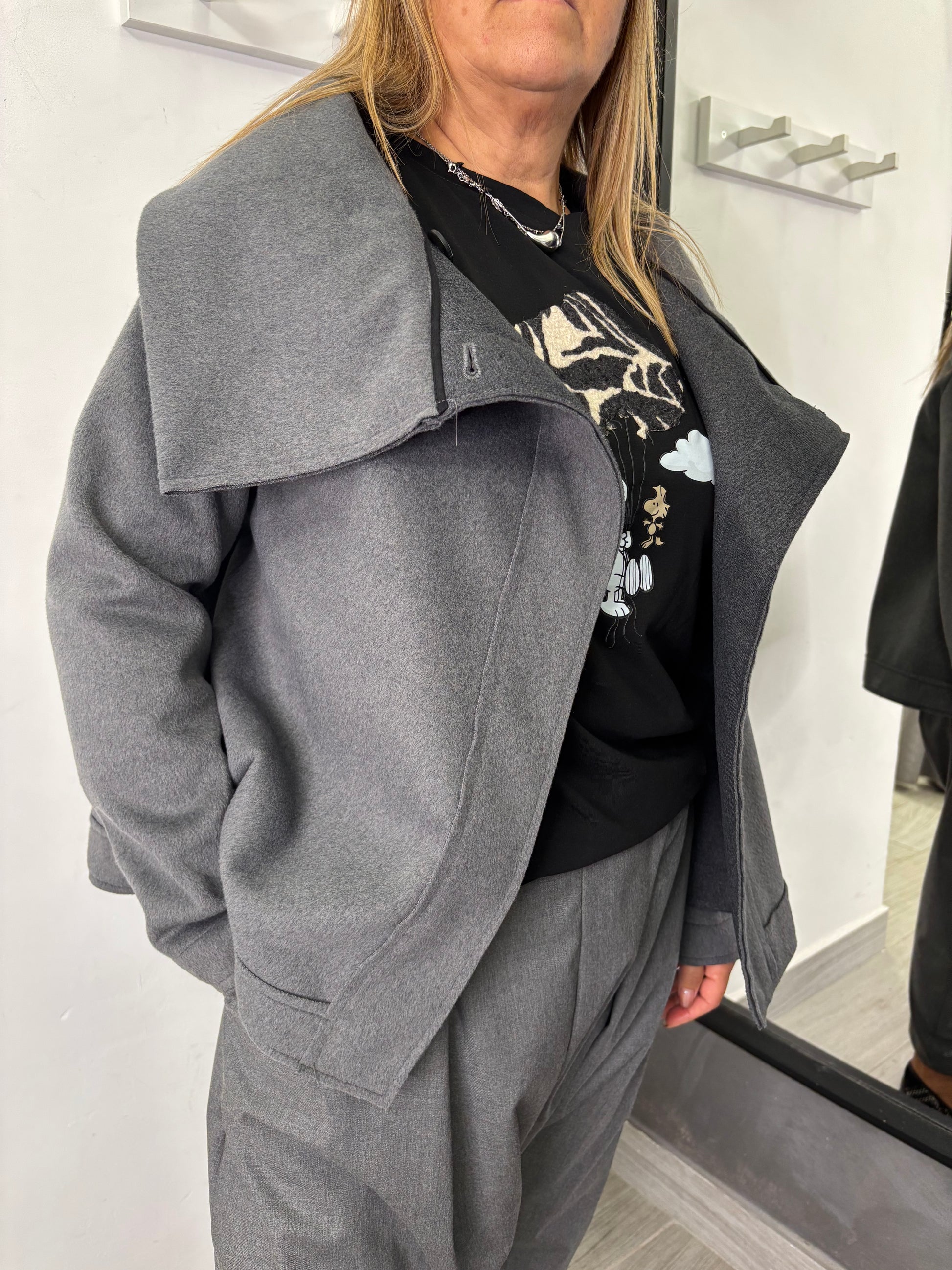 Giacca in simil panno con collo ad anello, abbottonatura a doppio petto, leggermente svasata sul fondo. Taglia unica veste fino ad una 46. Composizione 100% poliestere