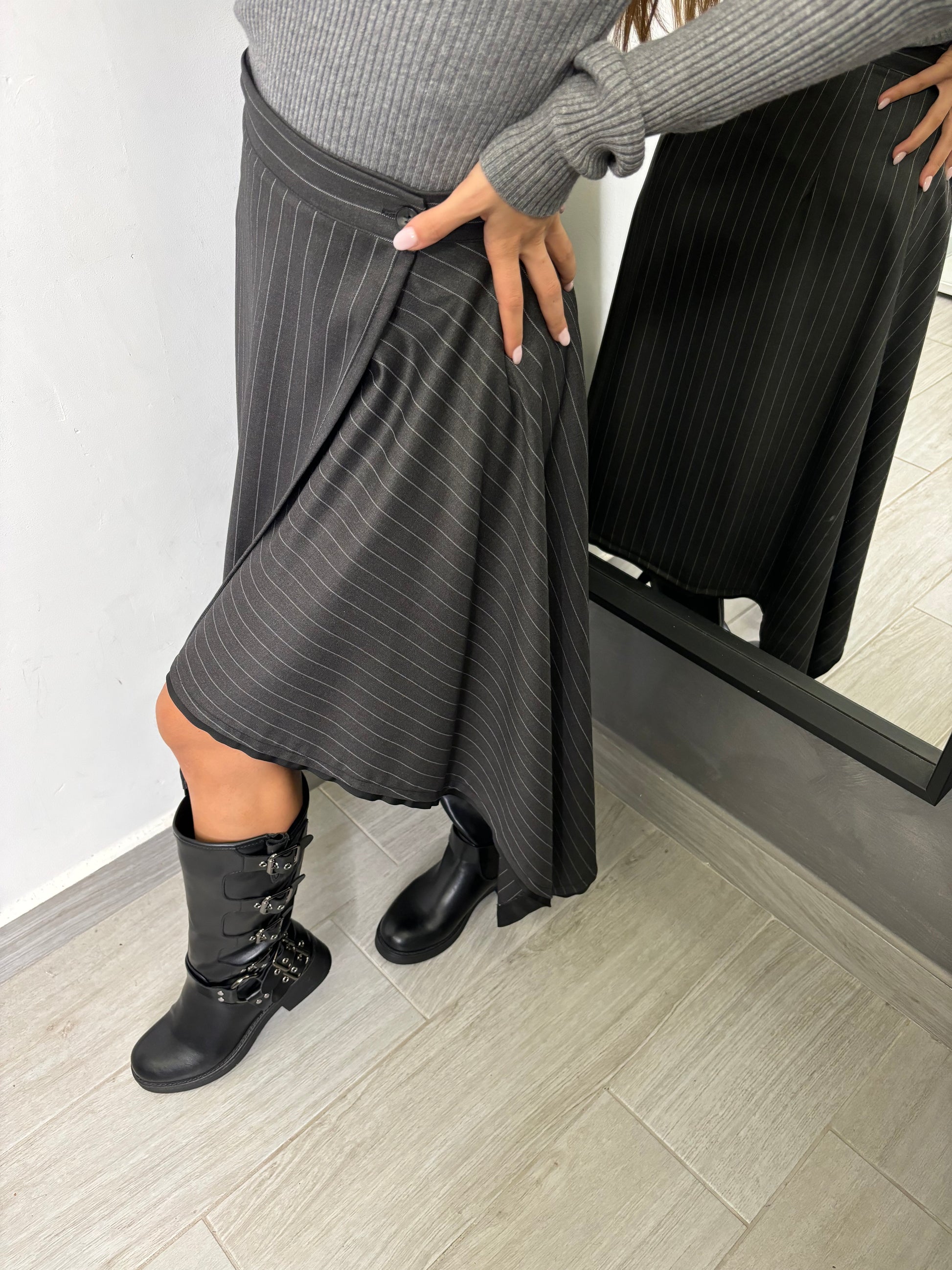 Gonna a portafoglio in tessuto gessato con punta nella parte sinistra.
