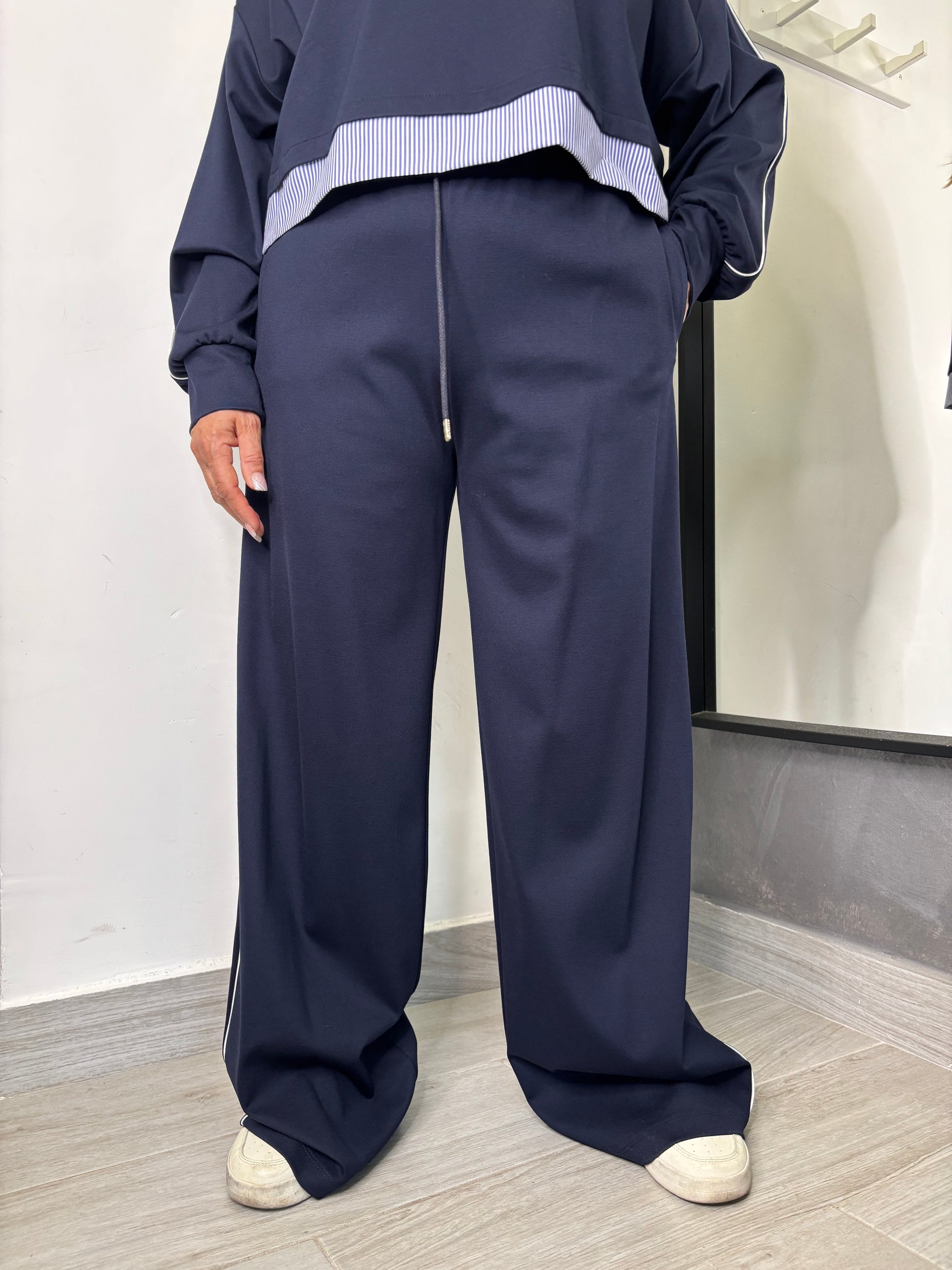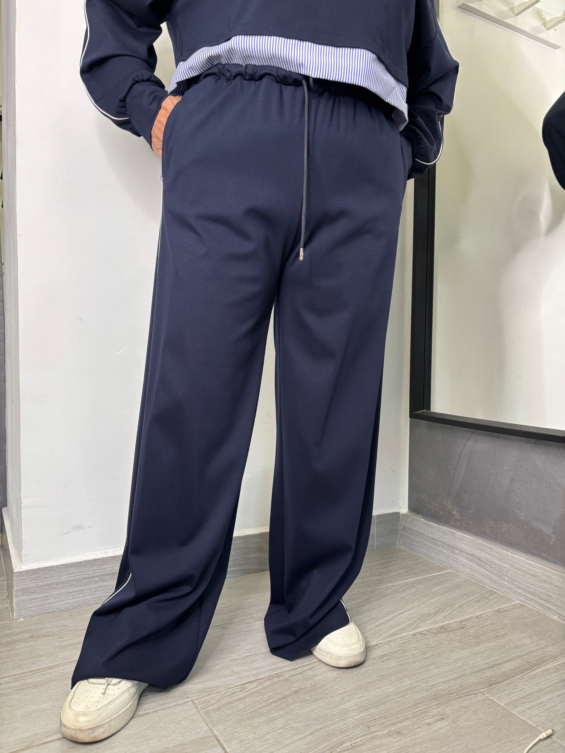 Joggers tinta unita, caratterizzati da un orlo superiore in fantasia a righe, coulisse e striscia laterale a contrasto.
