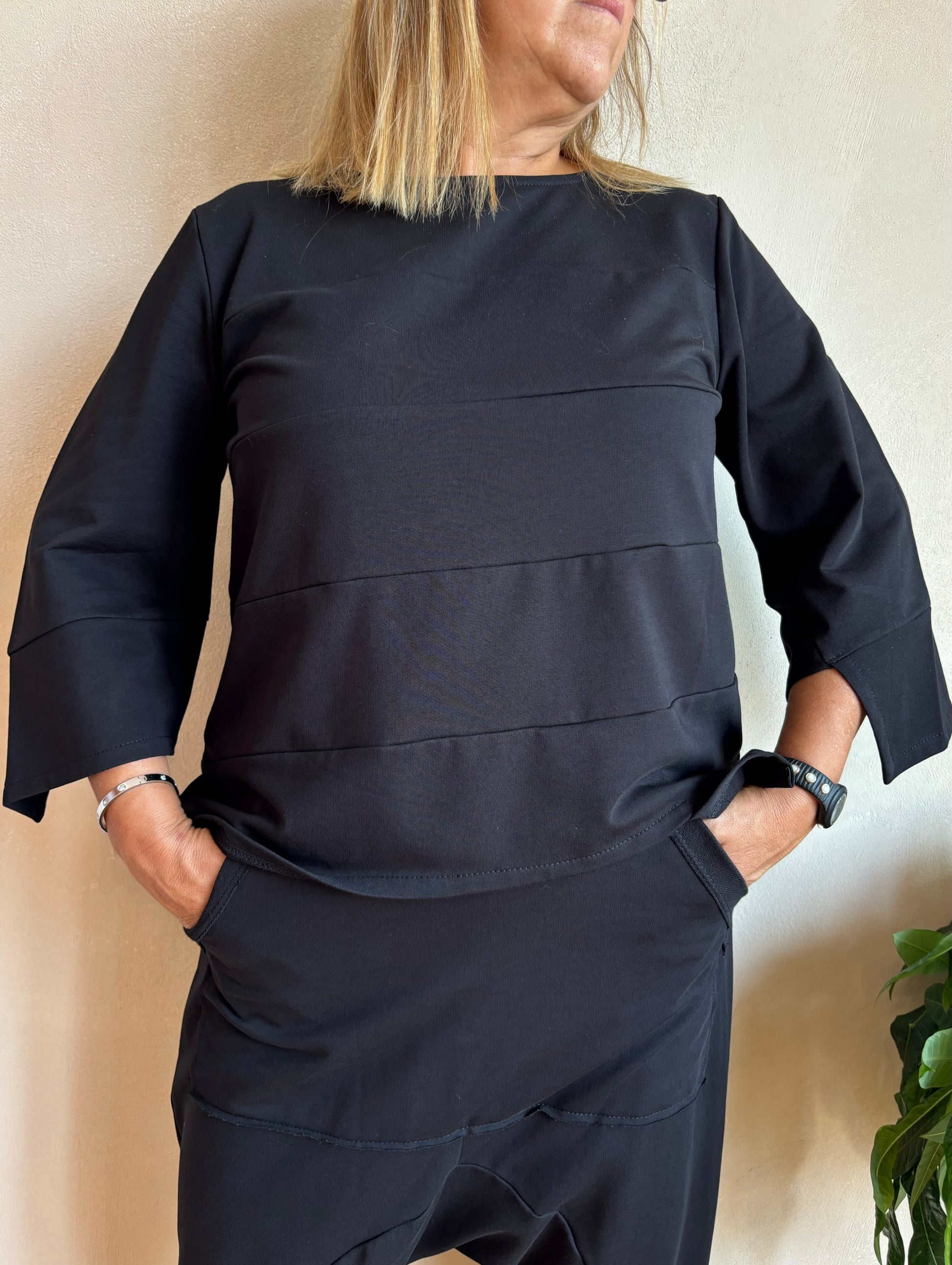 Maglia in cotone garzato, giro collo con cuciture sia davanti che dietro con taglio assimetrico, dettaglio di una leggera punta sulla manica. Taglia unica veste fino ad una 46/48. Composizione 95% cotone 5% elastan.