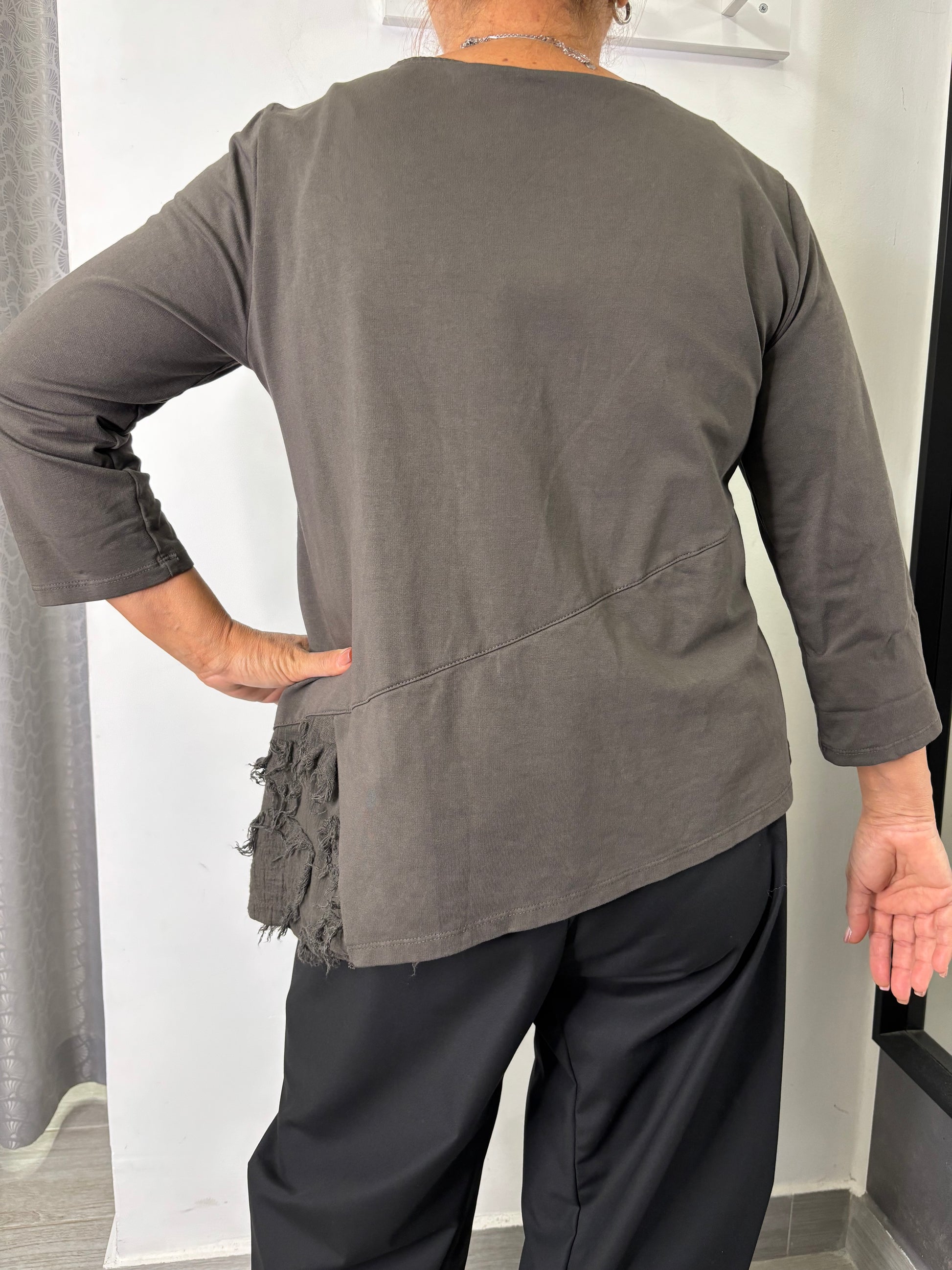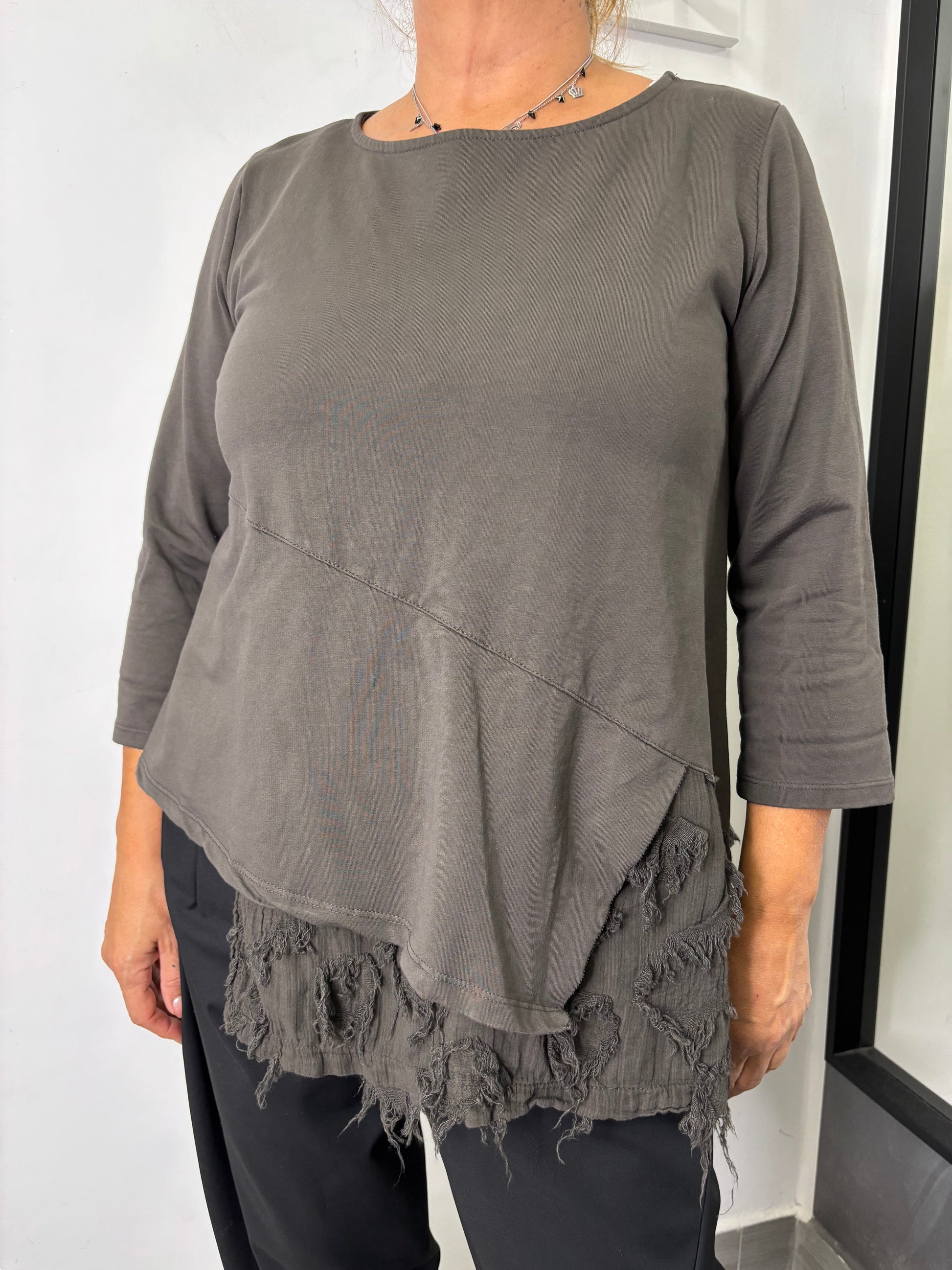 Maglia in tessuto a giro collo, manica 3/4, presenta nella parte sinistra sia davanti che dietro un inserto di tessuto lavorato e sfilacciato. Taglia unica veste fino ad una 46.
