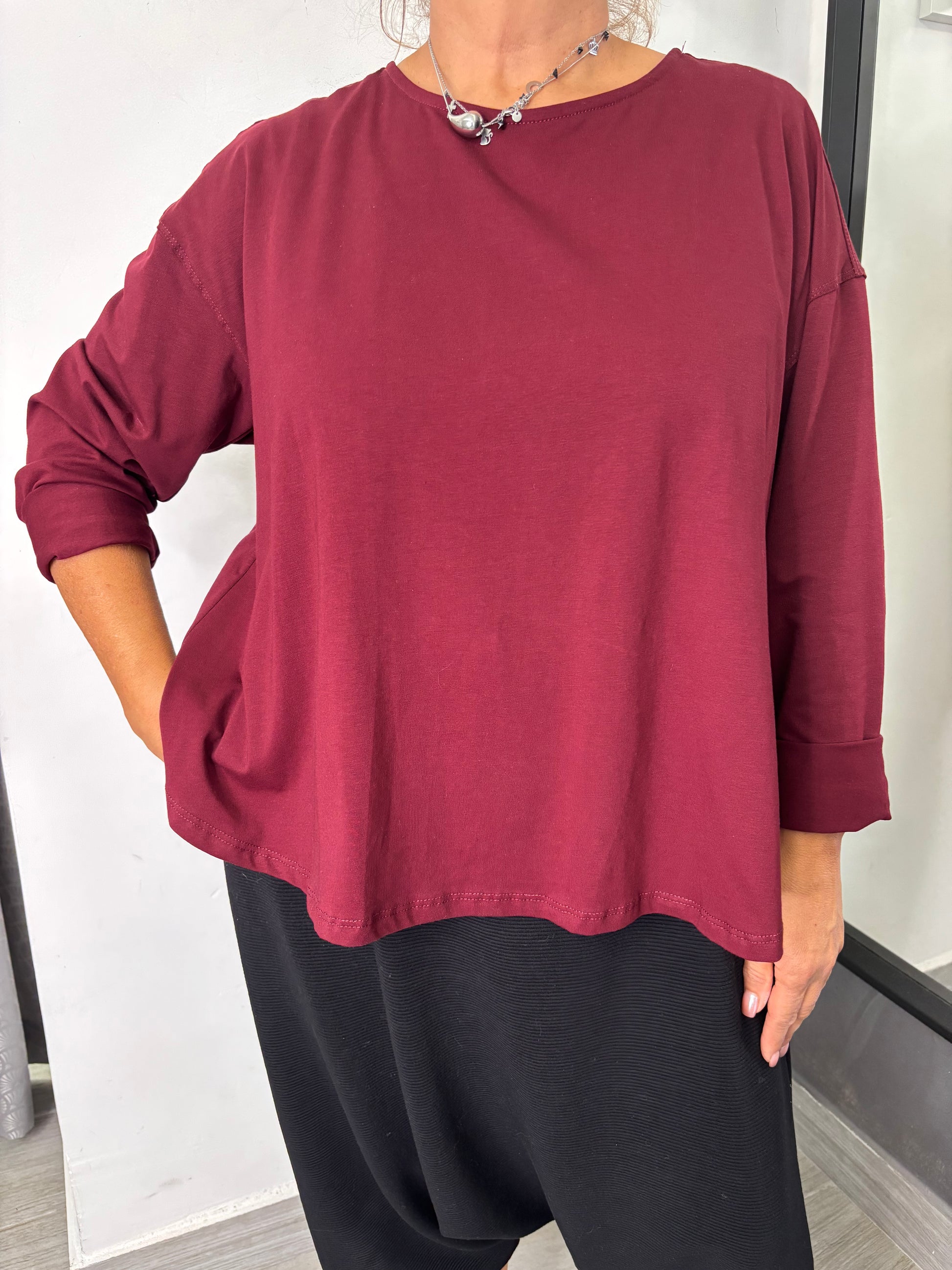 Maglia a giro collo con spalla che scende e manica lunga. Leggermente più corta davanti e più lunga dietro, dettaglio taglio dietro da dove parte l’arricciatura. Taglia unica veste fino ad una 48. Composizione 94% cotone 6% elastan.