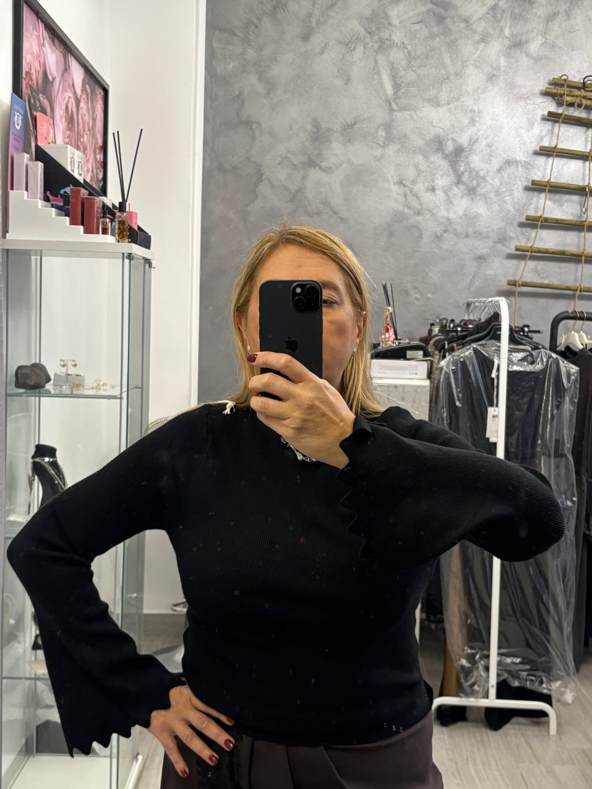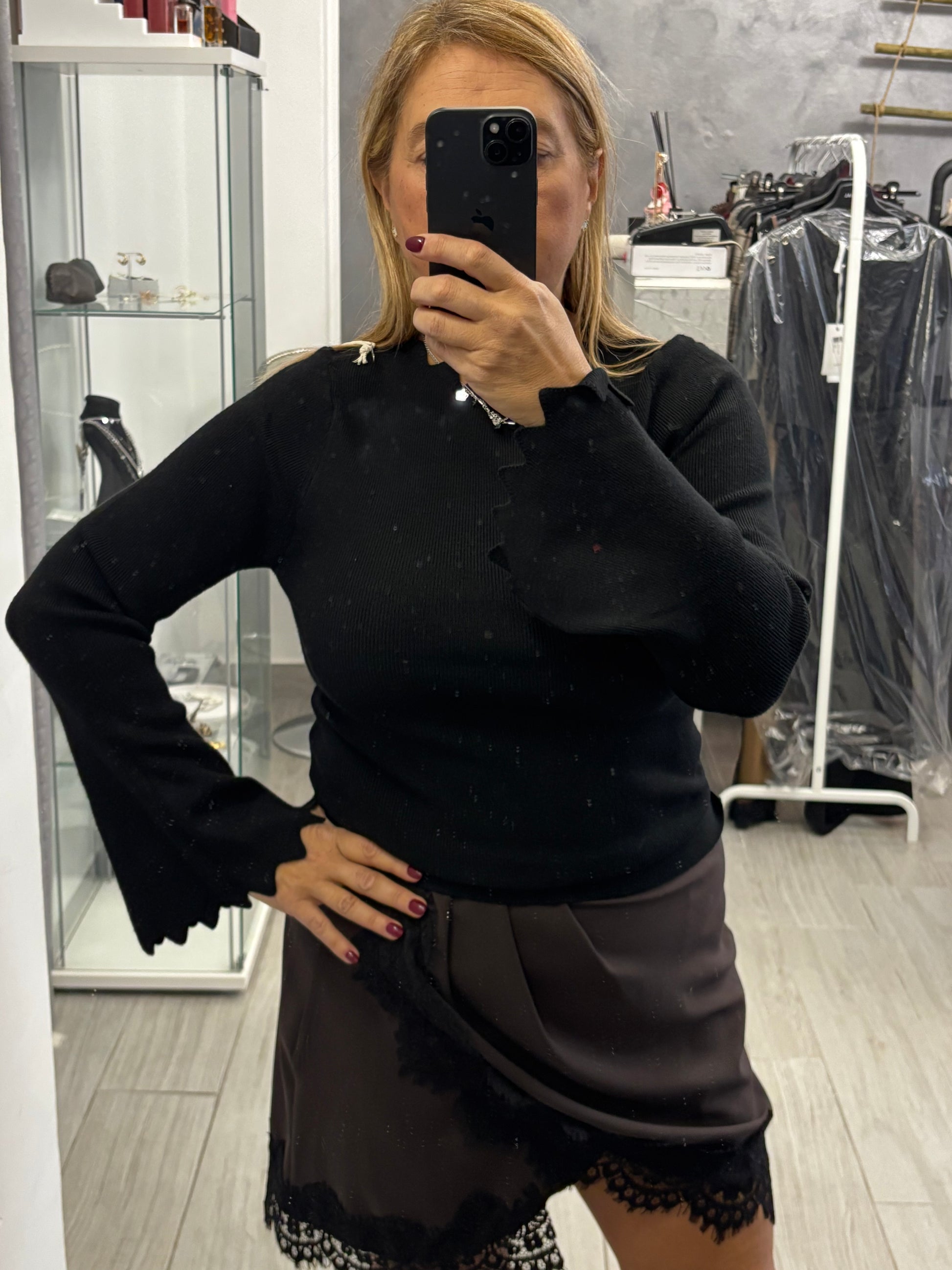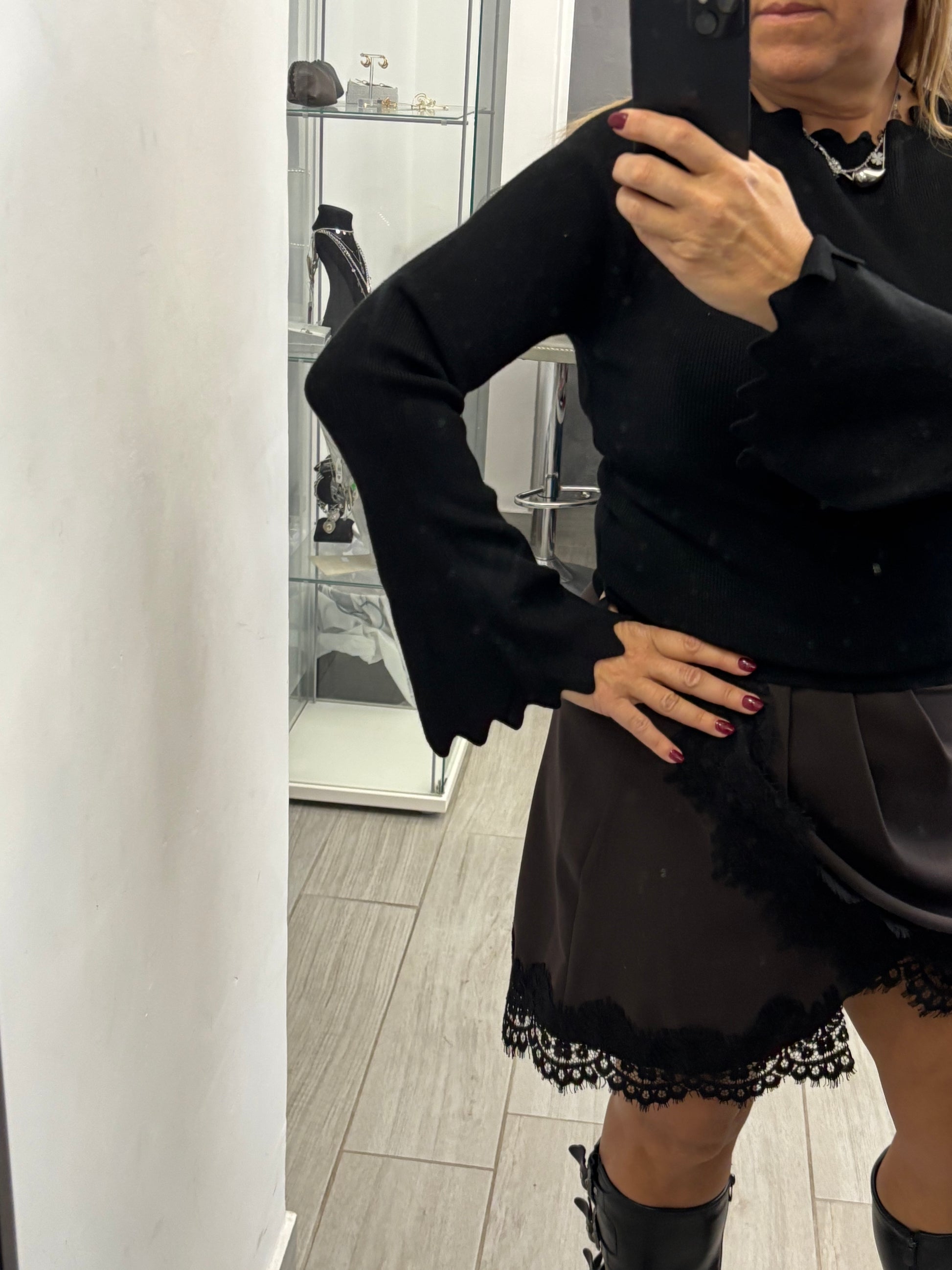 Maglietta manica lunga smerlata svasata nel fondo. Taglia unica veste fino ad una 46. Composizione 50% viscosa 28% nylon 22% poliestere.