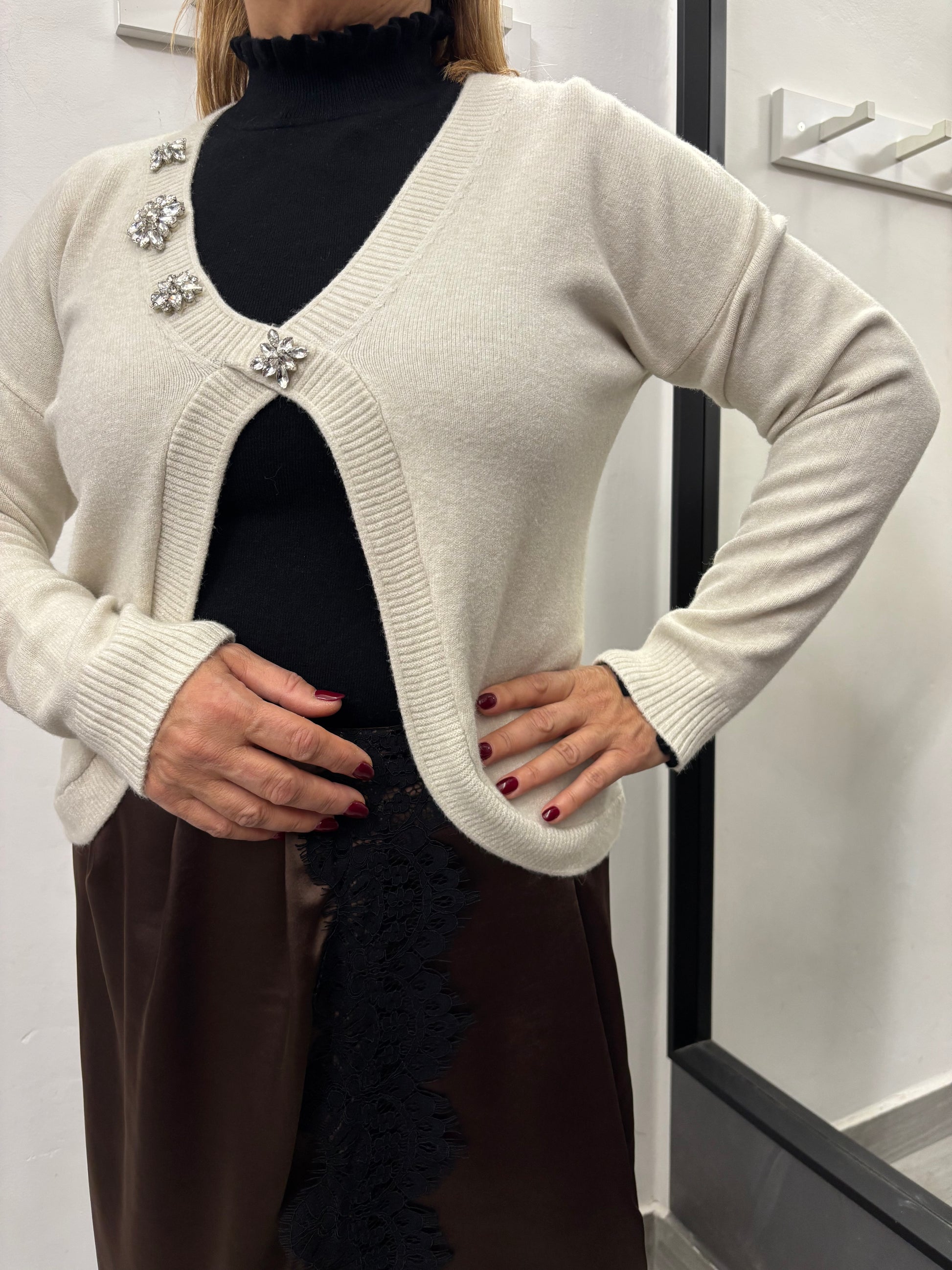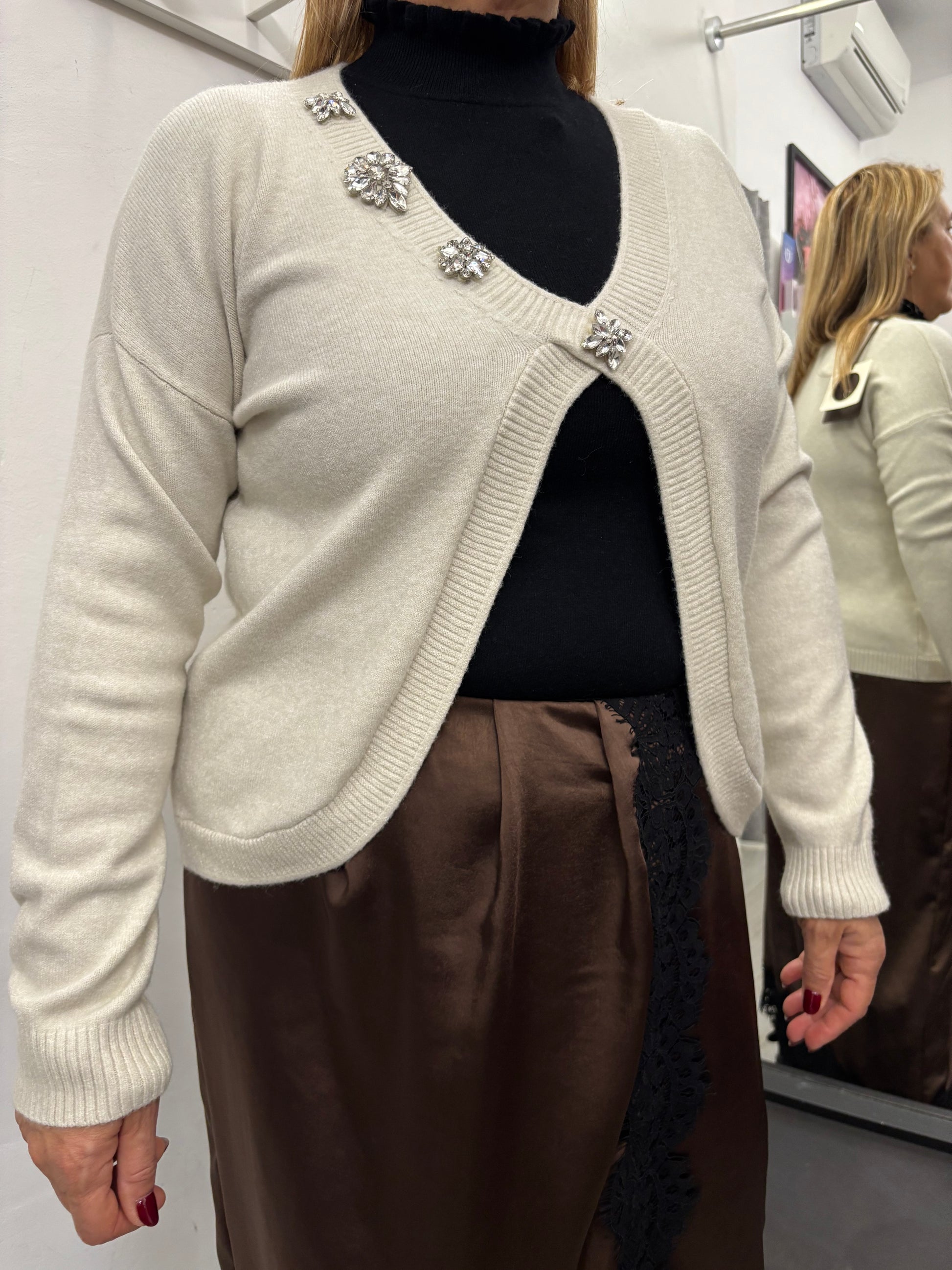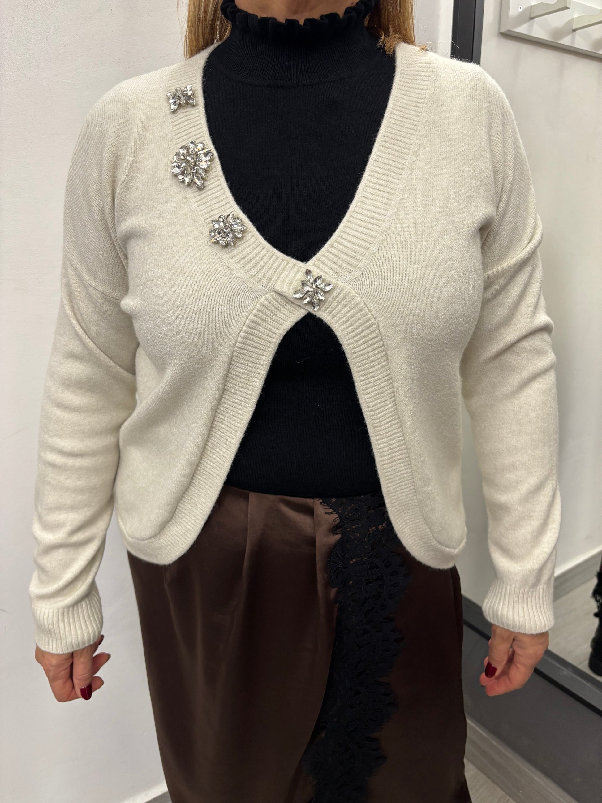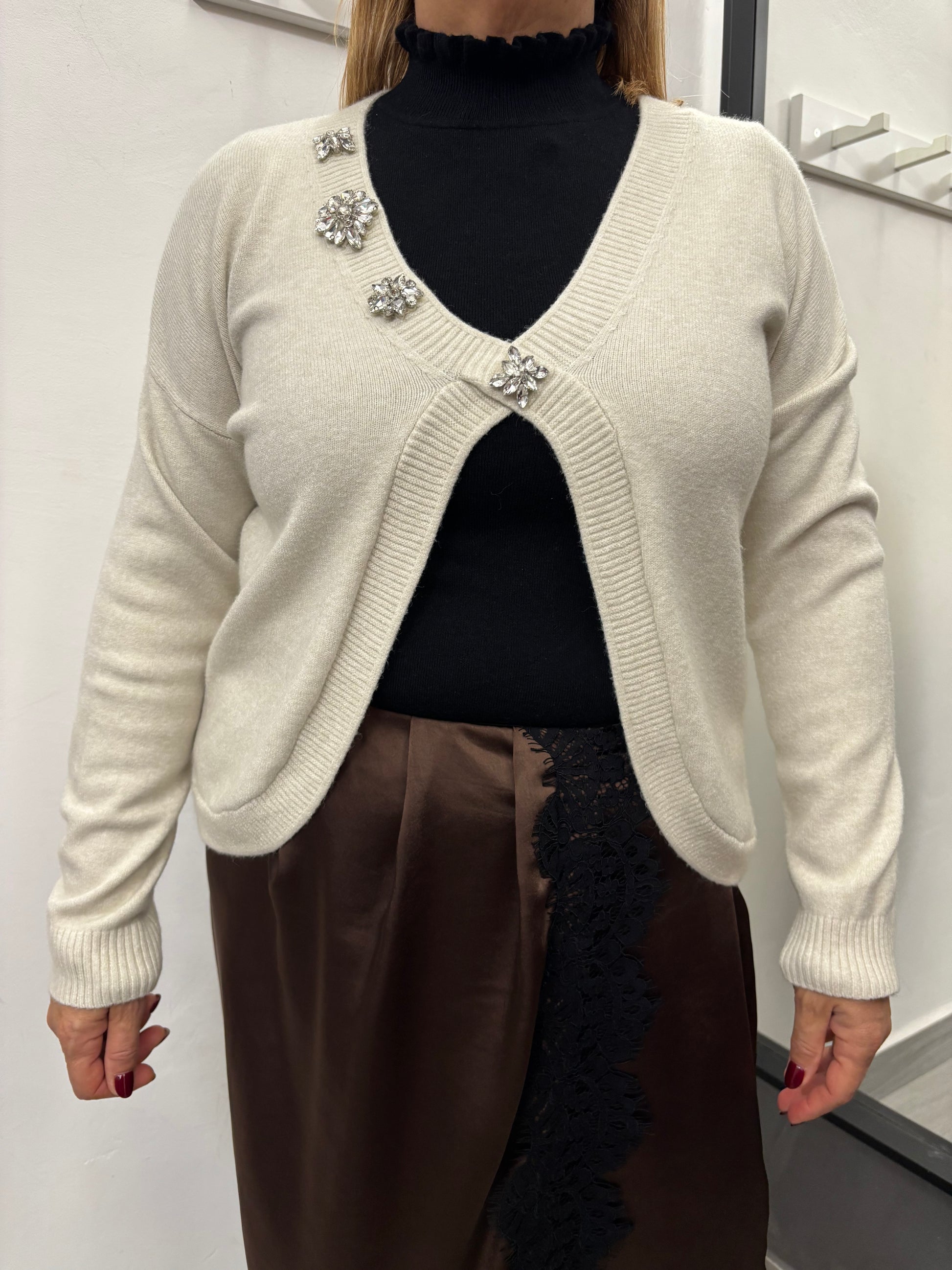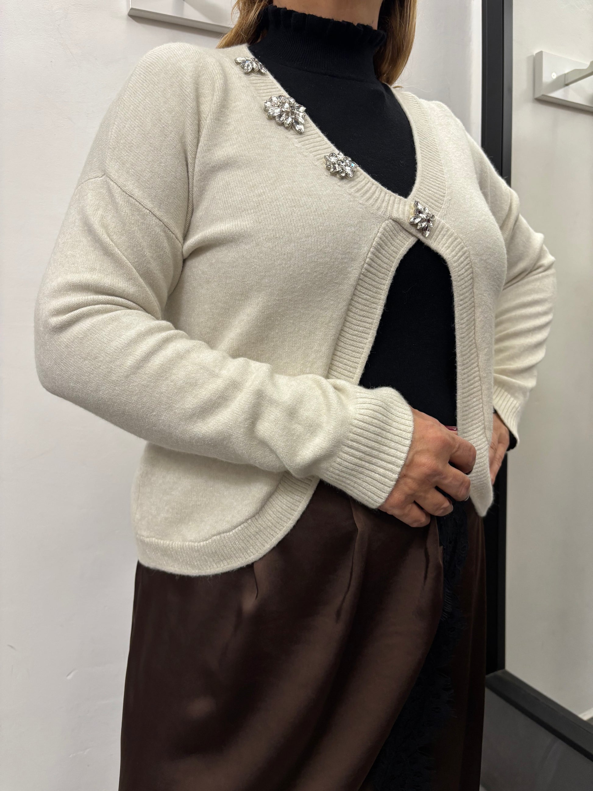 Maglioncino con scollatura a V con caboscion applicati sulla parte destra del collo, spalla che scende. Taglia unica veste fino ad una 46. Composizione 50% viscosa 28% poliestere 22% poliammide