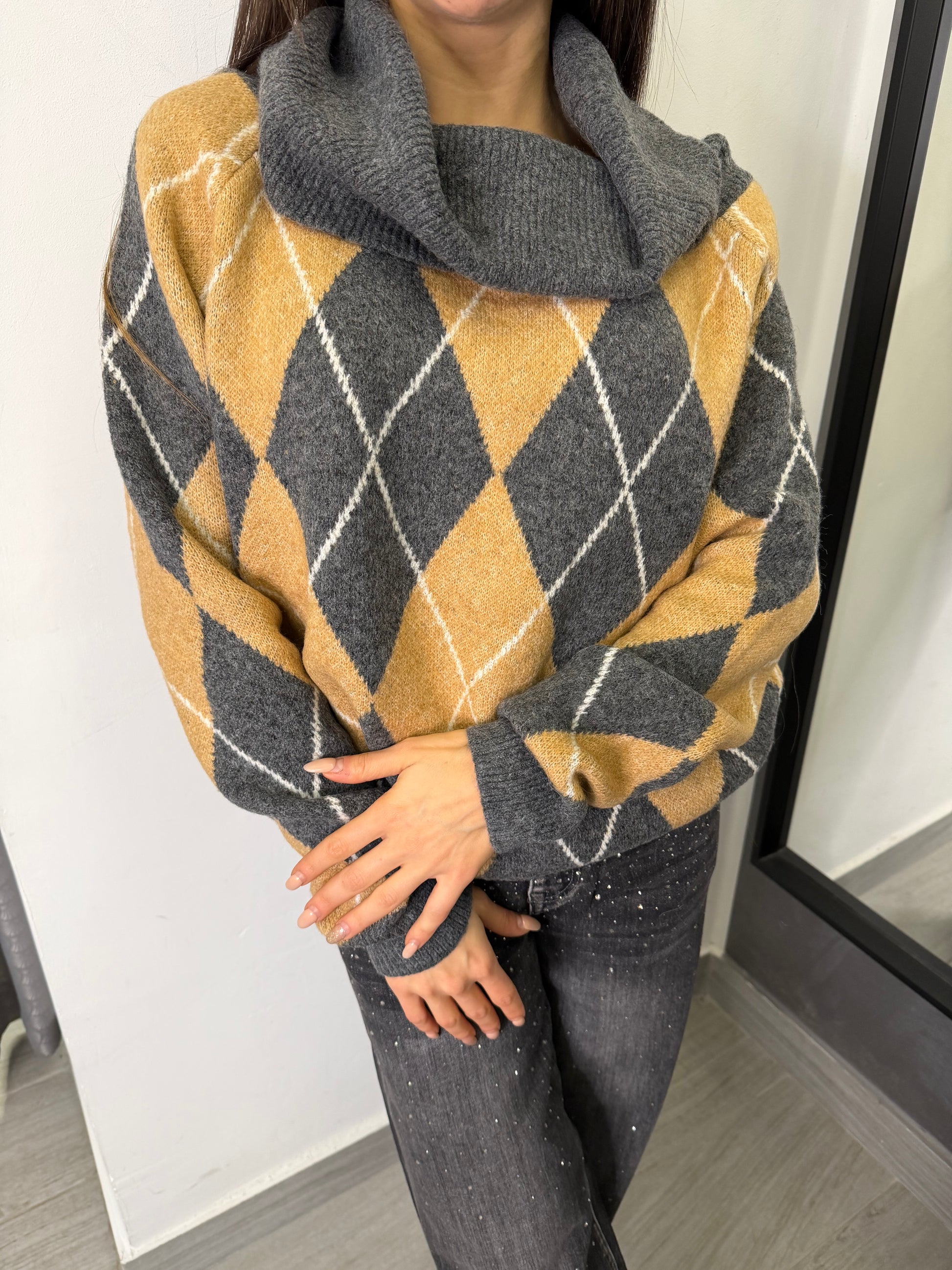 Maglione a rombi modello oversize con collo alto ad anello. Taglia unica veste fino ad una 48. Composizione 50% poliestere 45% poliammide 5% spandex