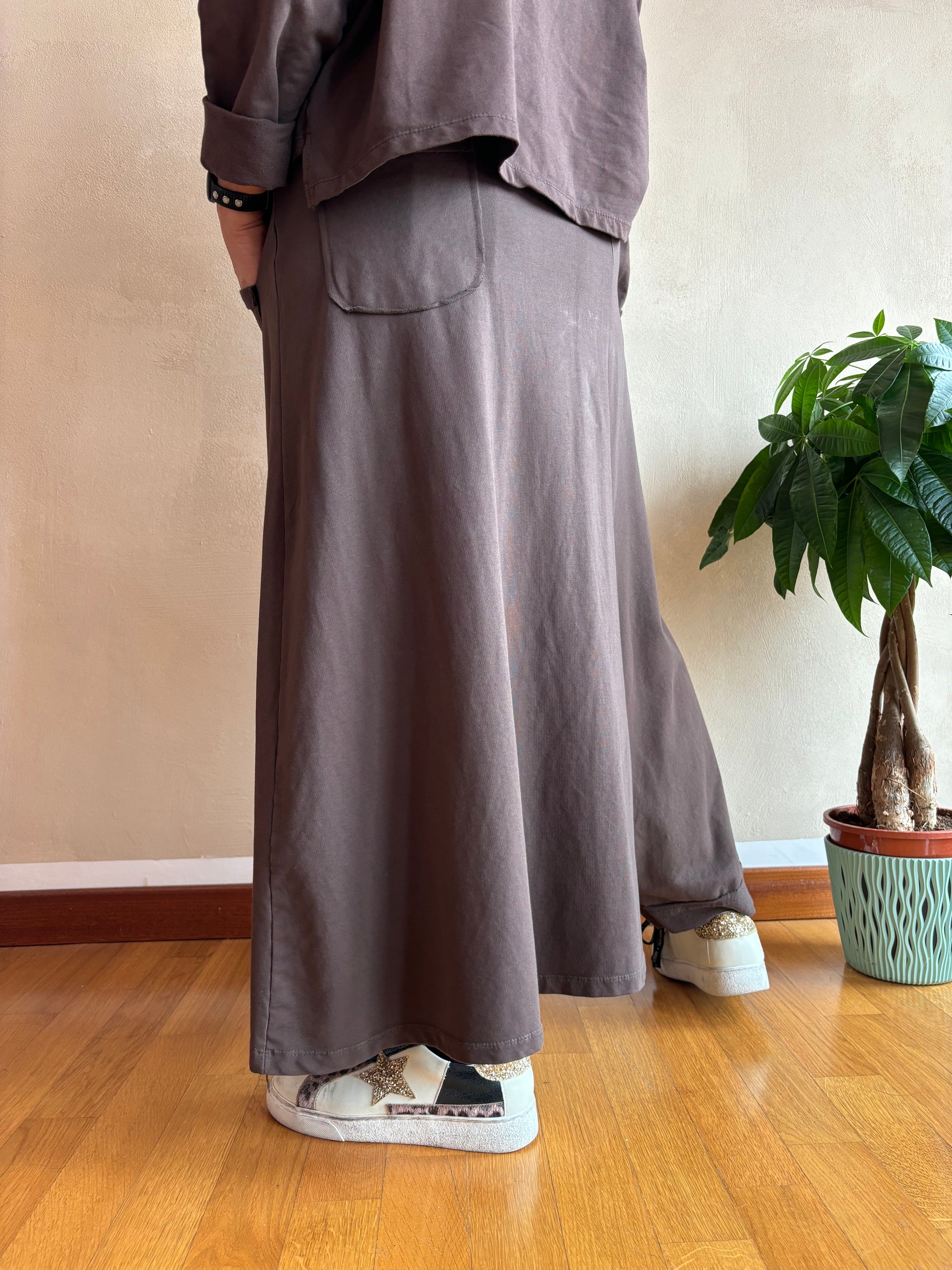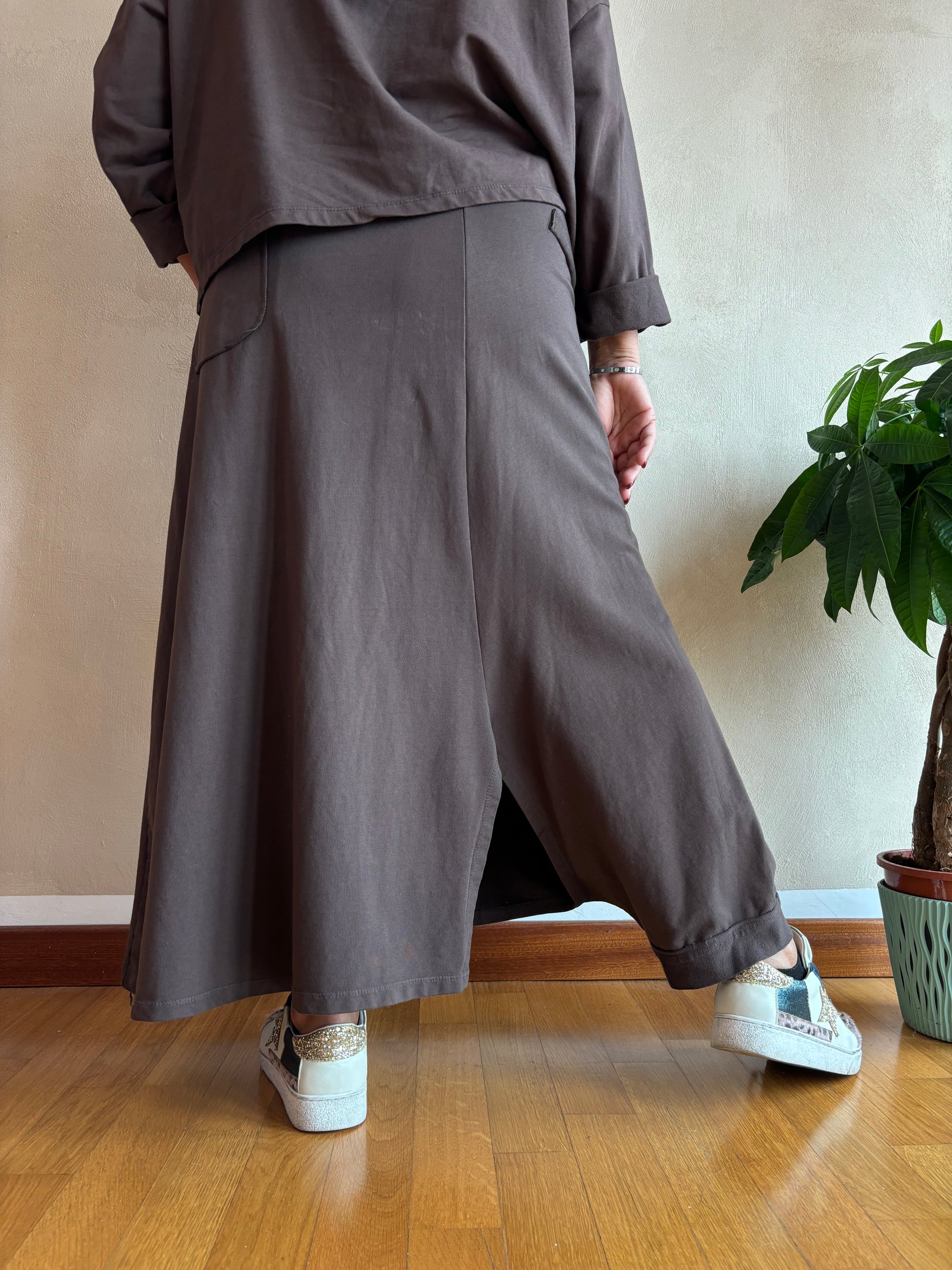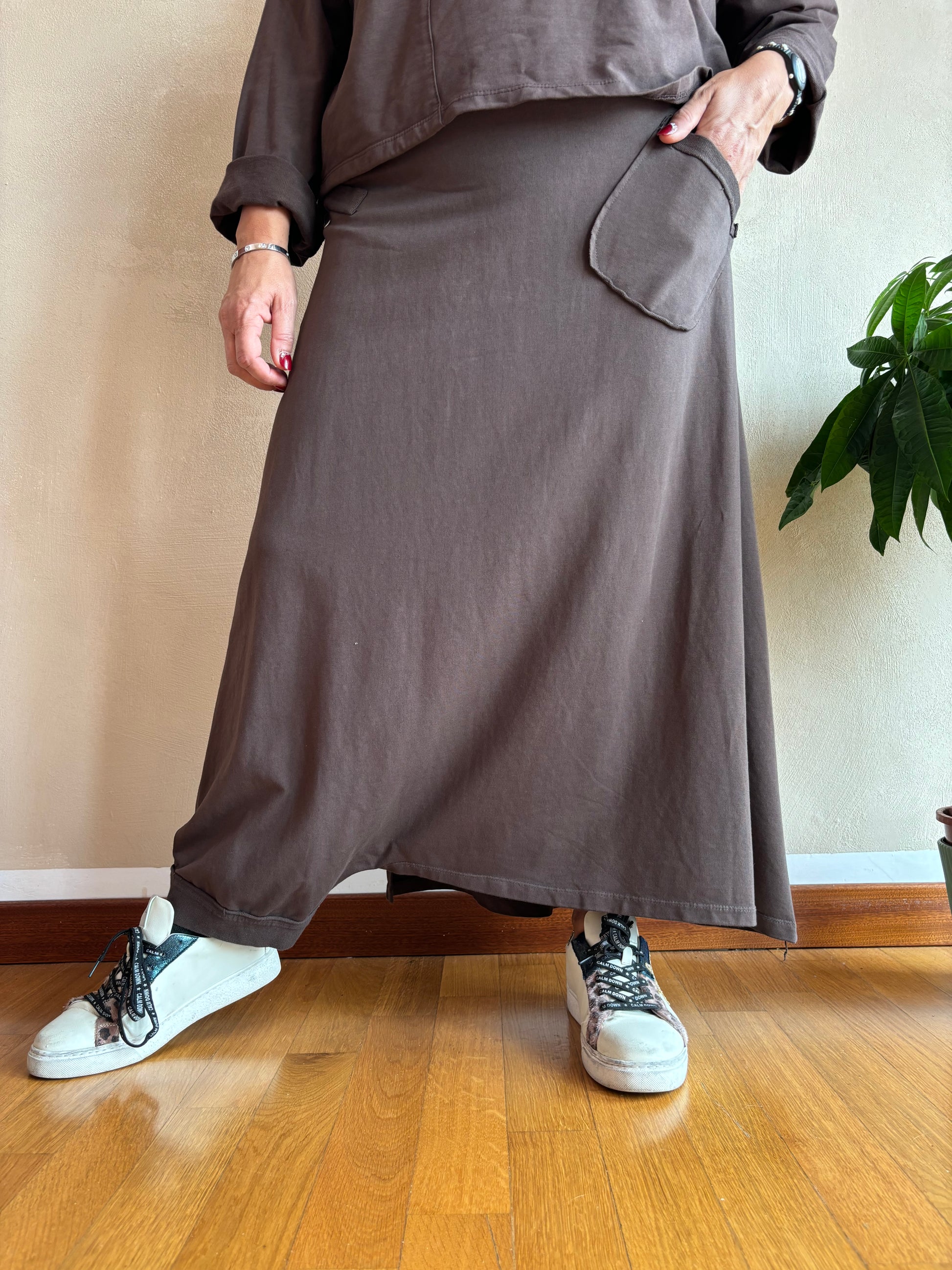 Panta-gonna in cotone a cavallo basso con effetto pantalone sulla parte destra. Unica tasca laterale sul davanti e tasca opposta sul dietro. Fascia elasticizzata su tutta la circonferenza della vita e buona vestibilità. Taglia unica veste fino ad una 48. Composizione 95% cotone 5% elastan.
