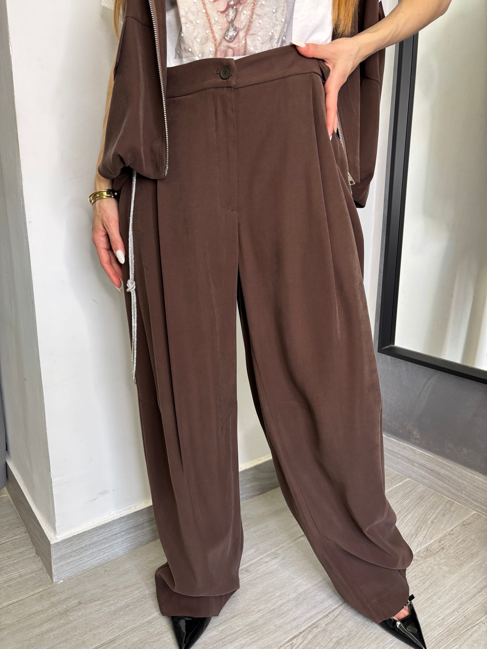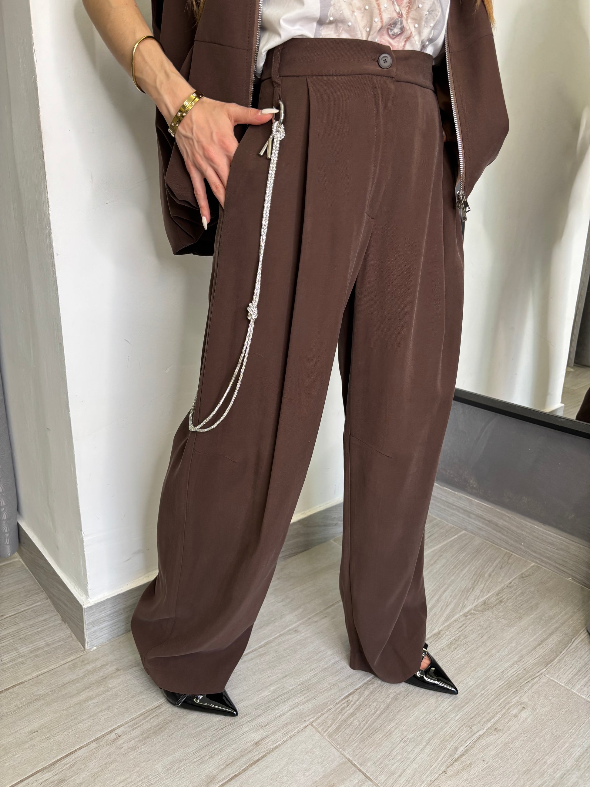 Pantalone modello morbido, cerniera e bottoncino . Cinturino con passanti, tasche nei fianchi. Dettaglio cordino in brillantini con possibilità di essere tolto. Composizione 90% viscosa 10% poliestere