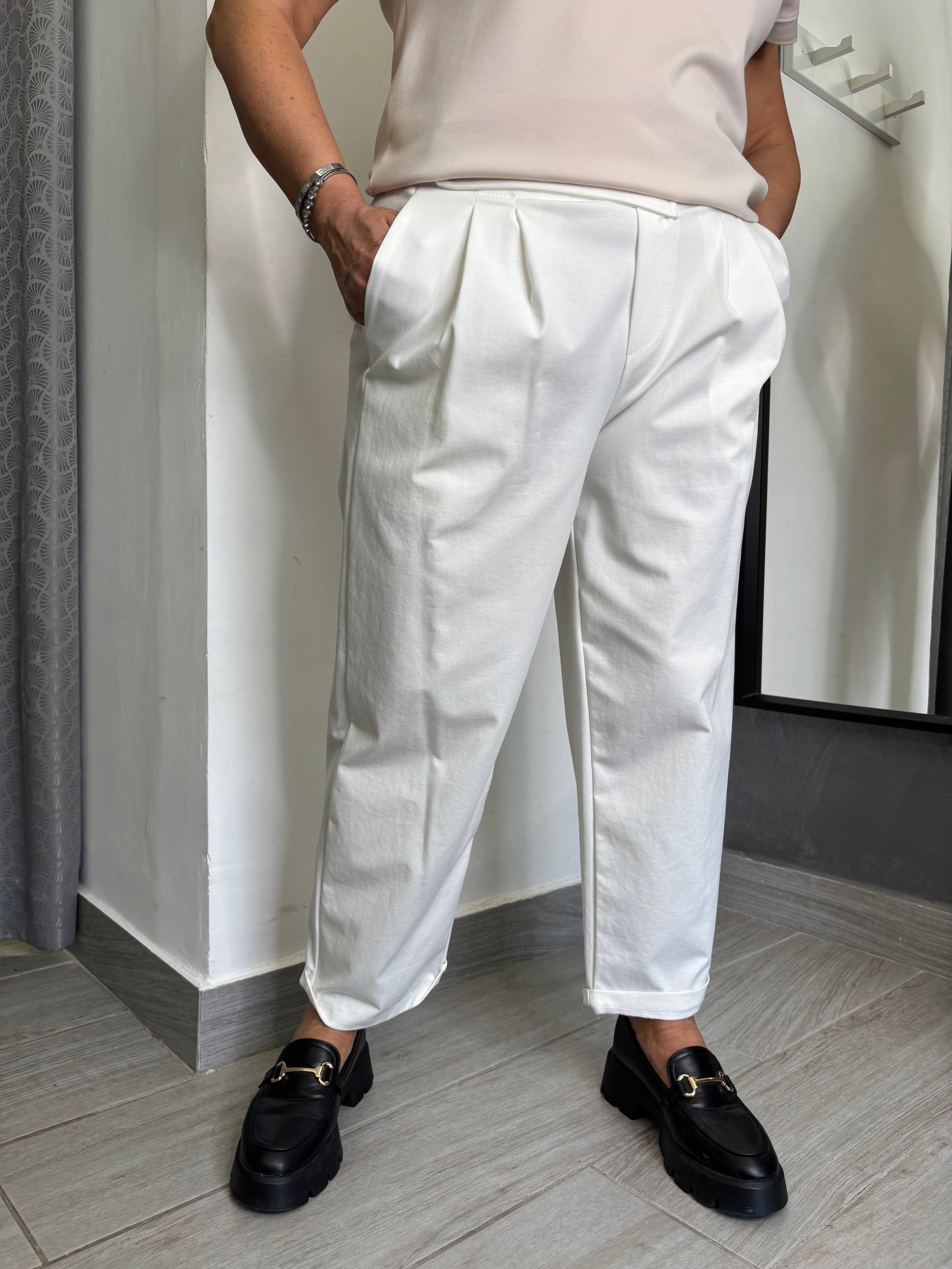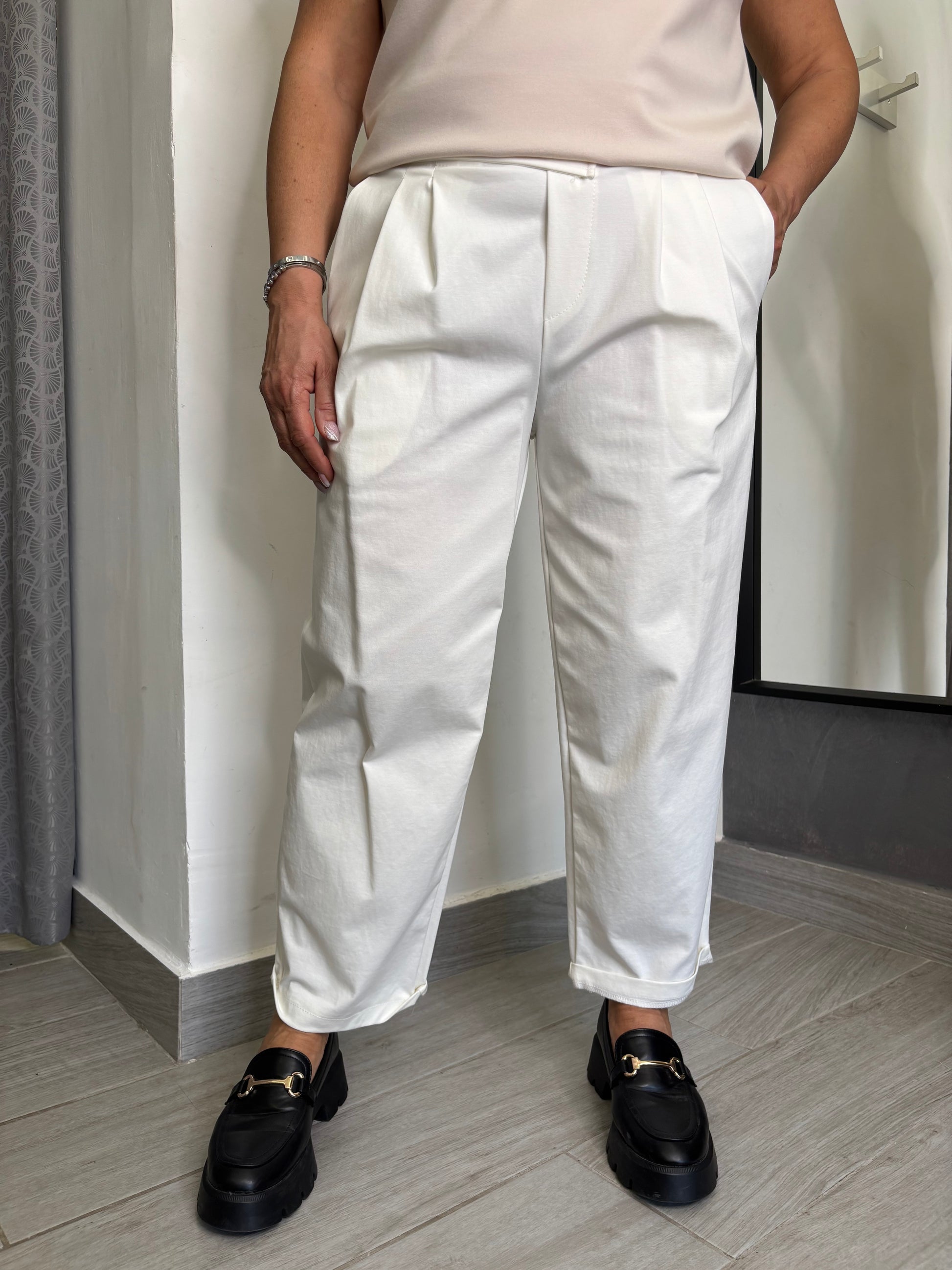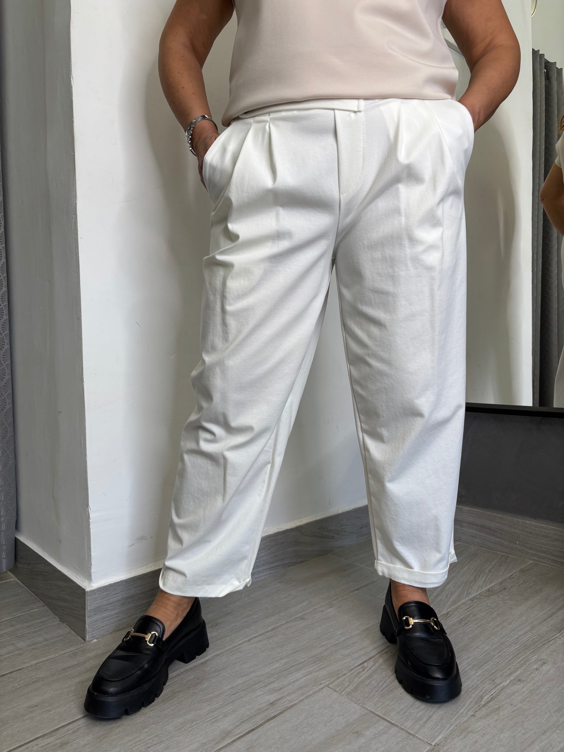 Pantalone in tessuto punto Milano con fascia e bottoni sul cinturino, elastico su tutta la circonferenza vita, pencies e tasche trasversali. Taglia unica veste fino ad una 48. Composizione 53% cotone 38% poliammide 9% elastan