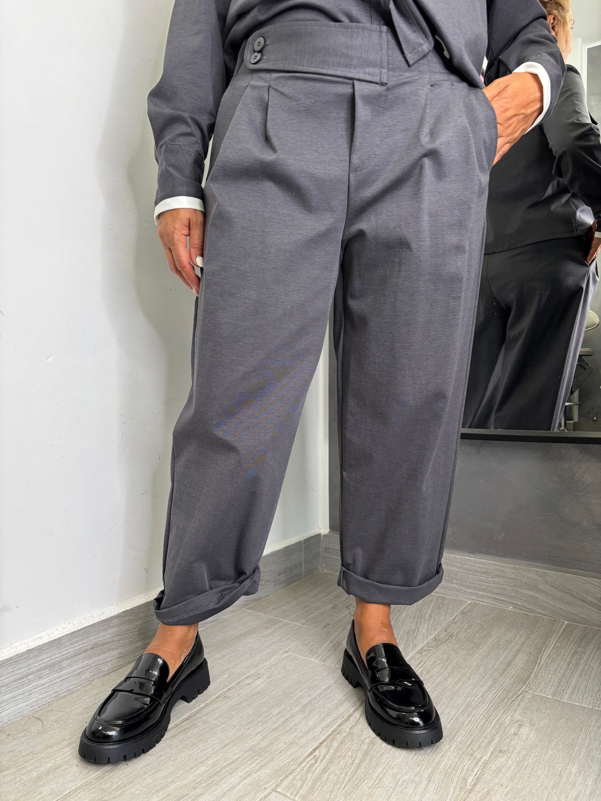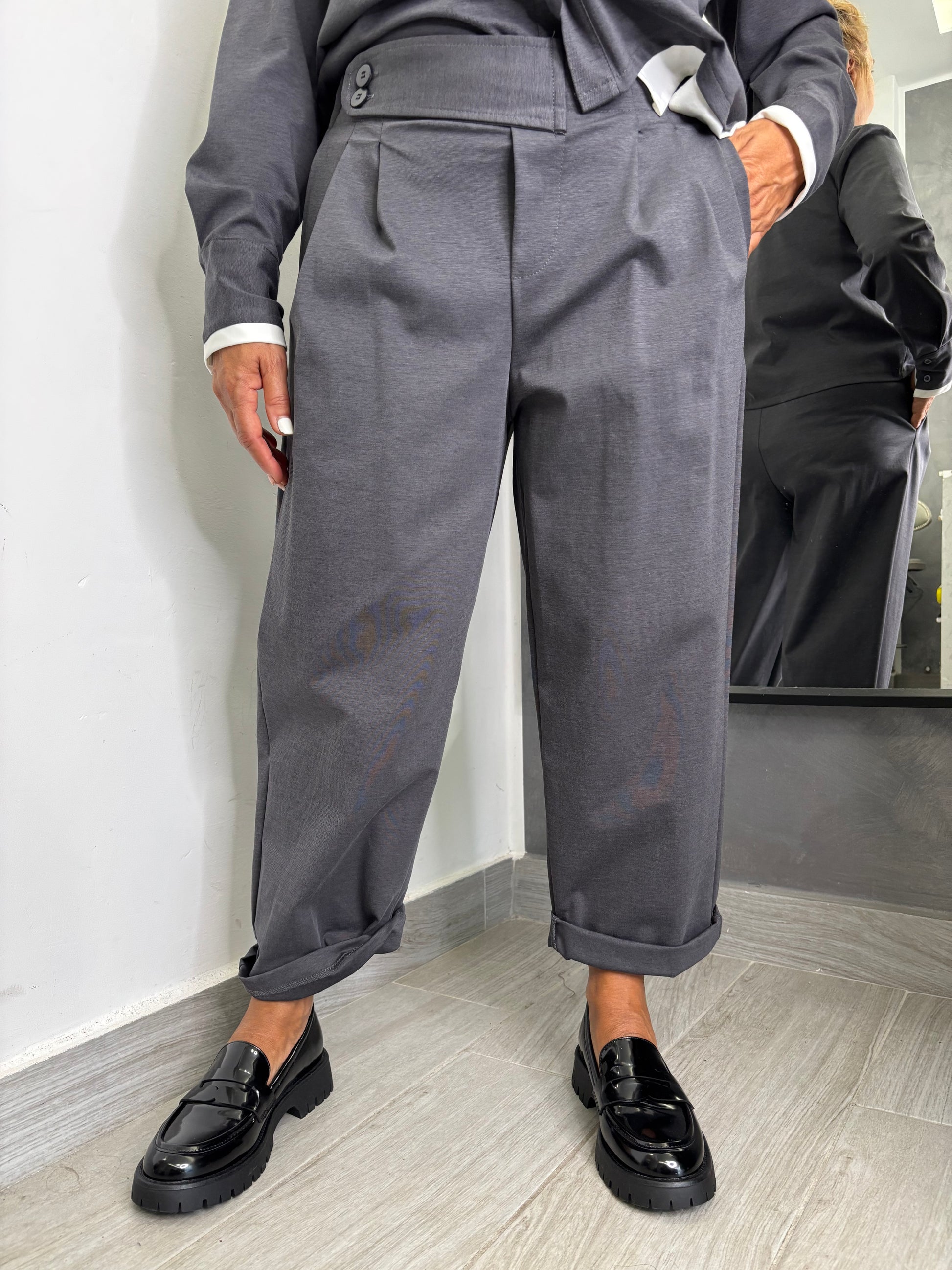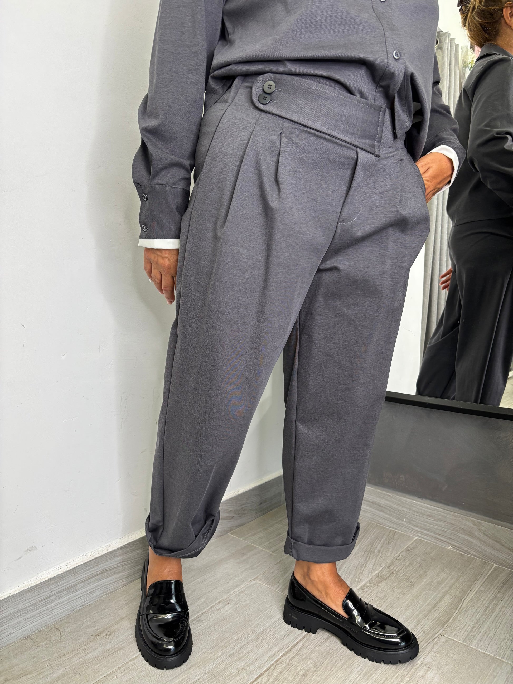 Pantalone in tessuto punto Milano con fascia e bottoni sul cinturino, elastico su tutta la circonferenza vita, pencies e tasche trasversali. Taglia unica veste fino ad una 48. Composizione 53% cotone 38% poliammide 9% elastan