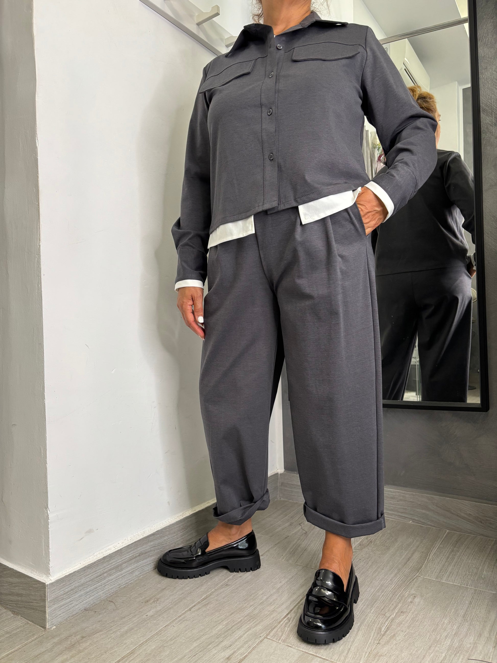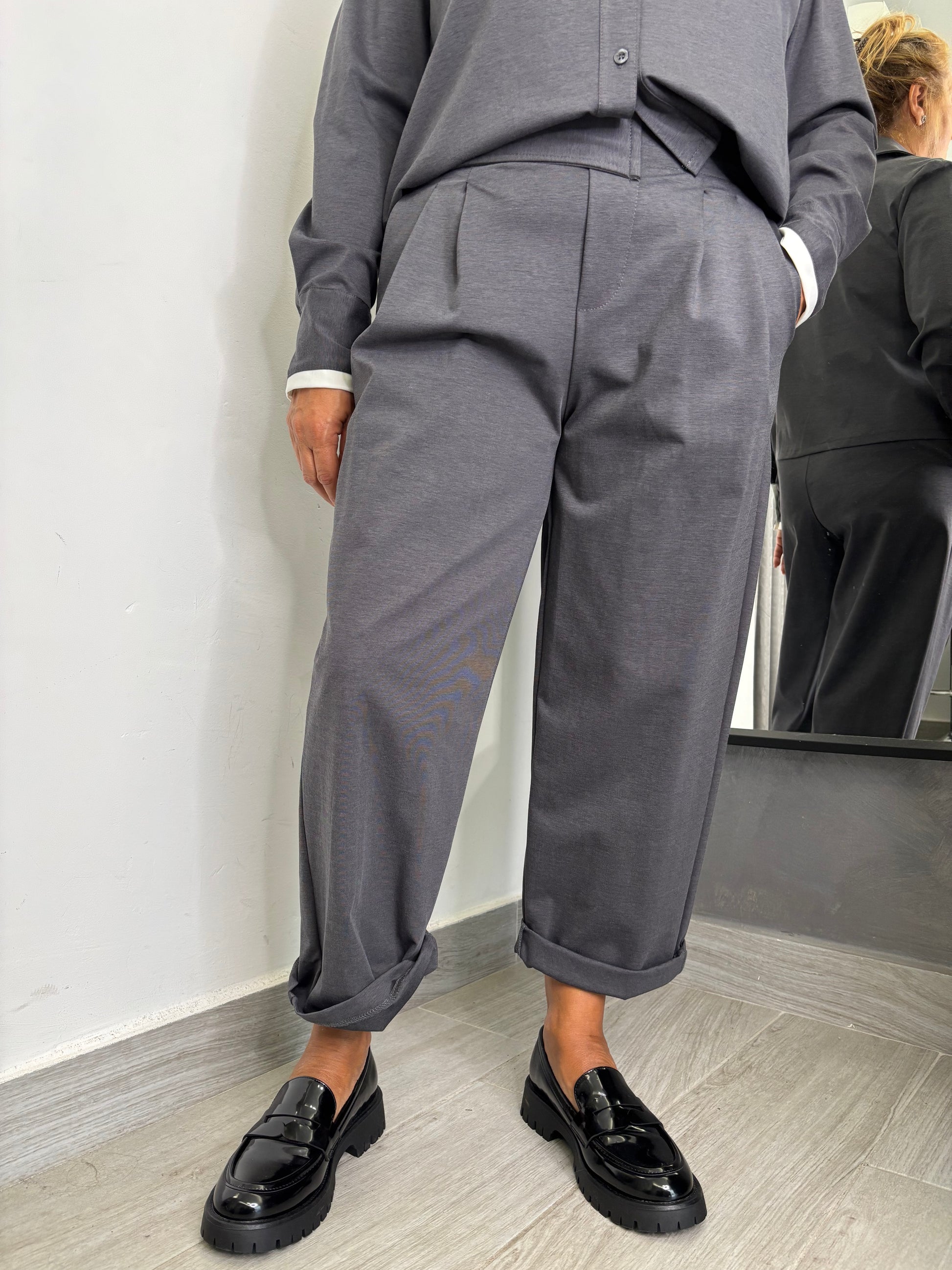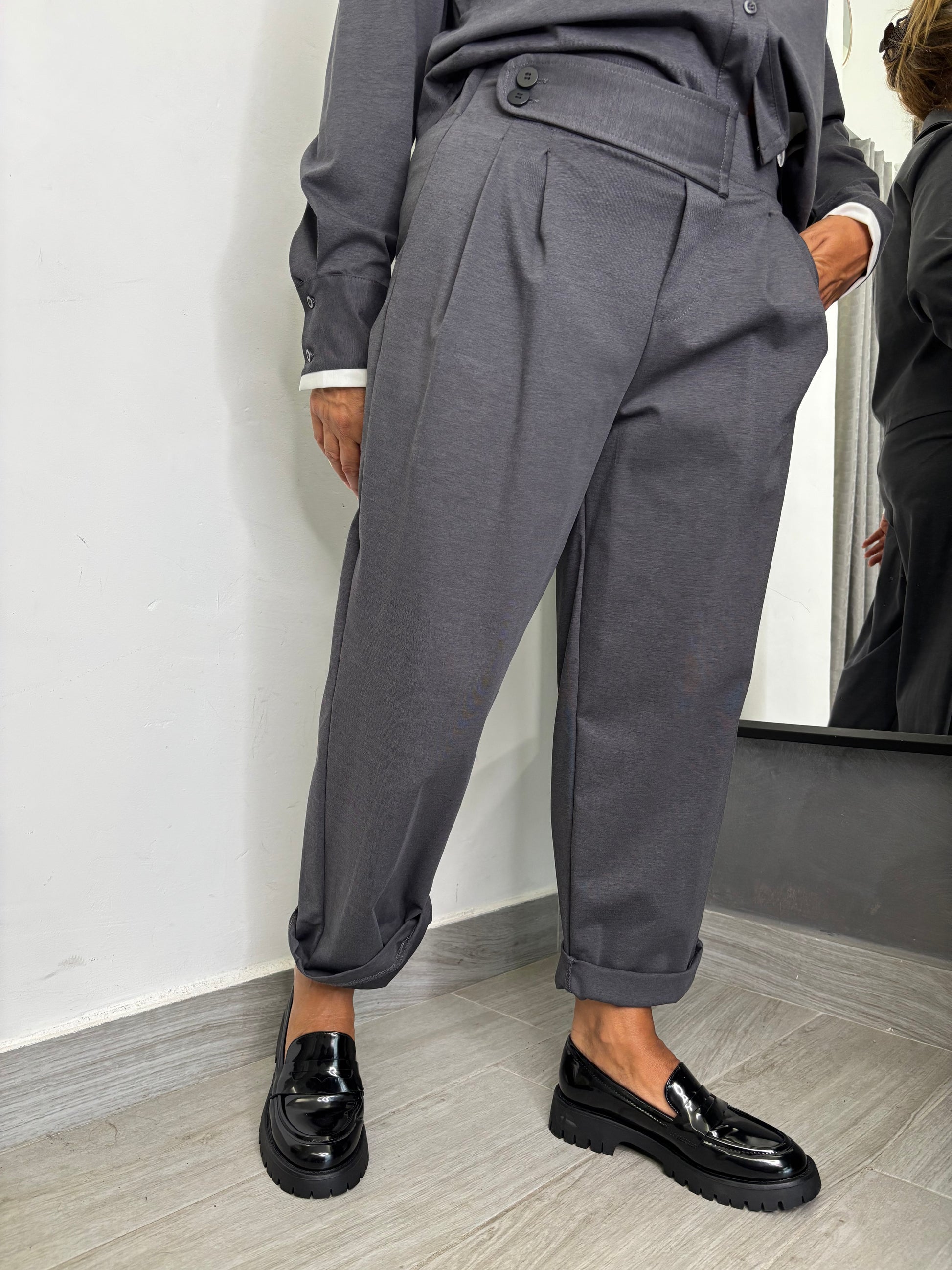 Pantalone in tessuto punto Milano con fascia e bottoni sul cinturino, elastico su tutta la circonferenza vita, pencies e tasche trasversali. Taglia unica veste fino ad una 48. Composizione 53% cotone 38% poliammide 9% elastan