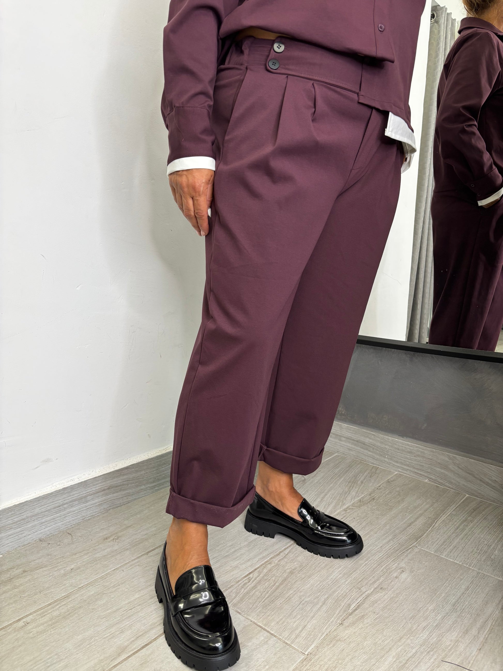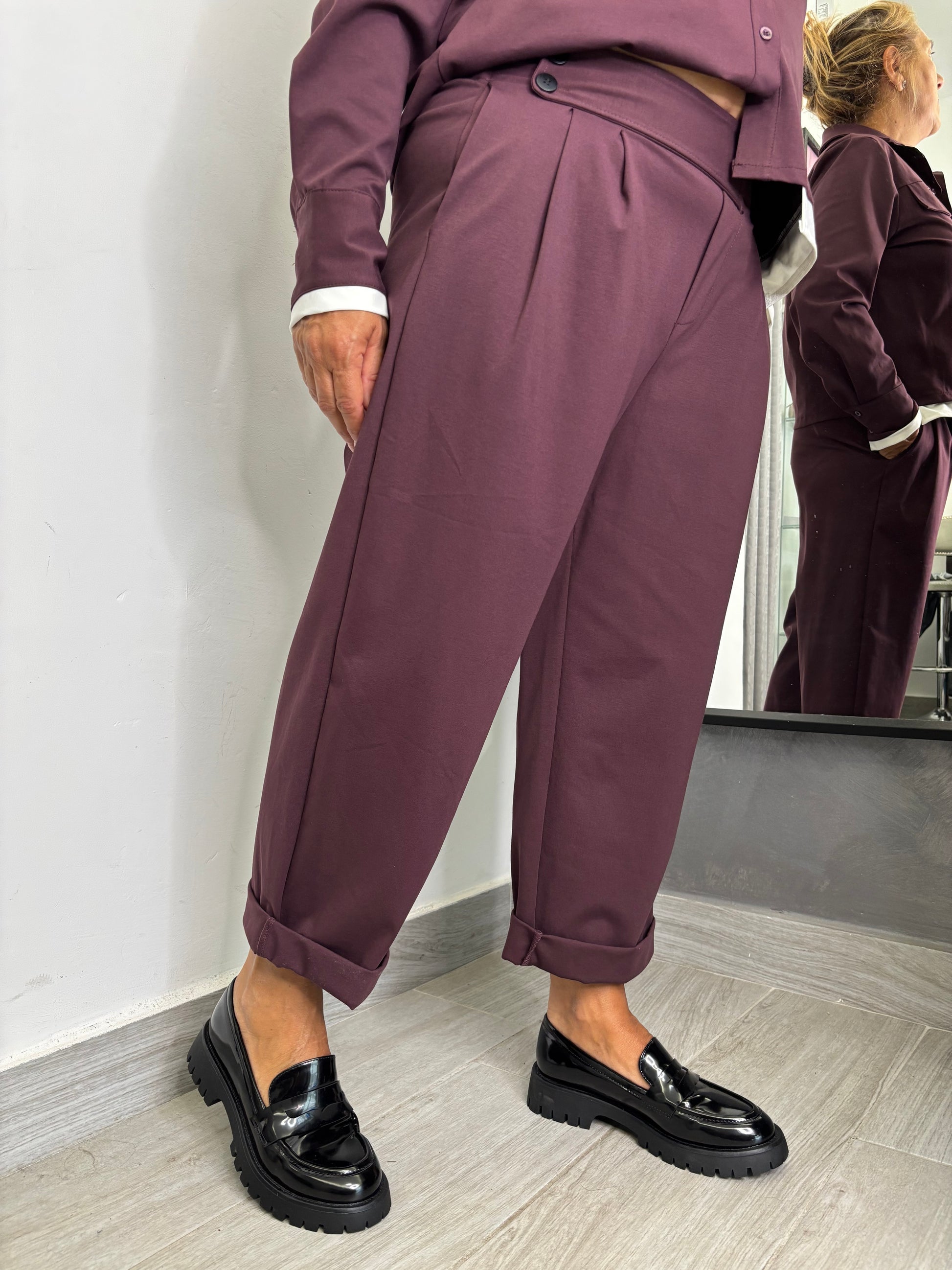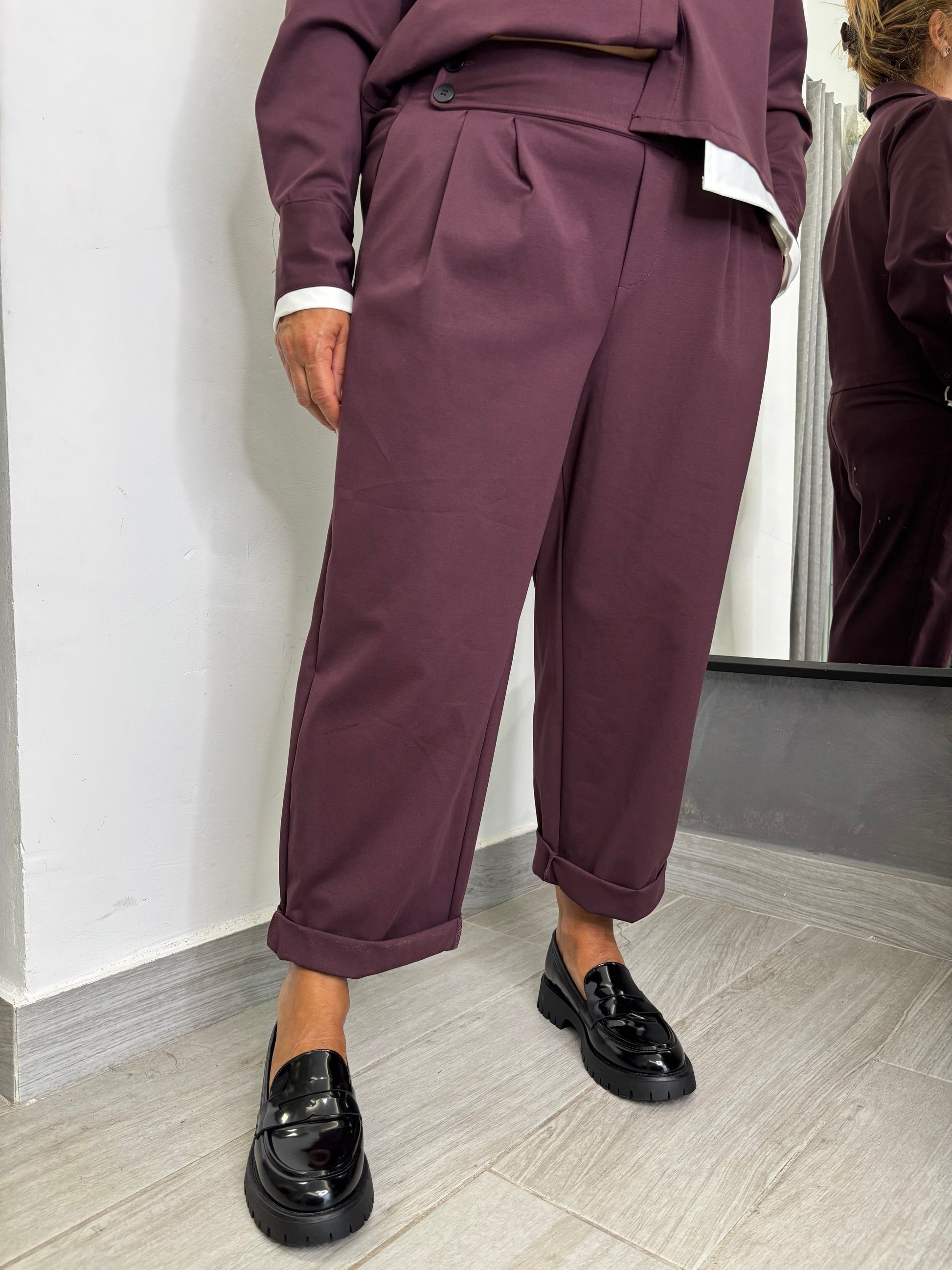 Pantalone in tessuto punto Milano con fascia e bottoni sul cinturino, elastico su tutta la circonferenza vita, pencies e tasche trasversali. Taglia unica veste fino ad una 48. Composizione 53% cotone 38% poliammide 9% elastan