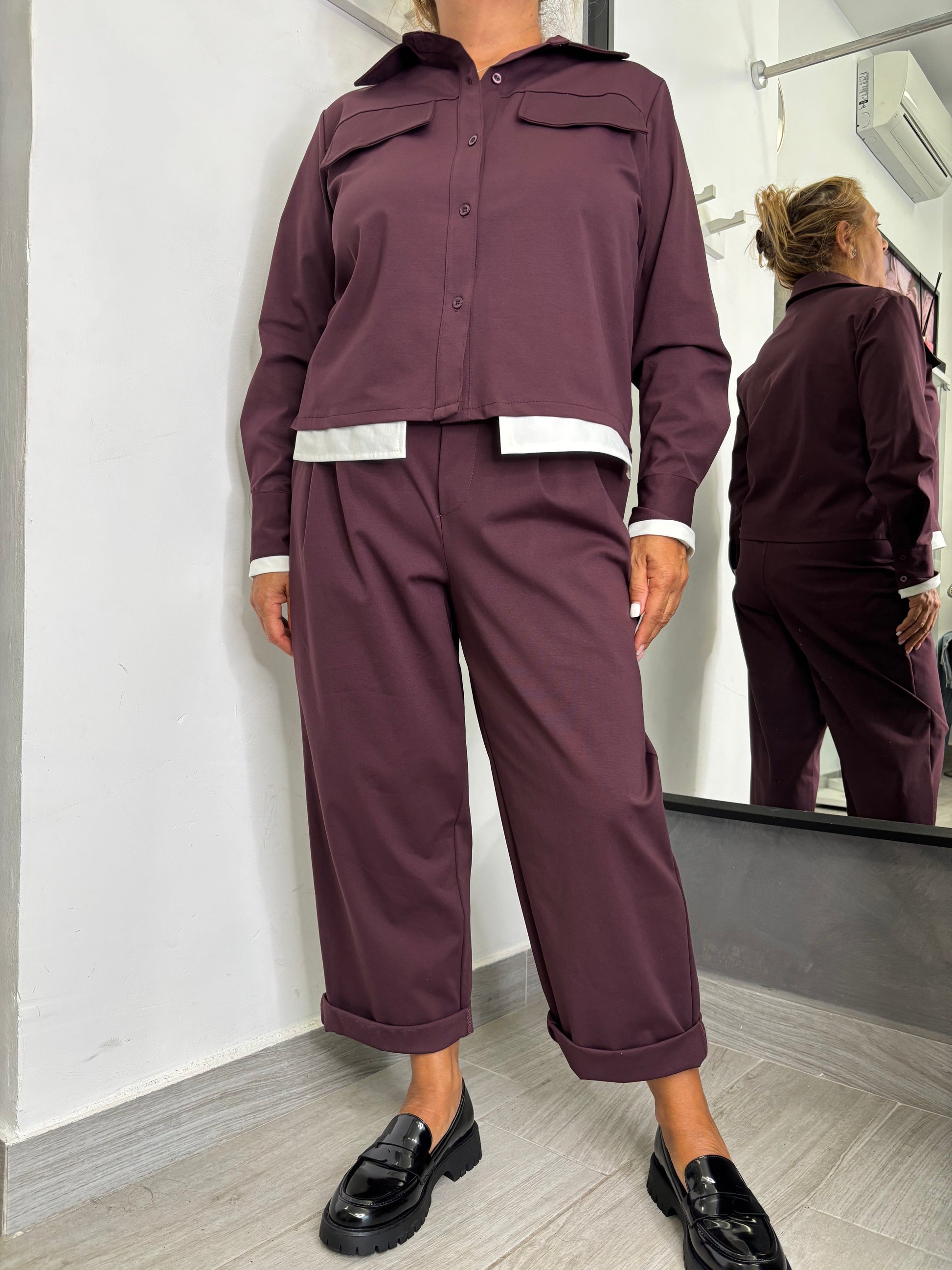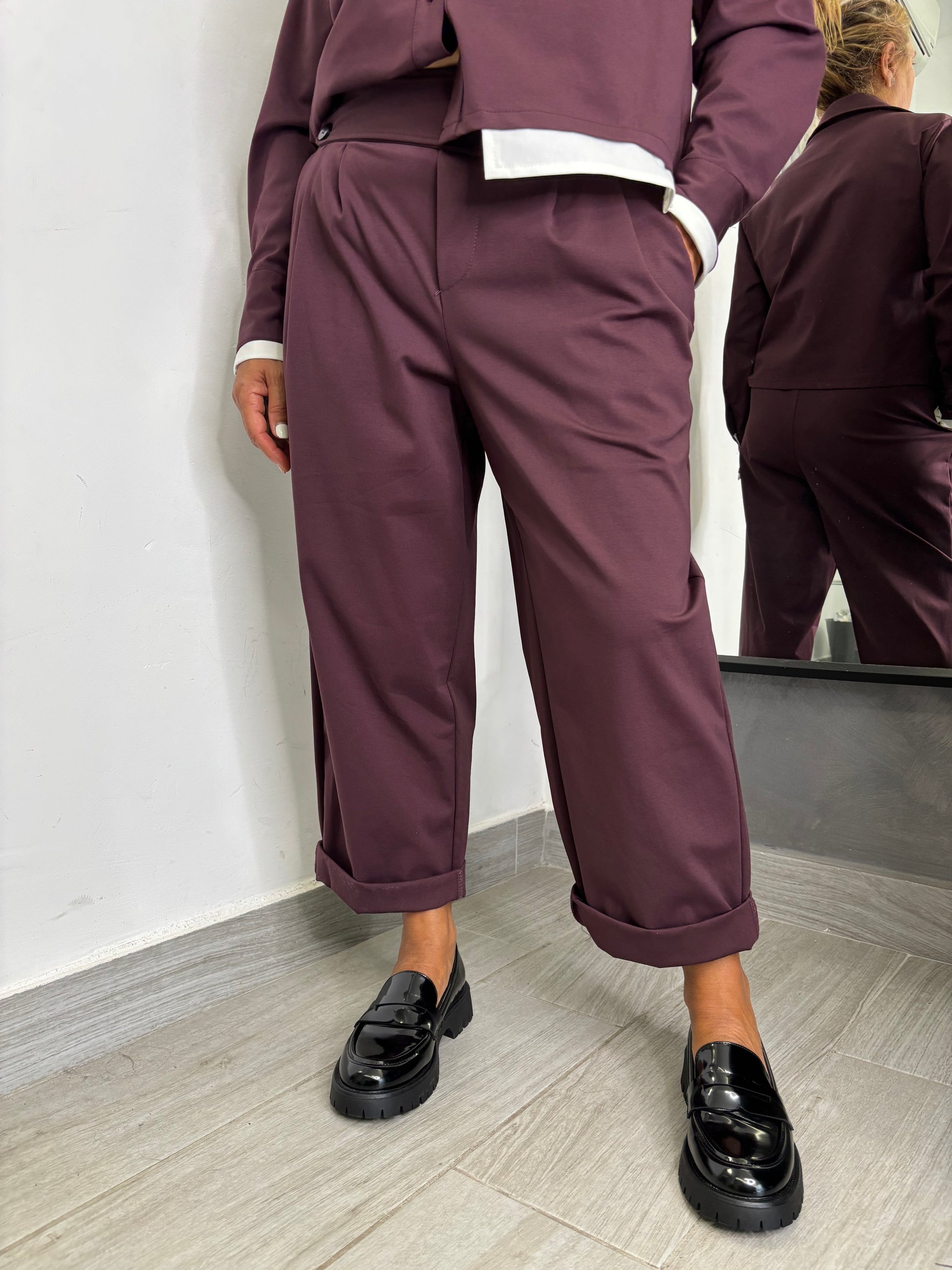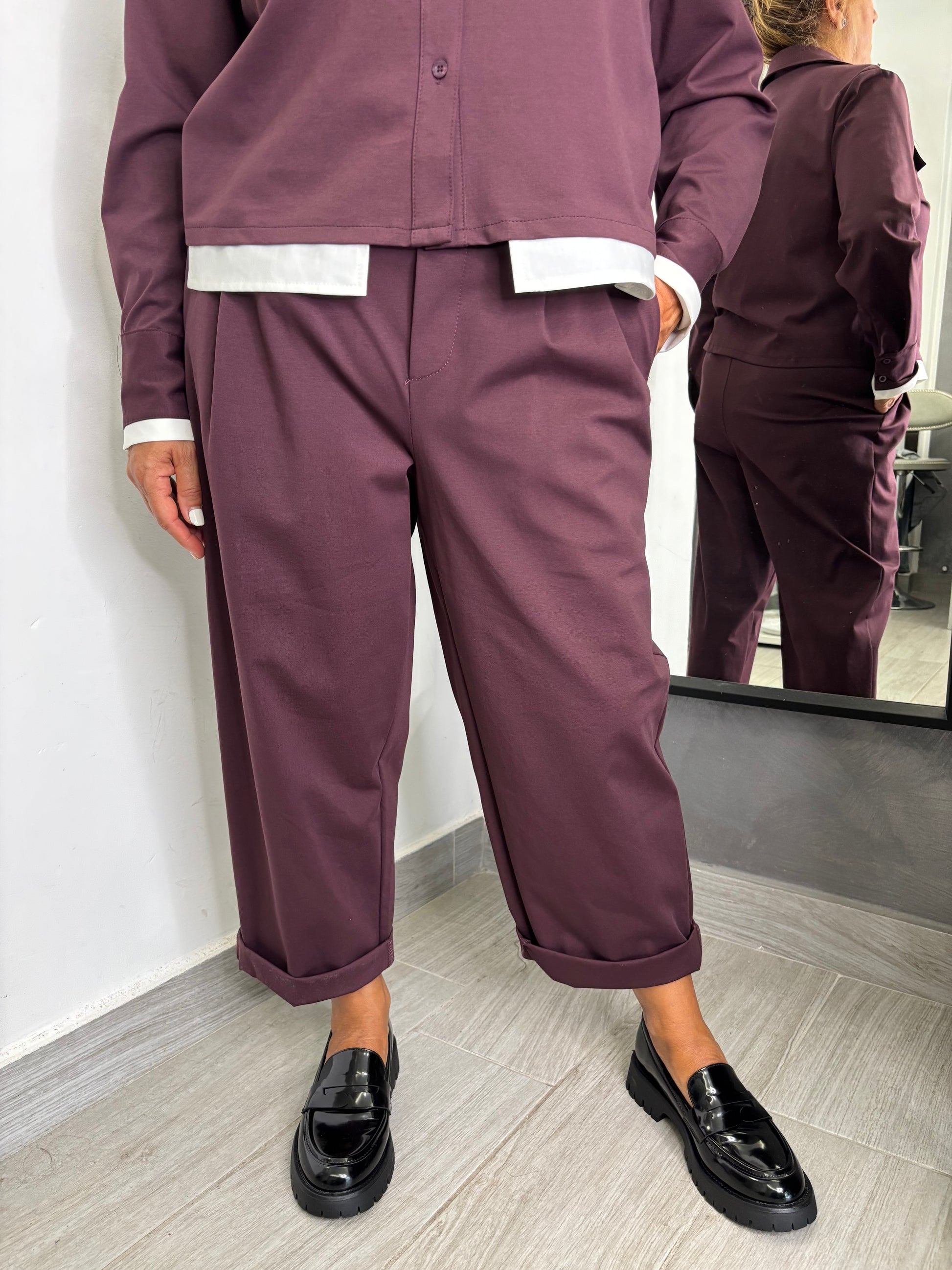 Pantalone in tessuto punto Milano con fascia e bottoni sul cinturino, elastico su tutta la circonferenza vita, pencies e tasche trasversali. Taglia unica veste fino ad una 48. Composizione 53% cotone 38% poliammide 9% elastan
