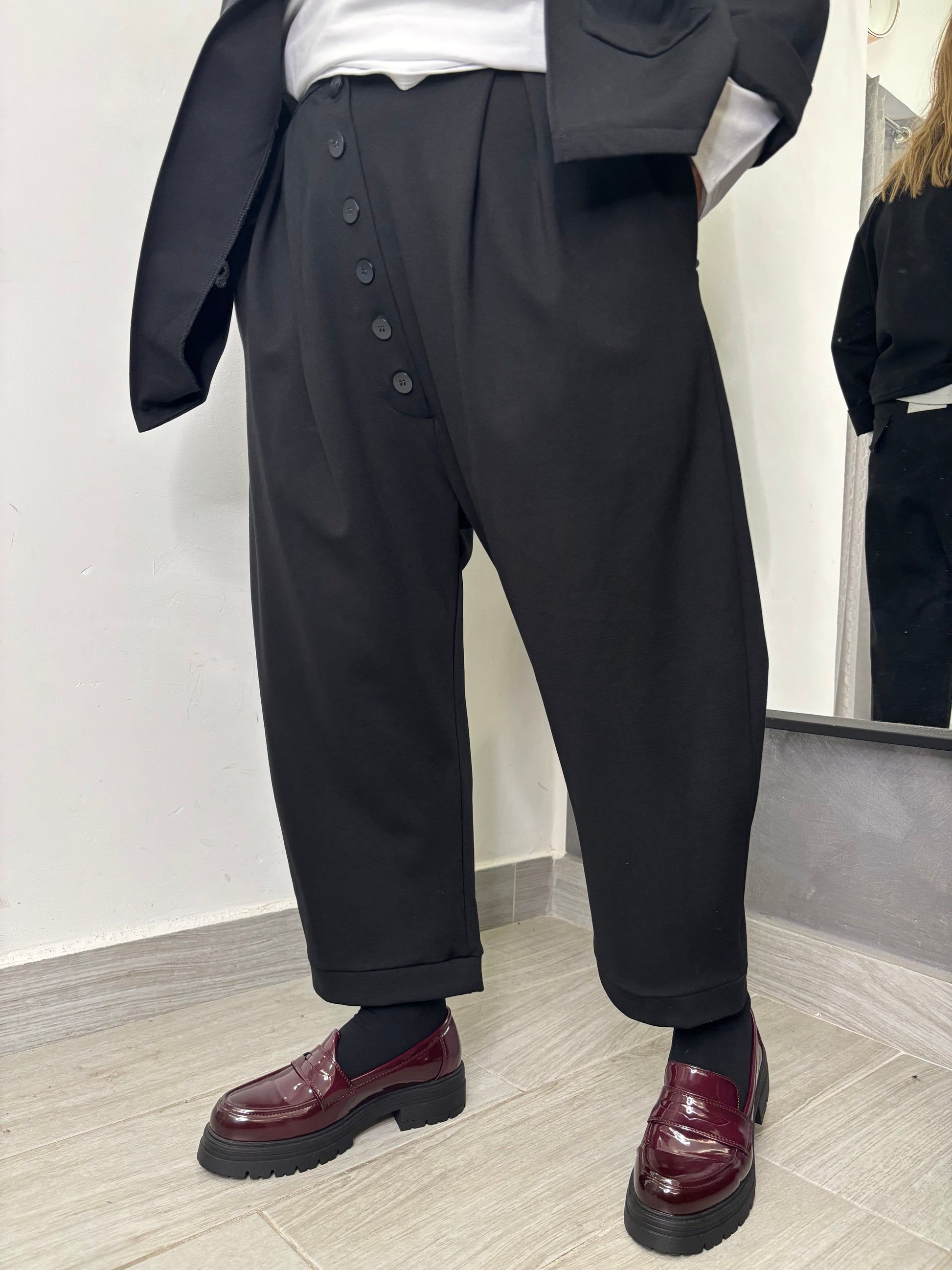 Pantalone in tessuto punto Milano, cavallo leggermente basso, cinturino e pencies in vita e bottoni frontali, tasche inserite nei fianchi e finte nella parte dietro con aletta. Taglia unica veste fino ad una 46. Composizione 65% viscosa 30% poliammide 5% elastan.