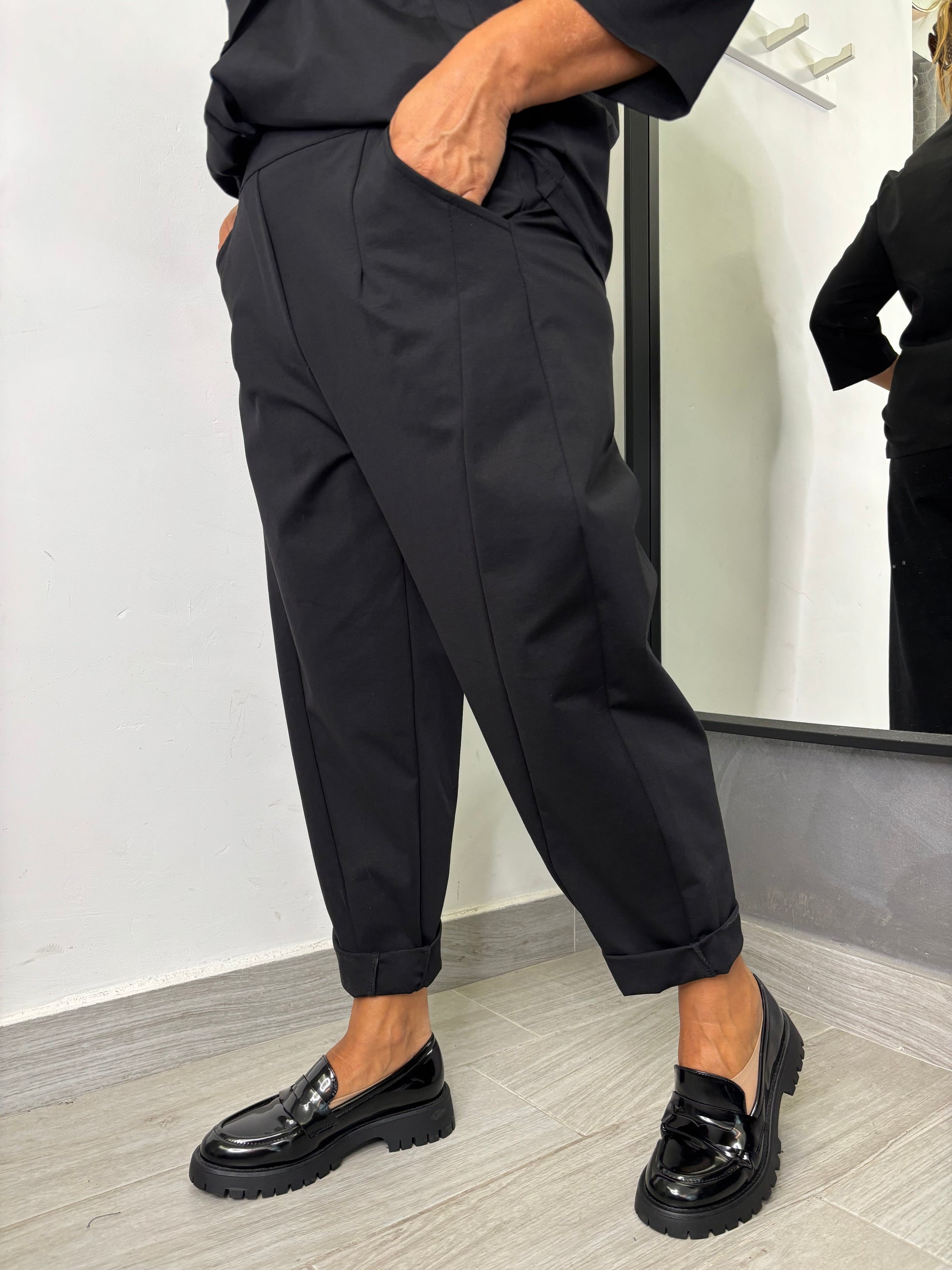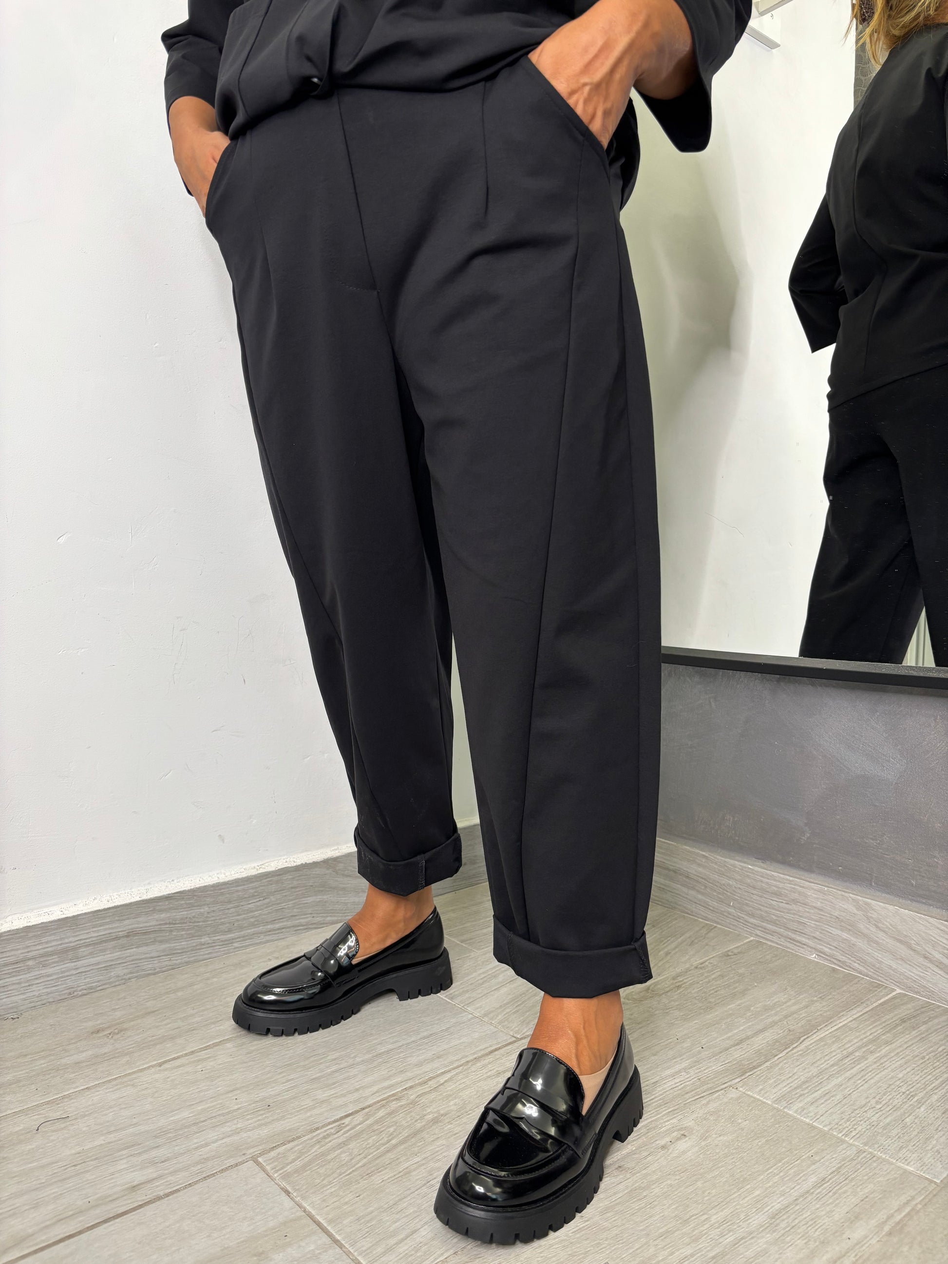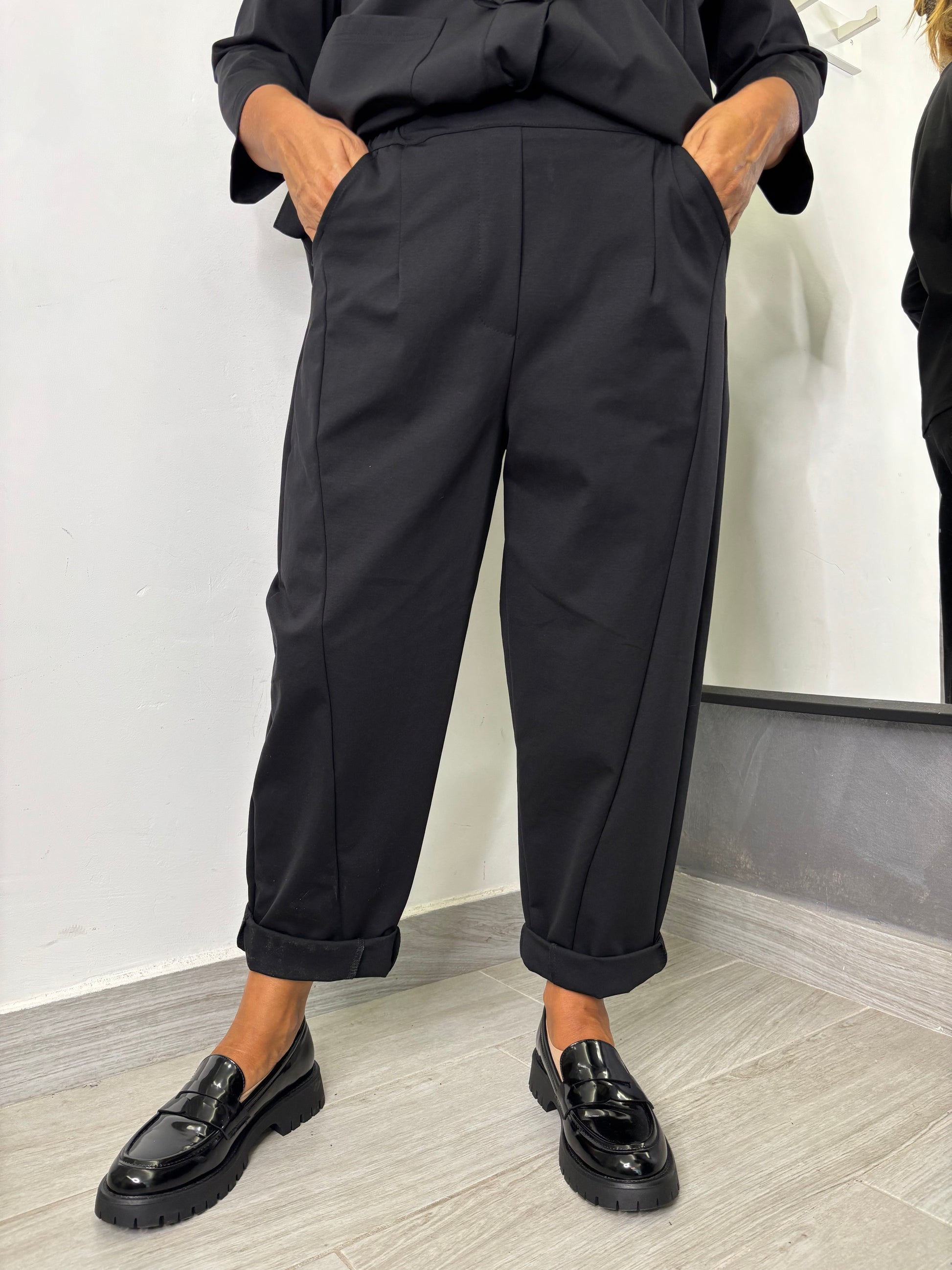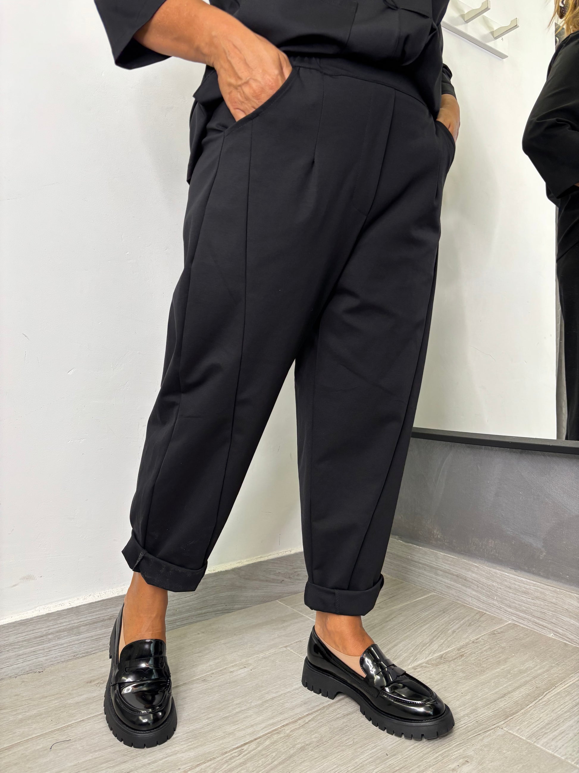 Pantalone in punto Milano con cuciture lungo la gamba , tasche davanti ed elastico su tutta la circonferenza della vita. Taglia unica veste fino ad una 48. Composizione 53% cotone 38% poliammide 9% elastan.