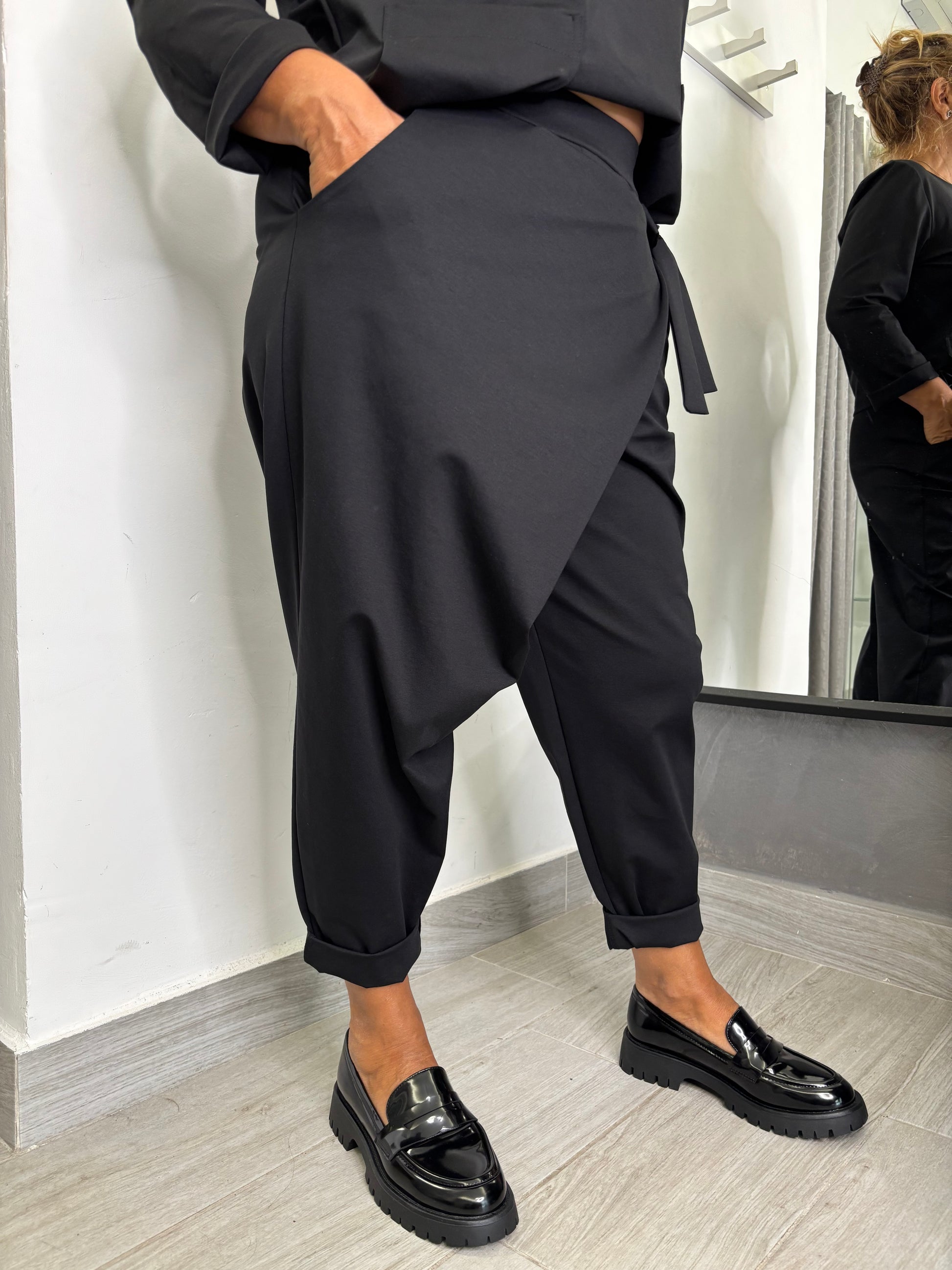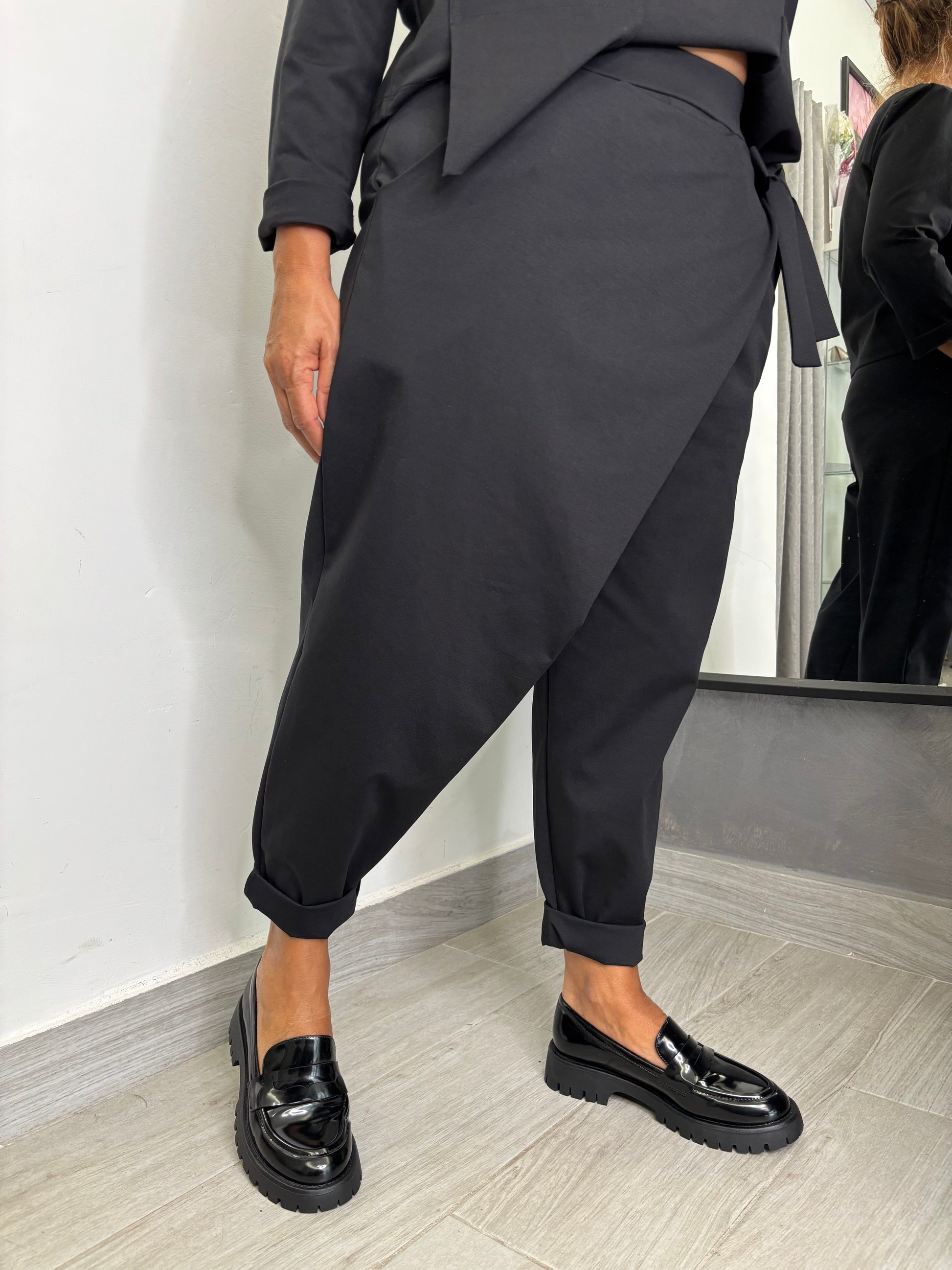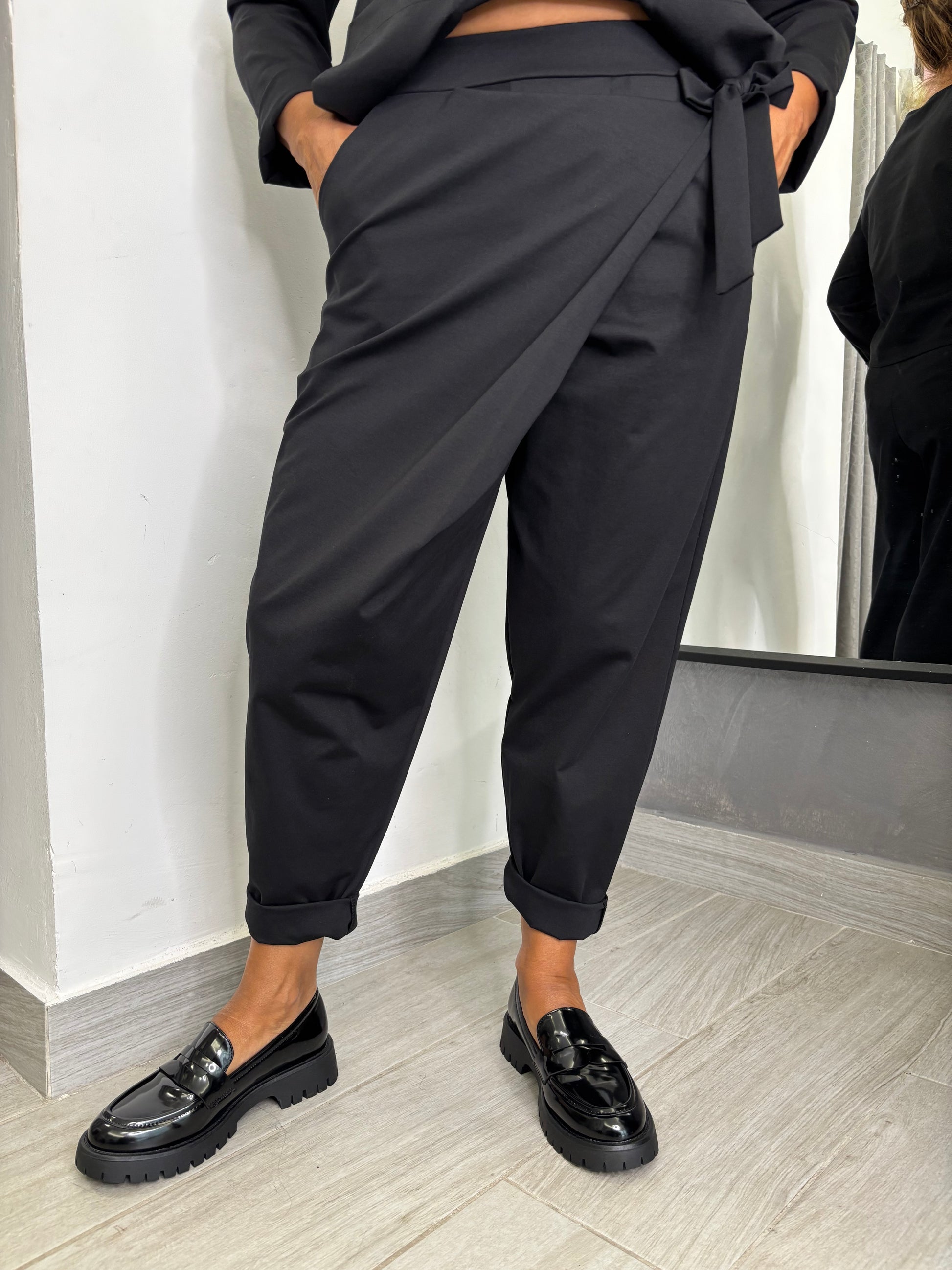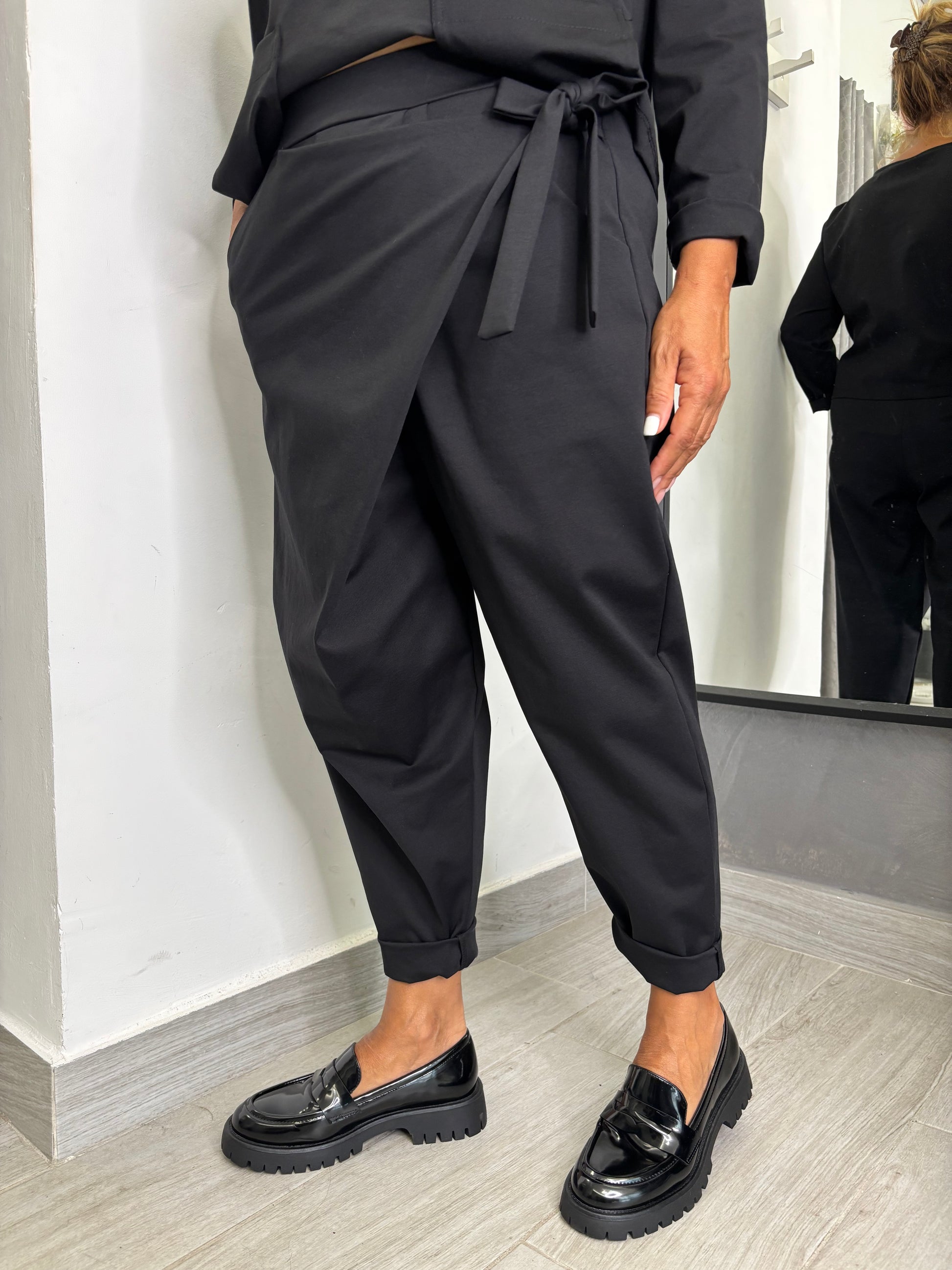 Pantalone con pareo fermato da un fiocco nella parte sinistra, elastico in vita, taglia unica veste fino ad una 46. Composizione 53% cotone 38% poliammide 9% elastan.
