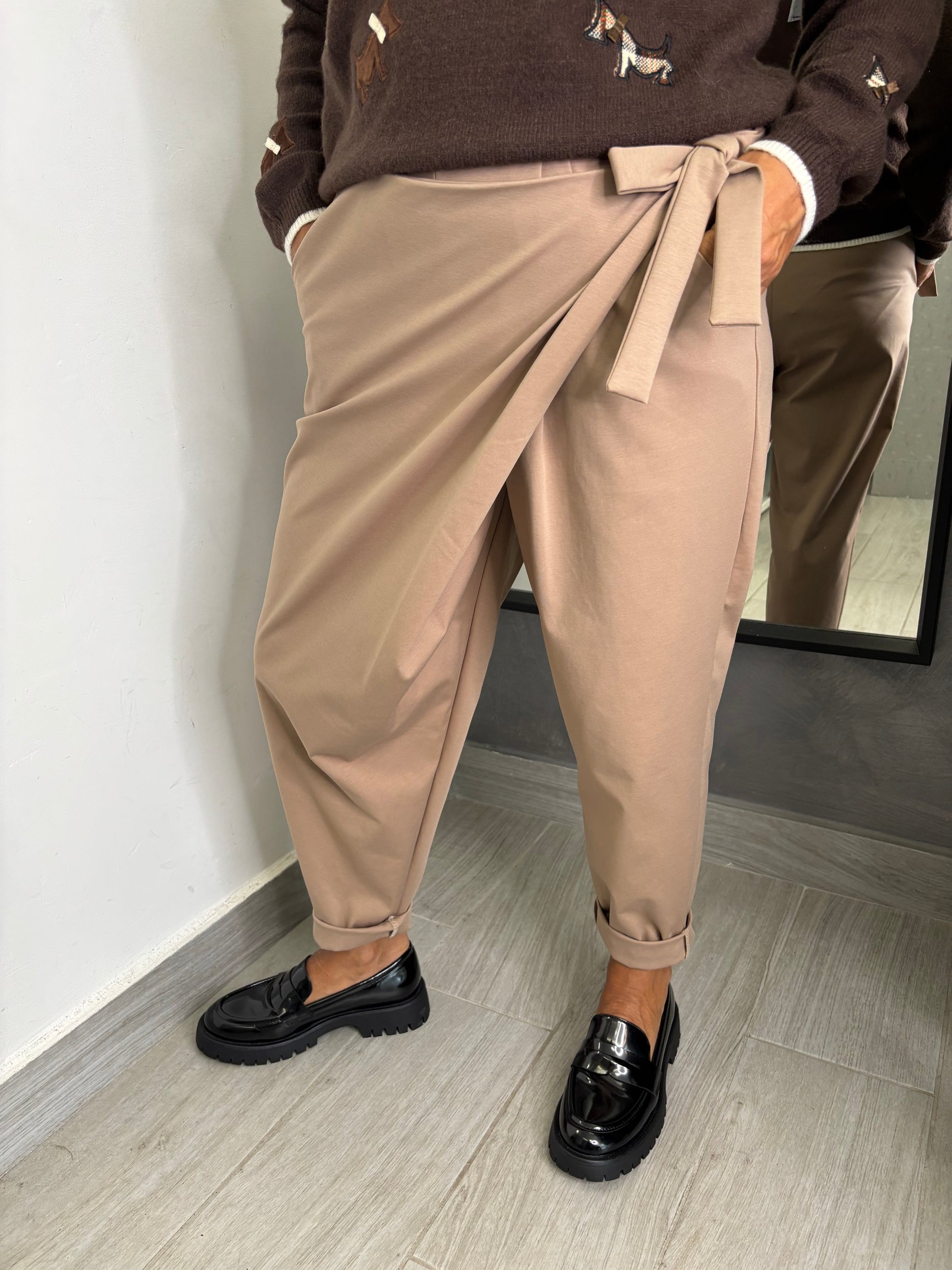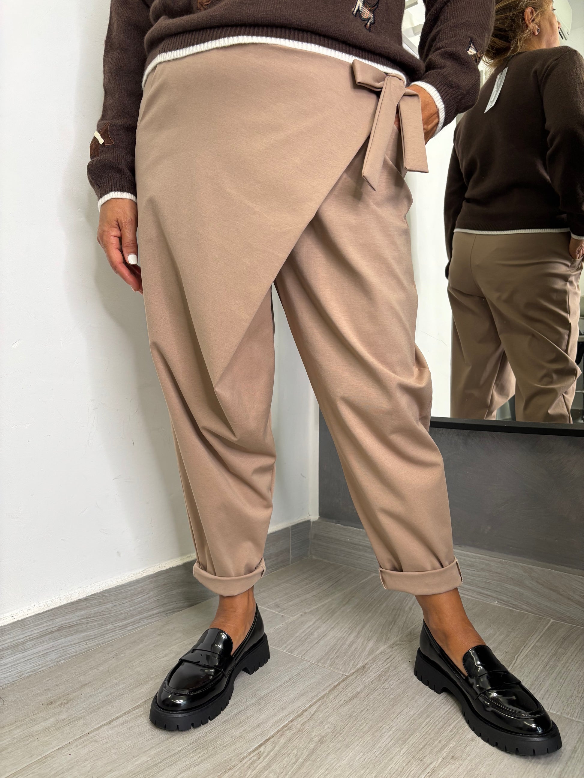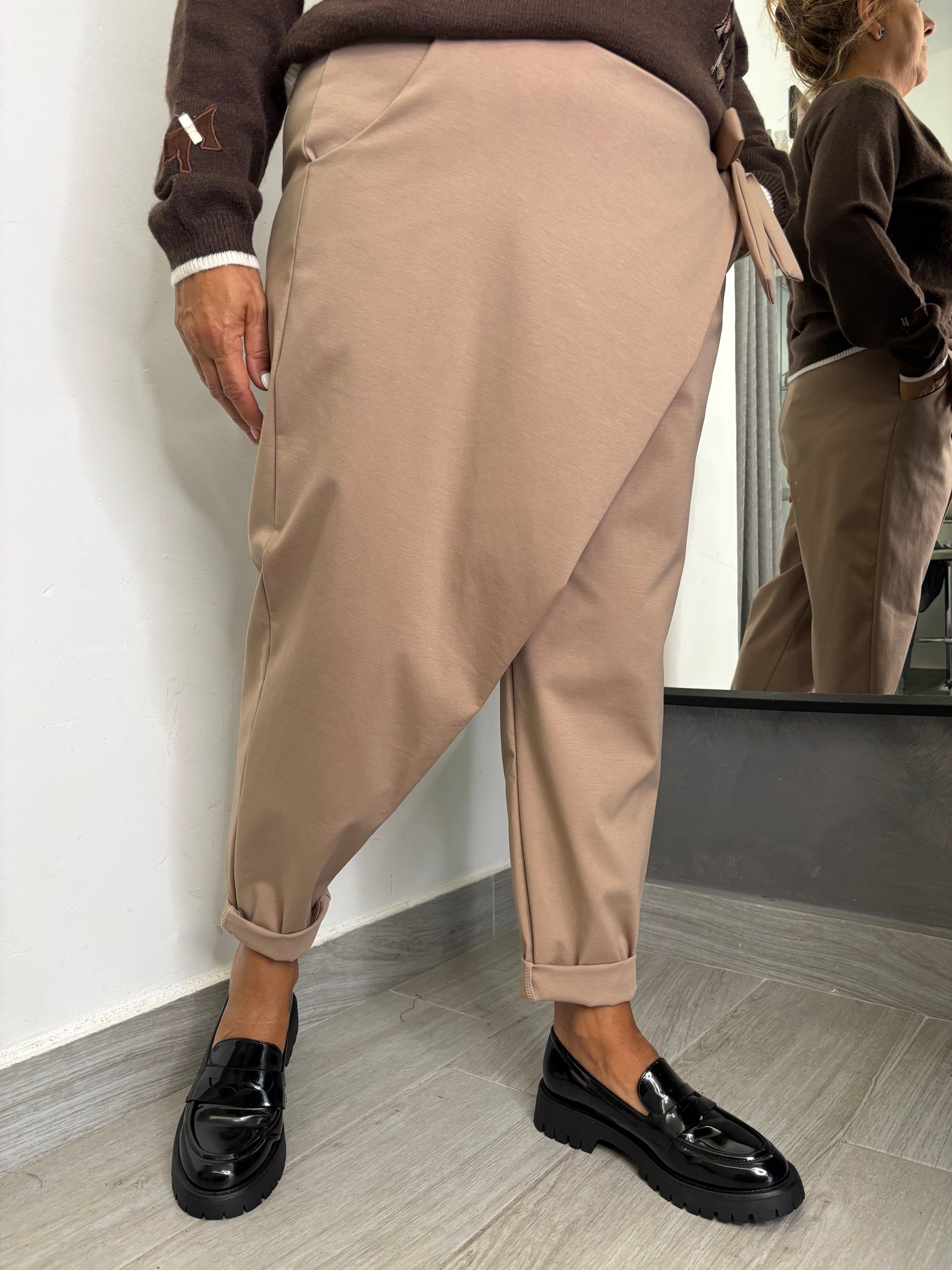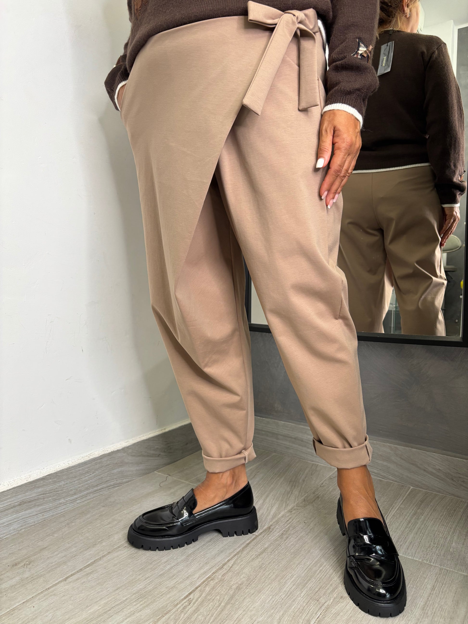 Pantalone con pareo fermato da un fiocco nella parte sinistra, elastico in vita, taglia unica veste fino ad una 46. Composizione 53% cotone 38% poliammide 9% elastan.